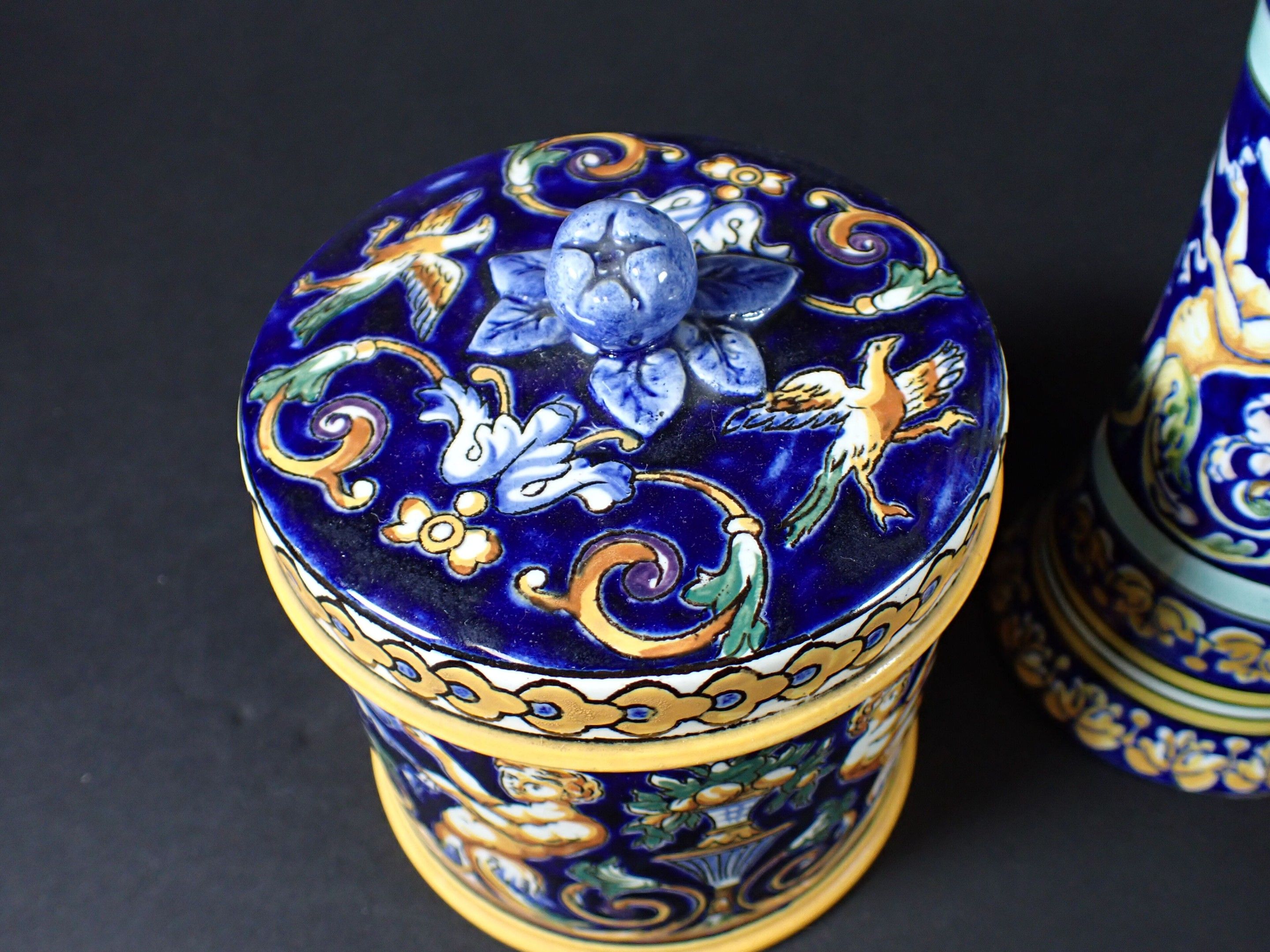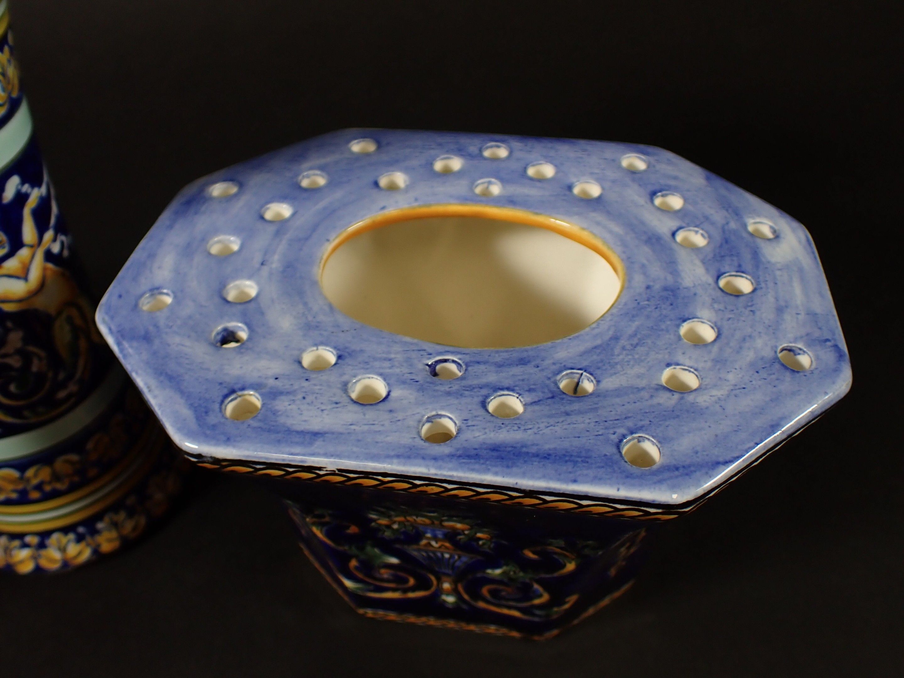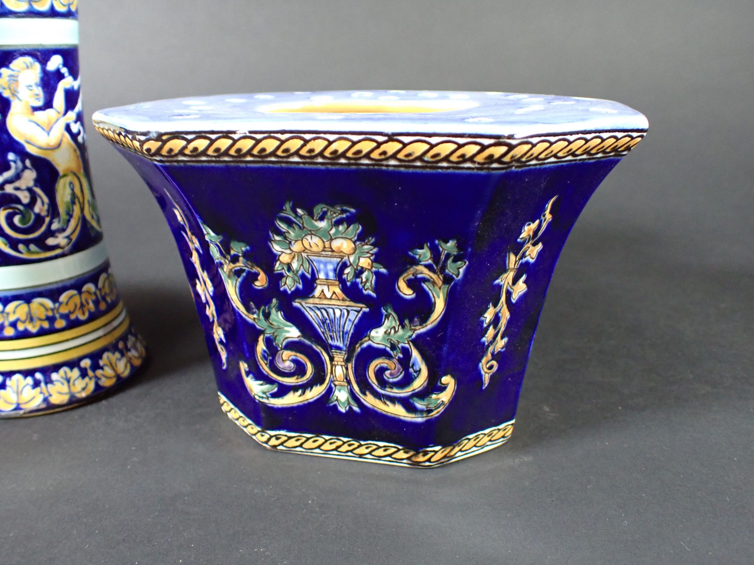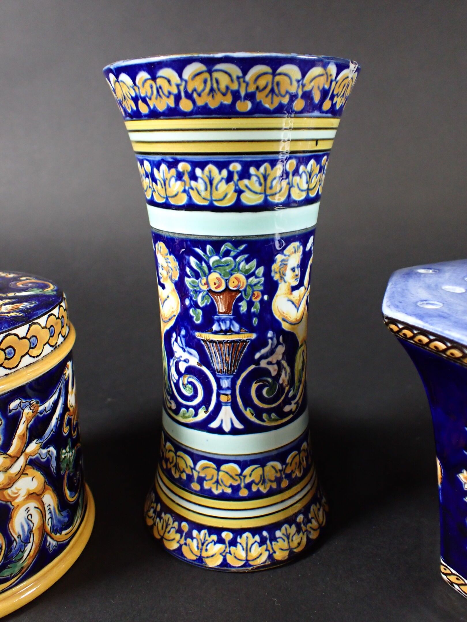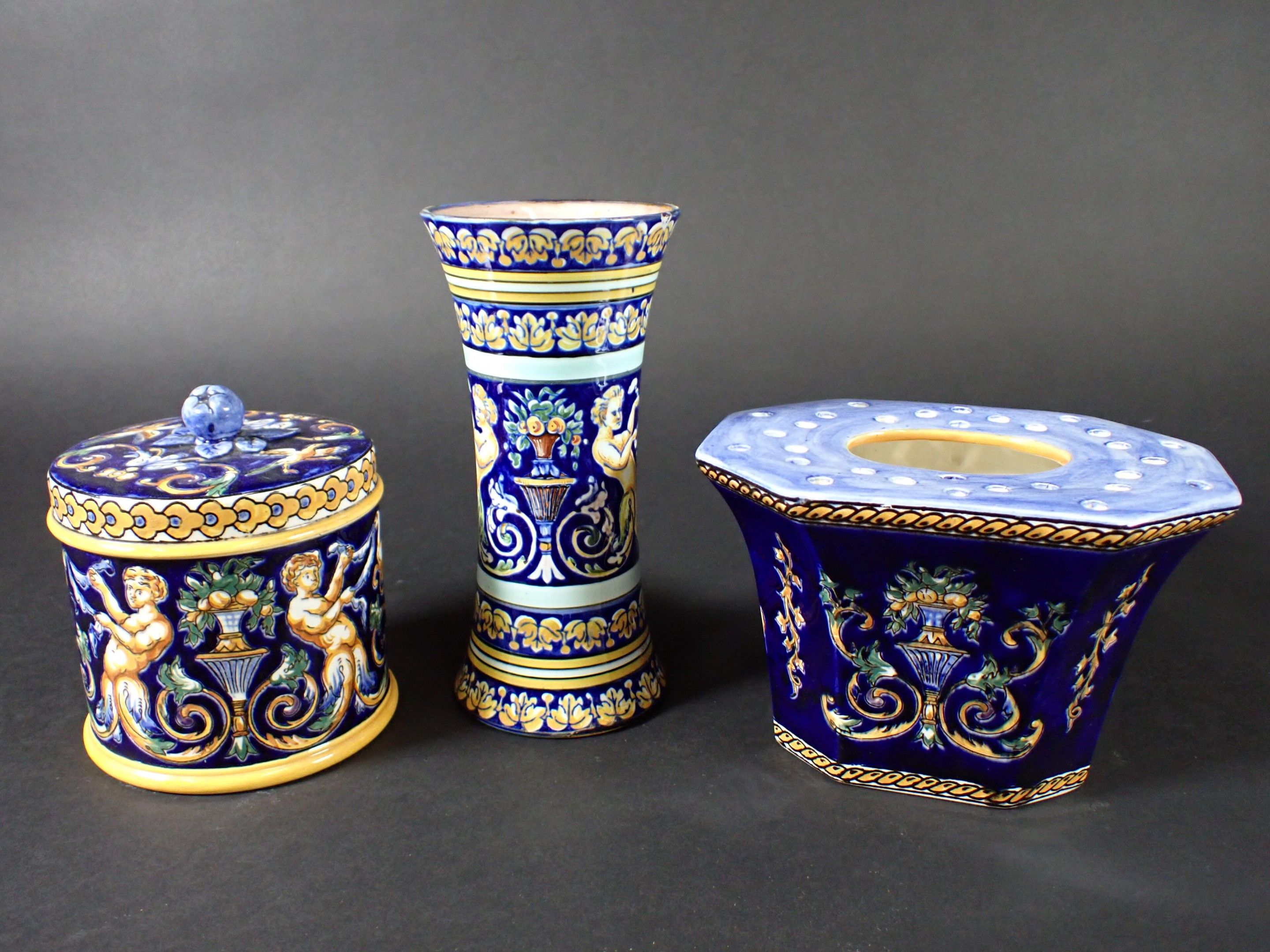 GIEN. Small diabolo vase, covered pot, flowerpick in earthenware decorated in the Renaissance style. Height 17 - 11 - 12cm