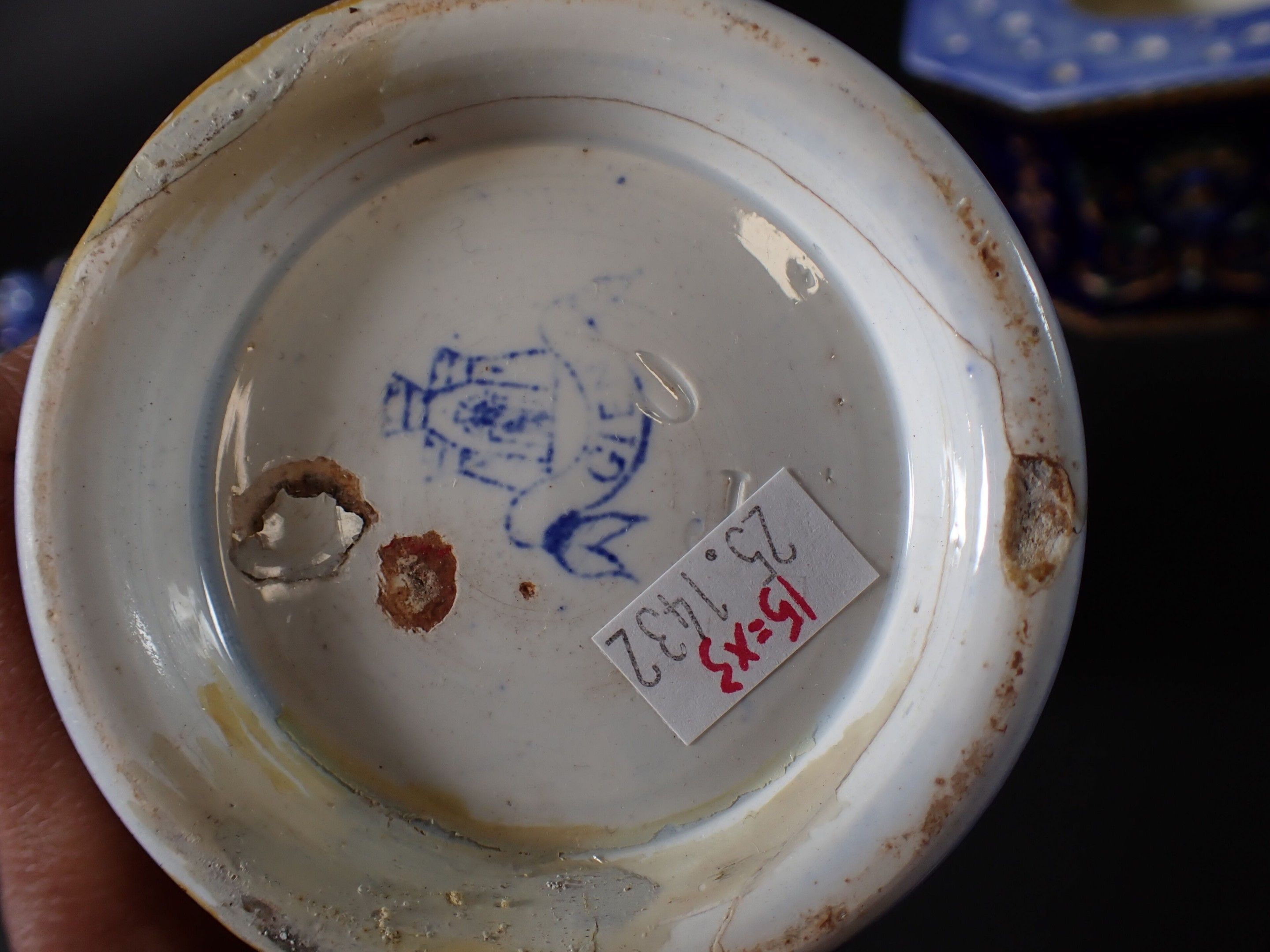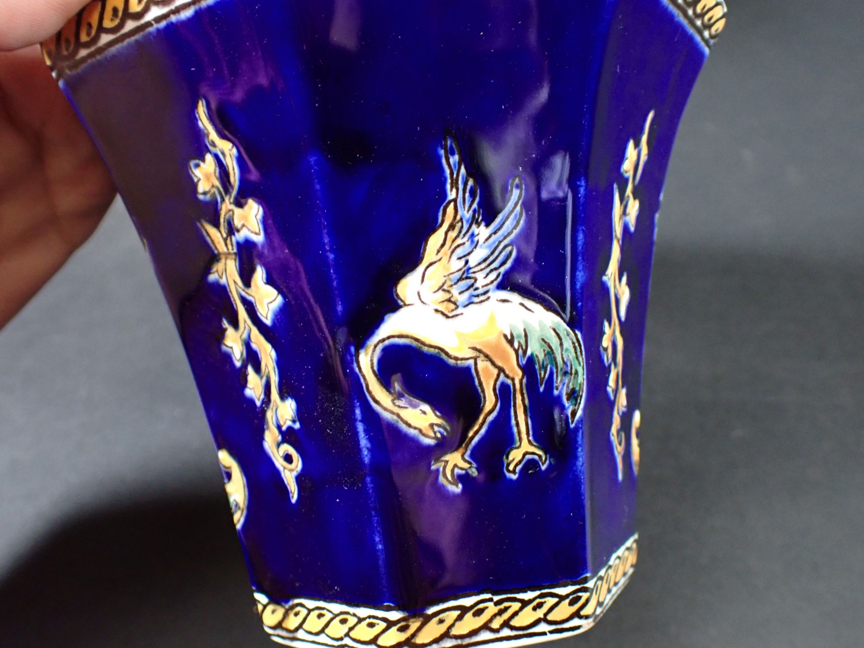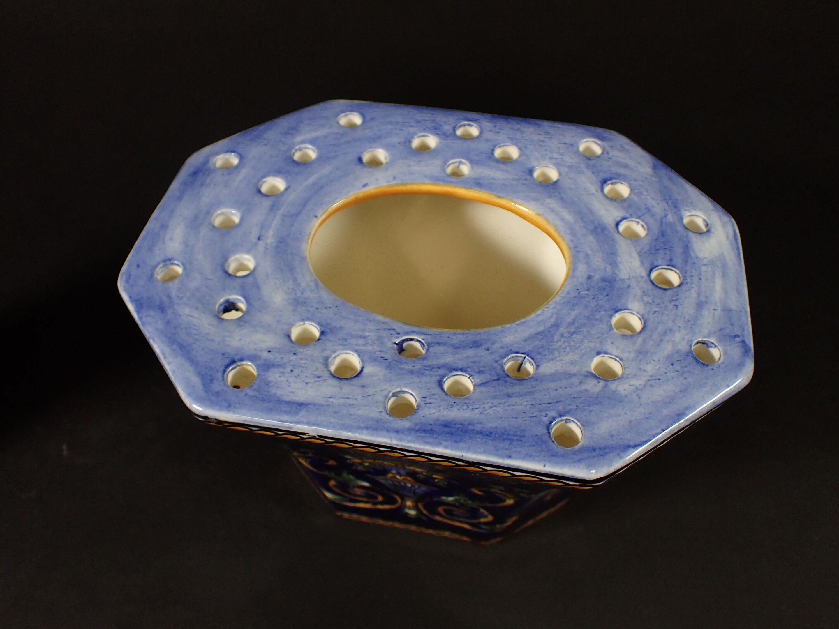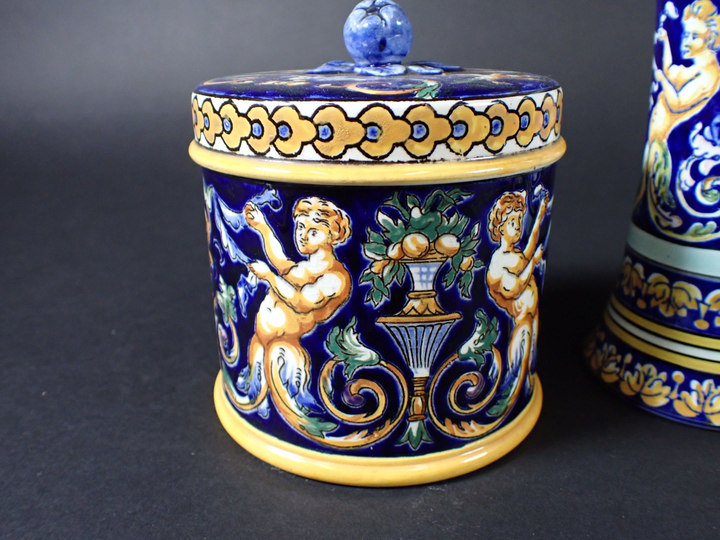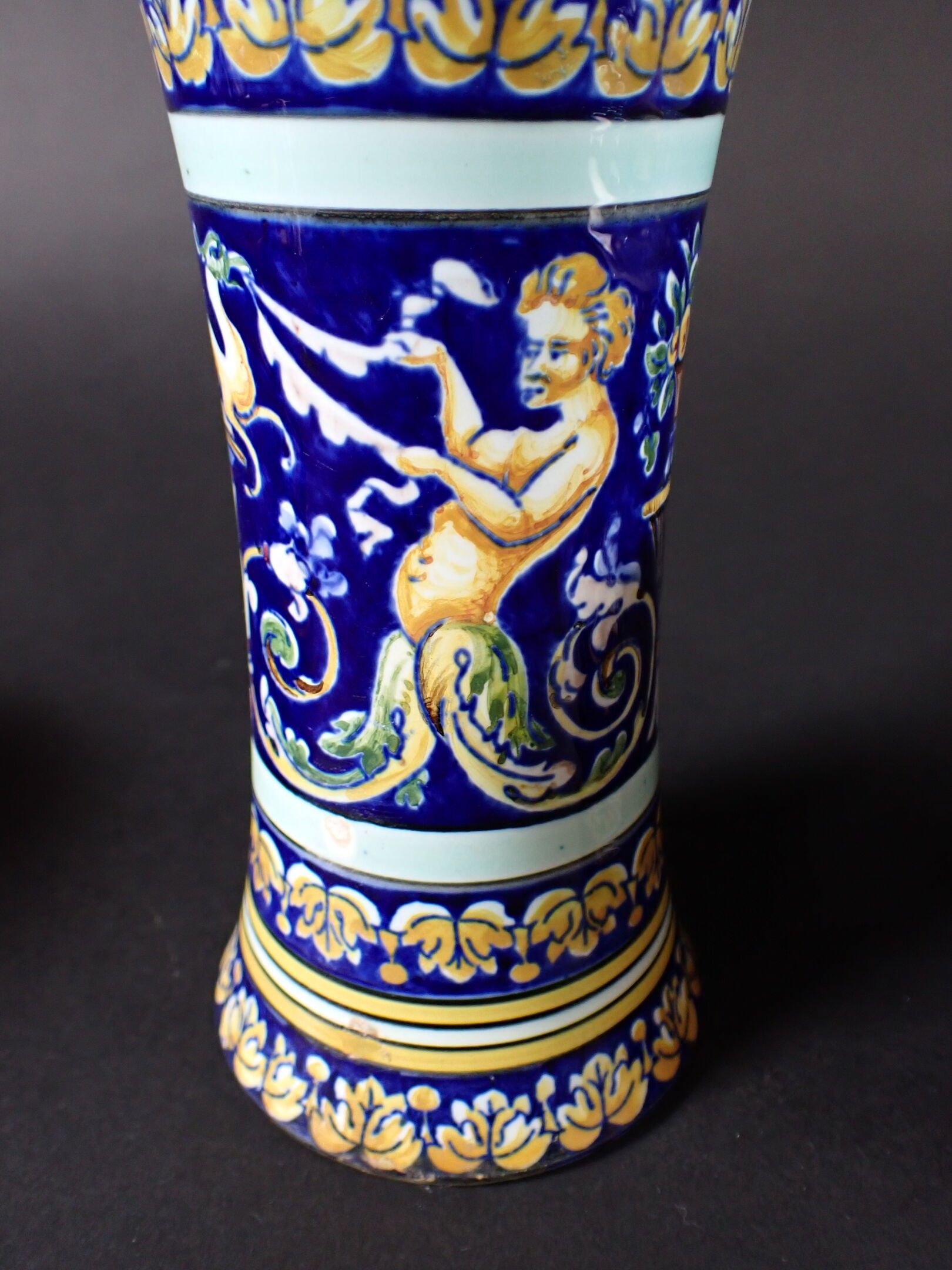 GIEN. Small diabolo vase, covered pot, flowerpick in earthenware decorated in the Renaissance style. Height 17 - 11 - 12cm