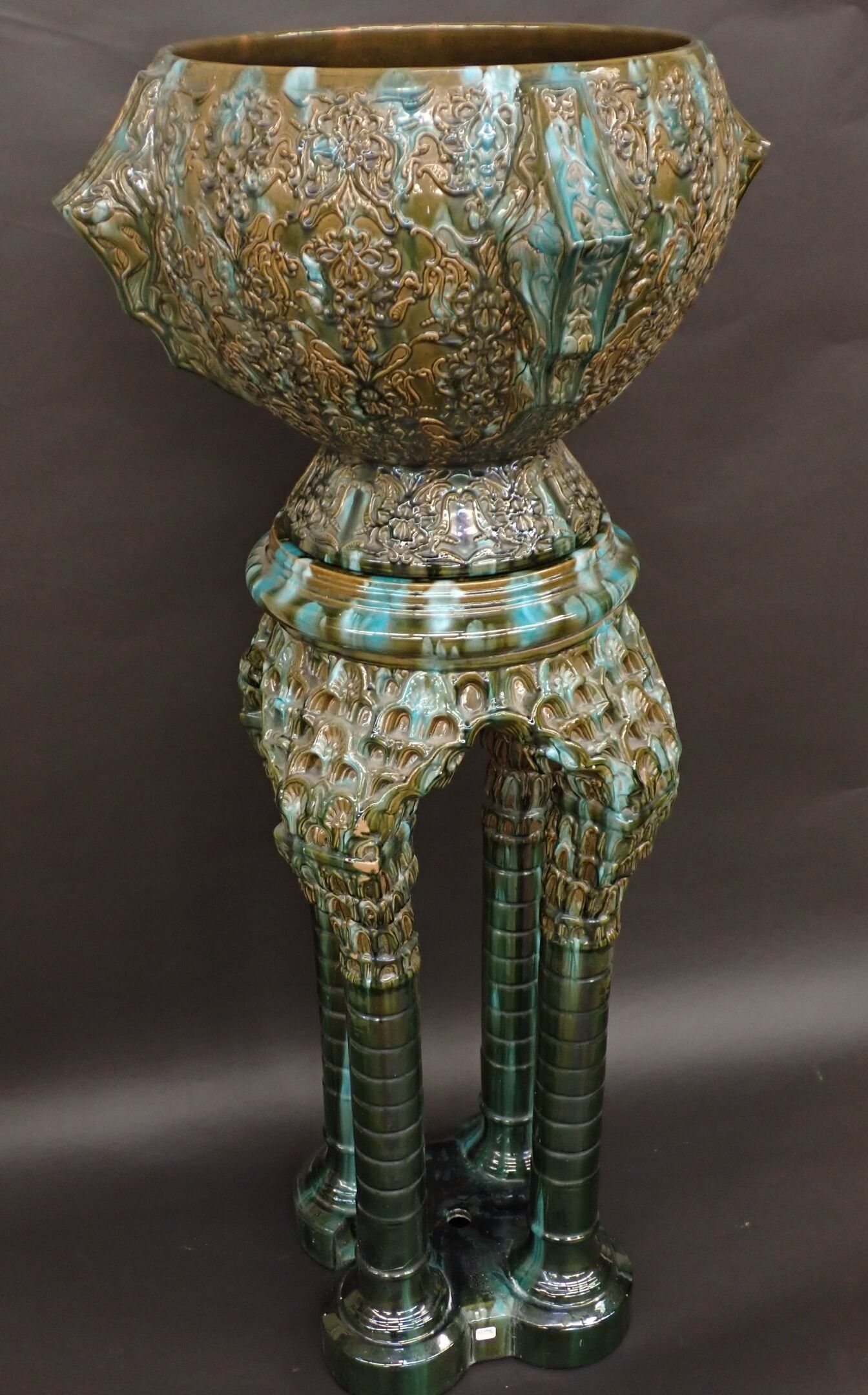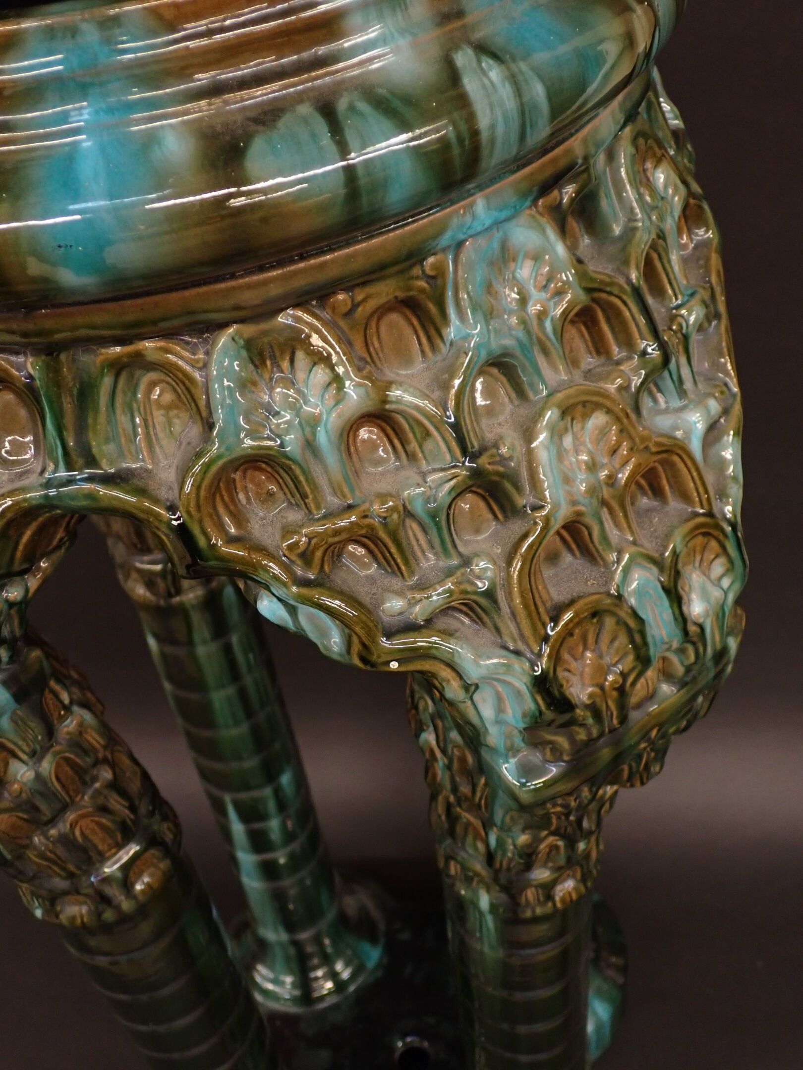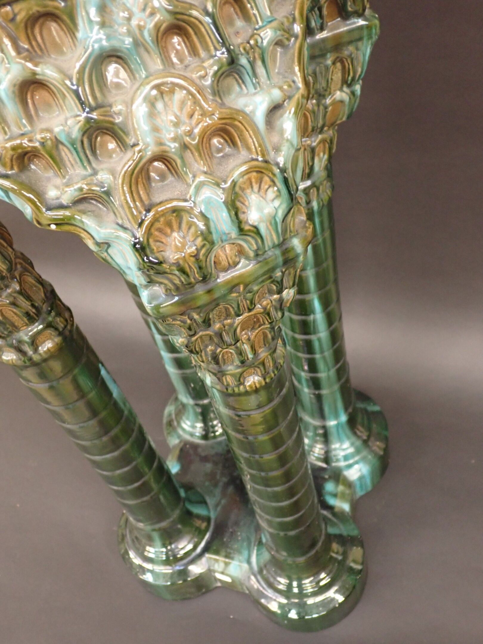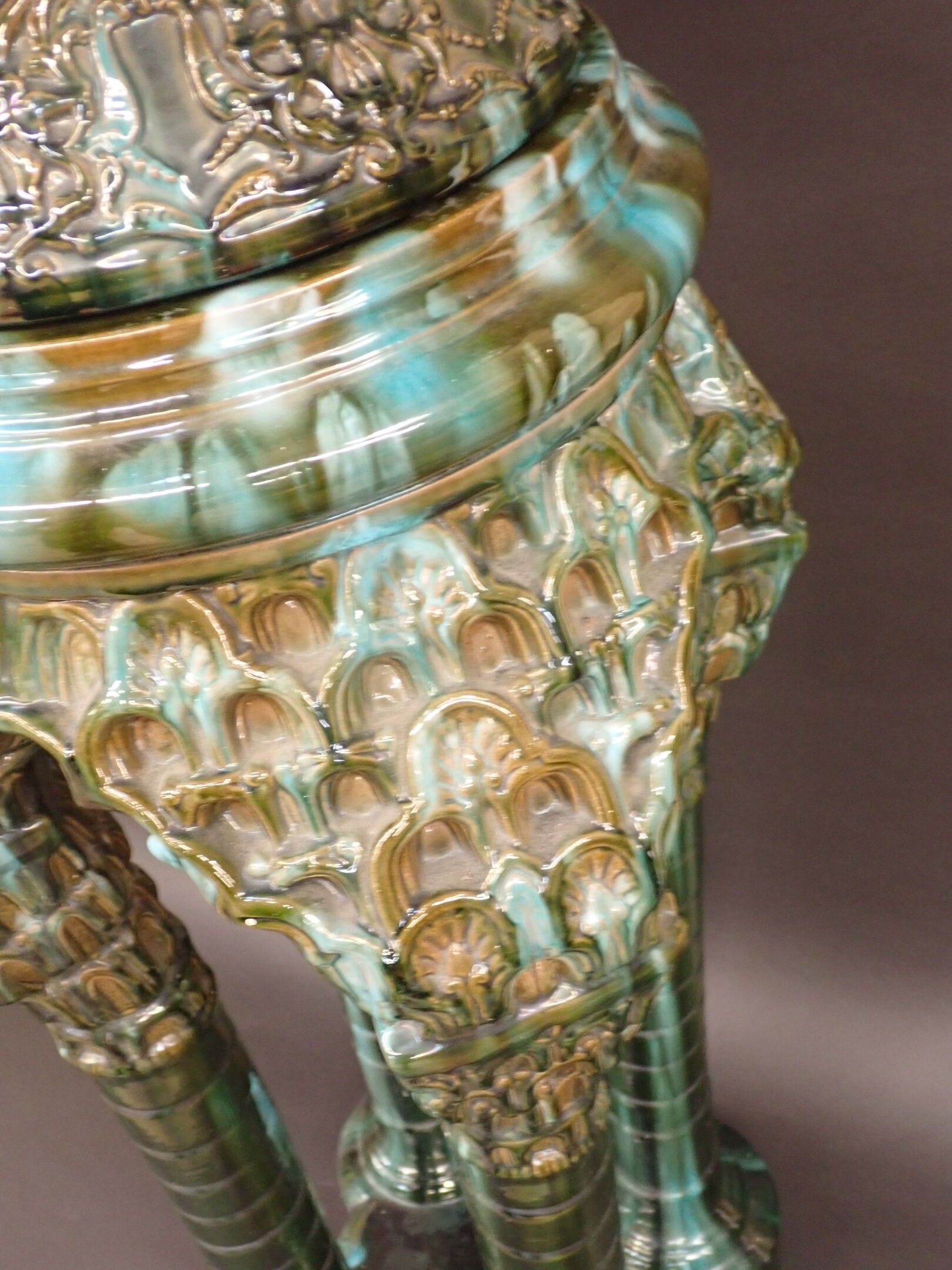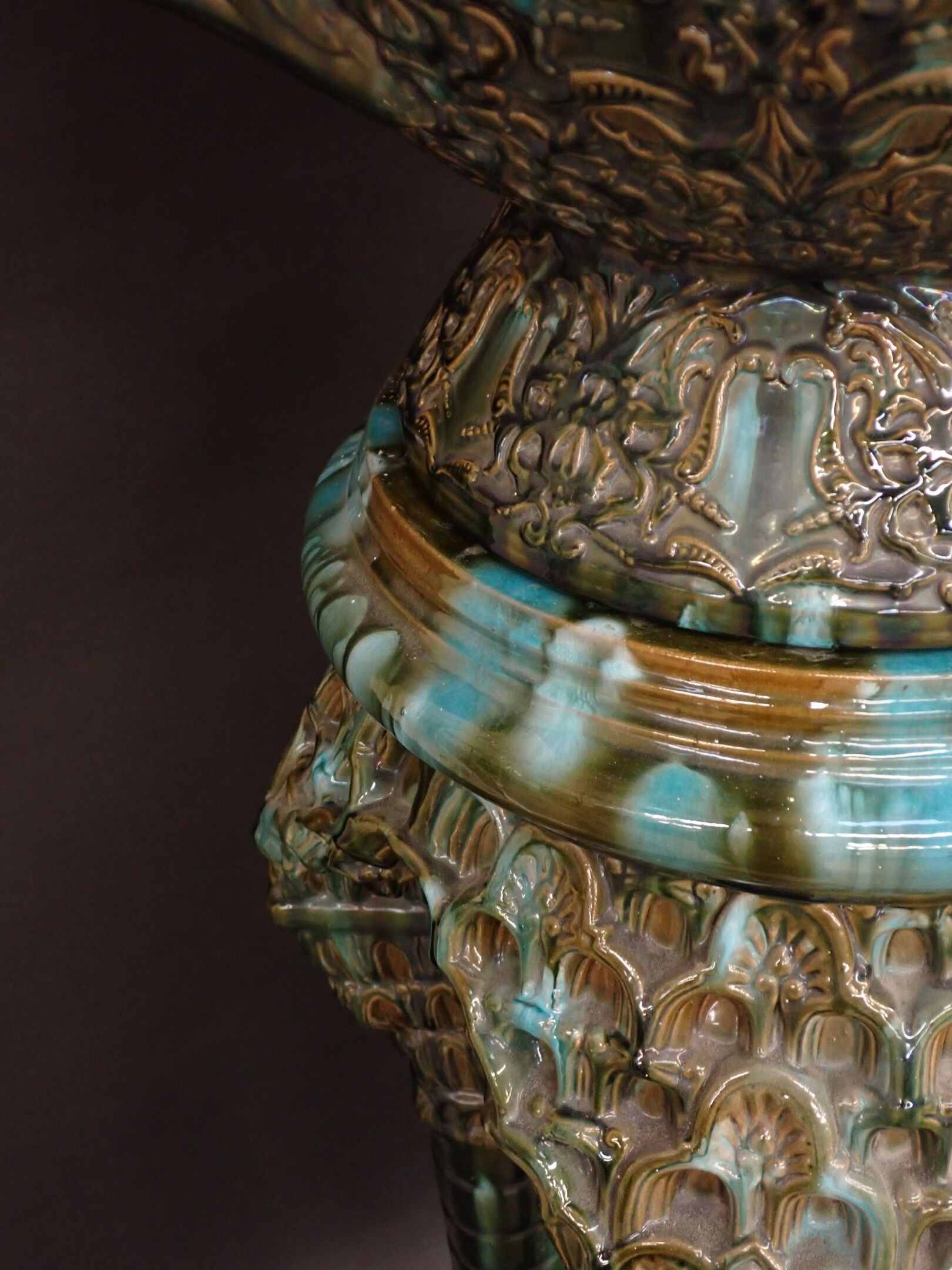 CLÉMENT MASSIER (1845-1917). Alhambra, N°339 and N°340. Rare and spectacular complete with a four-columned bass and a four-finned cache-pot. Polychrome glazed ceramic proofs with rich iridescent effects; oriental motifs in relief on both parts. The cachepot and the column are each marked with an oval Clément MASSIER Golfe-Juan stamp under the base. Total height: 135 cm.