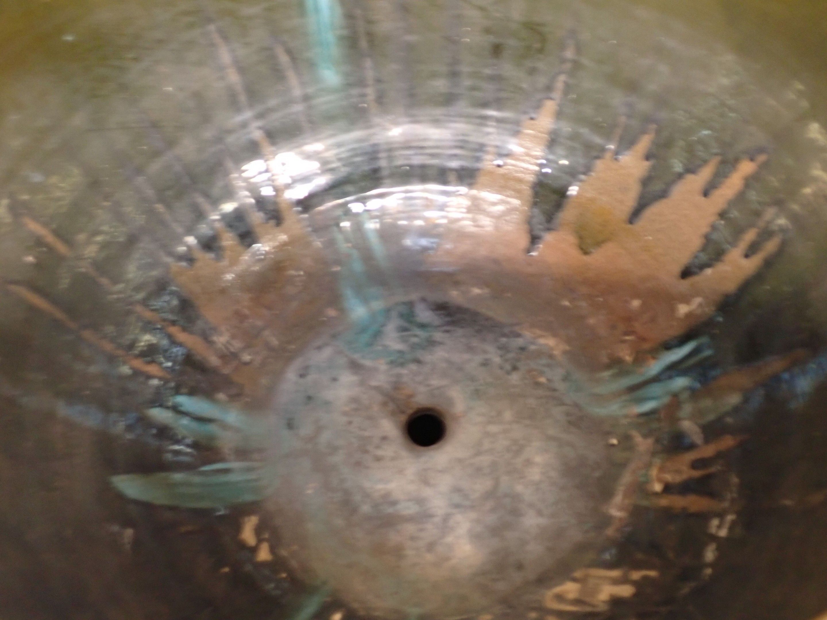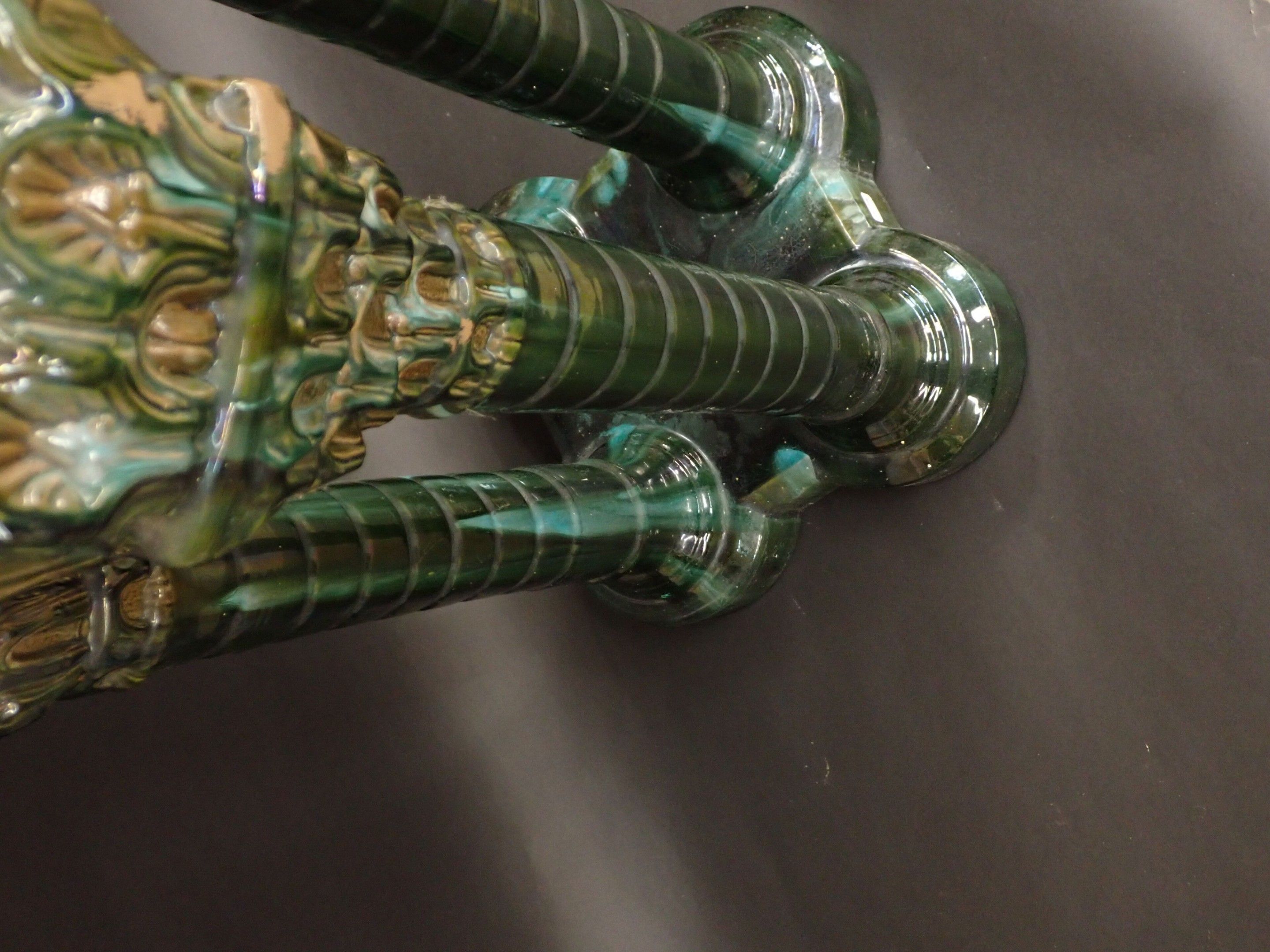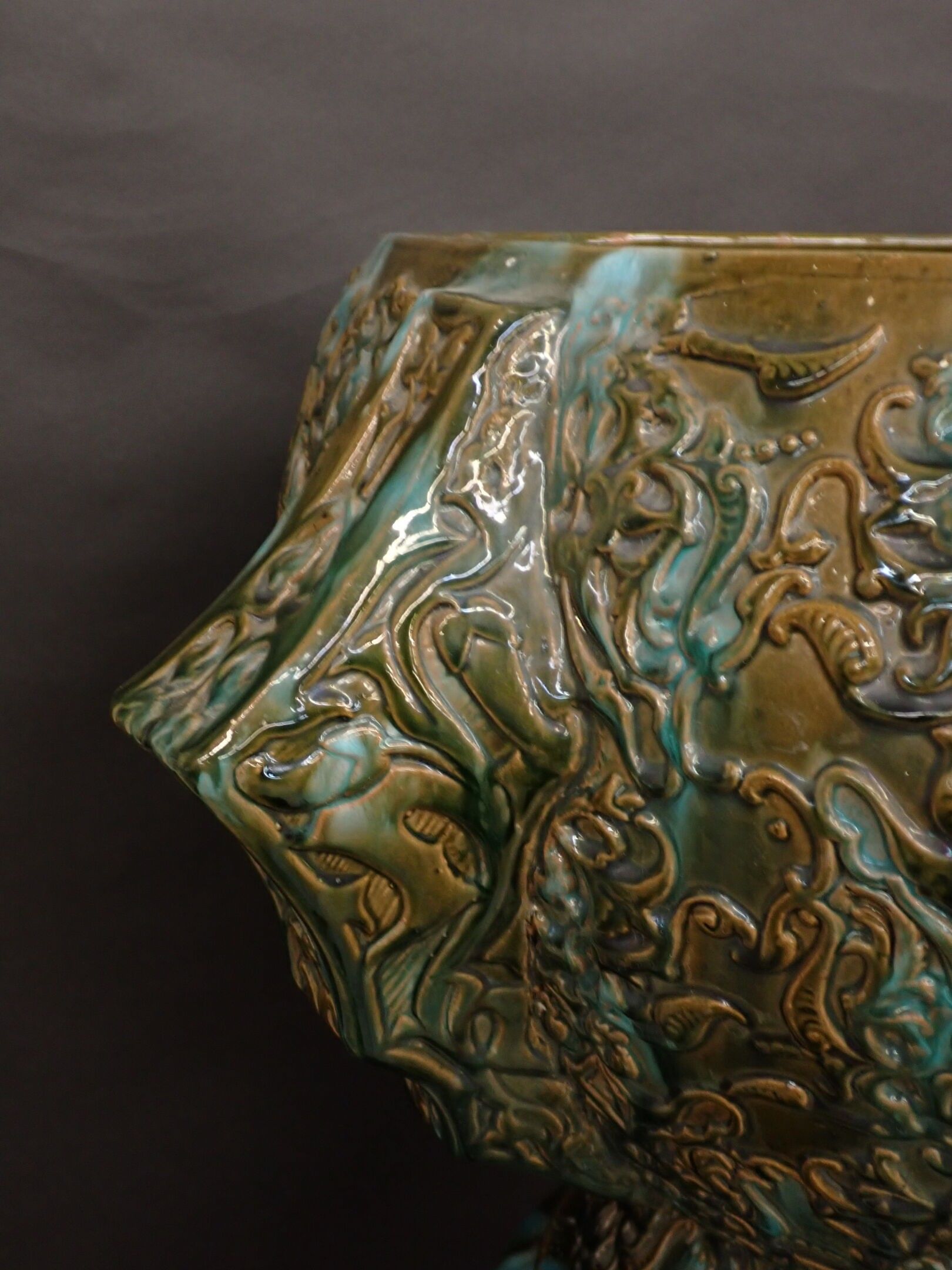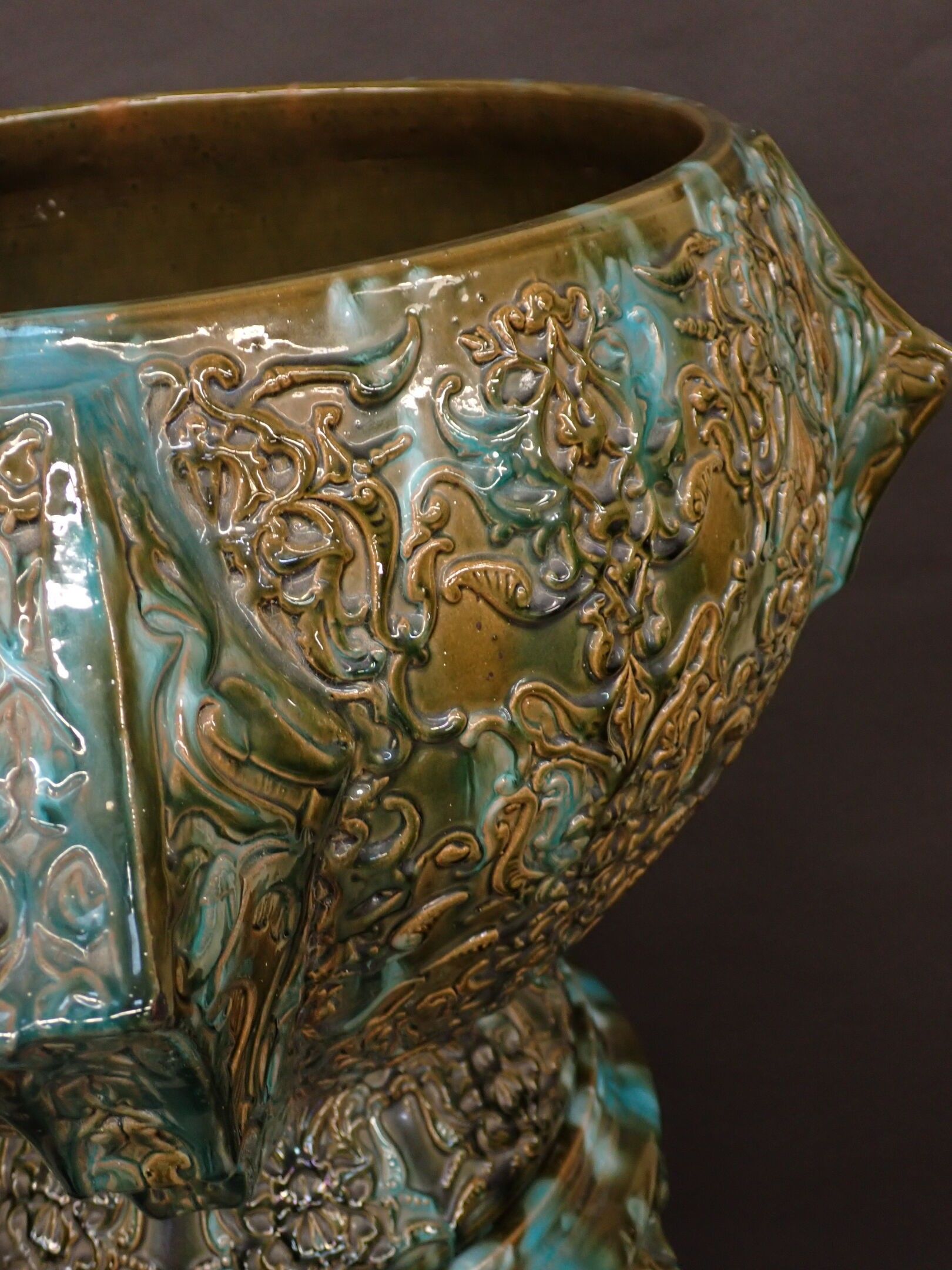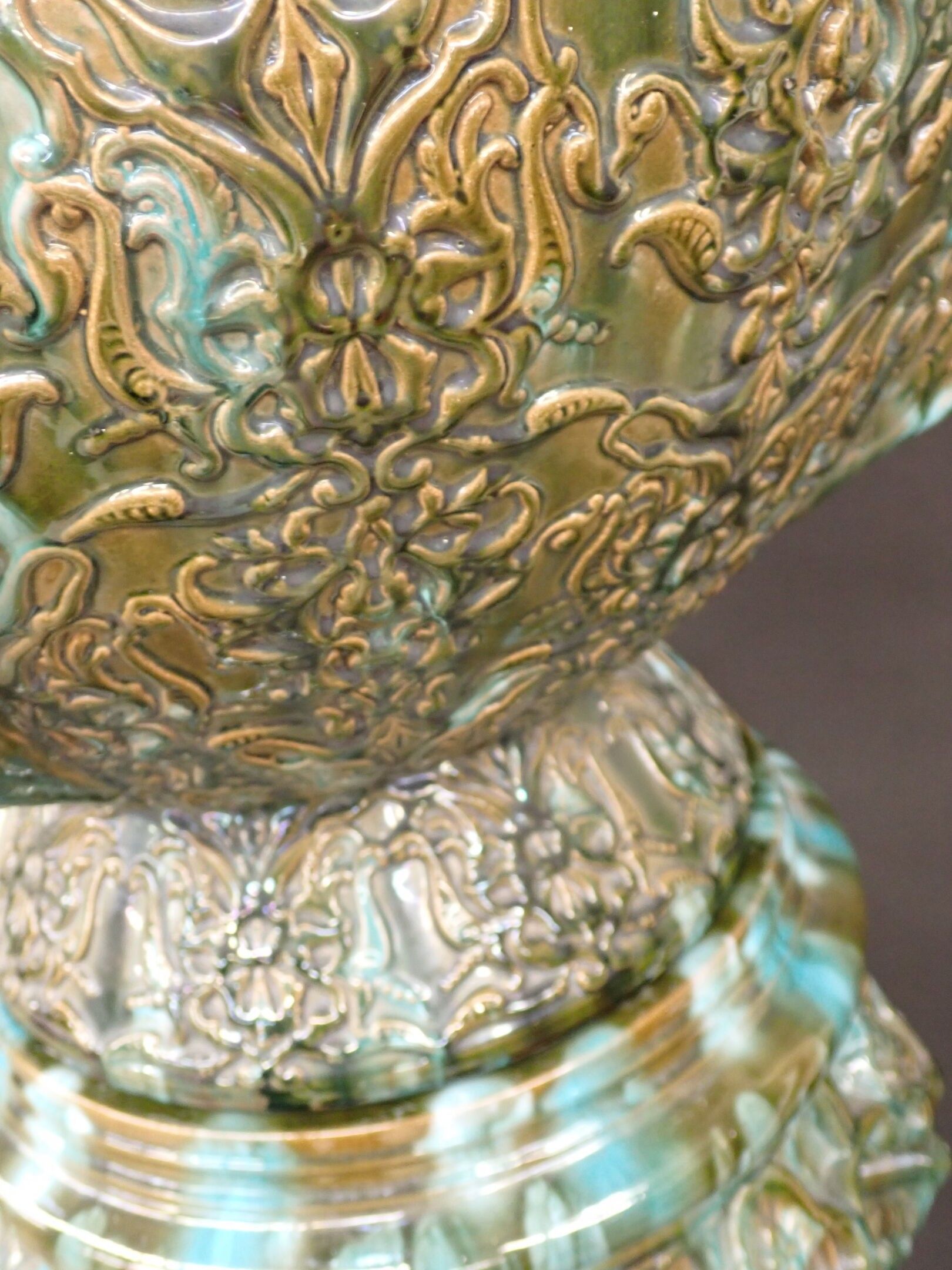 CLÉMENT MASSIER (1845-1917). Alhambra, N°339 and N°340. Rare and spectacular complete with a four-columned bass and a four-finned cache-pot. Polychrome glazed ceramic proofs with rich iridescent effects; oriental motifs in relief on both parts. The cachepot and the column are each marked with an oval Clément MASSIER Golfe-Juan stamp under the base. Total height: 135 cm.