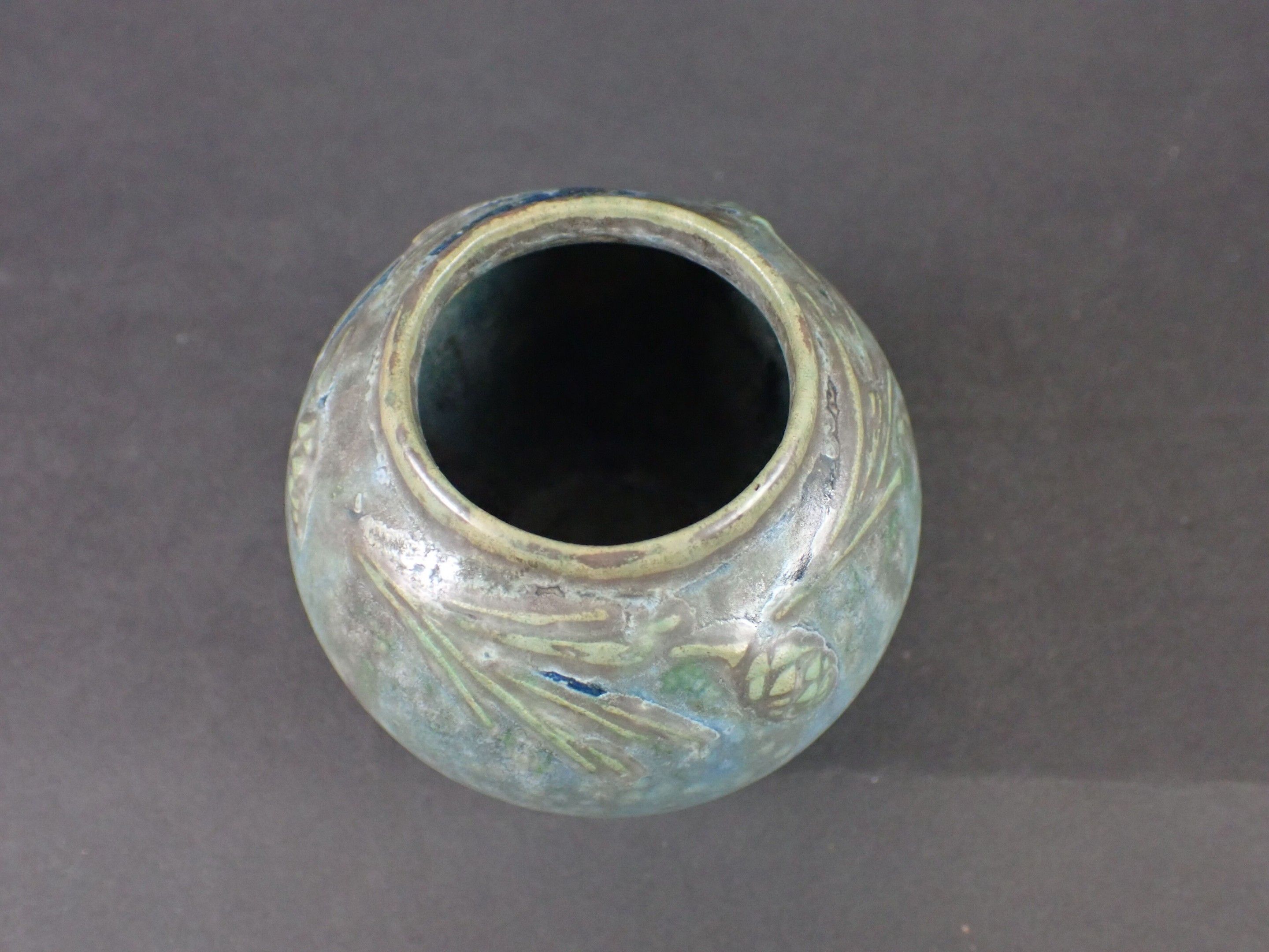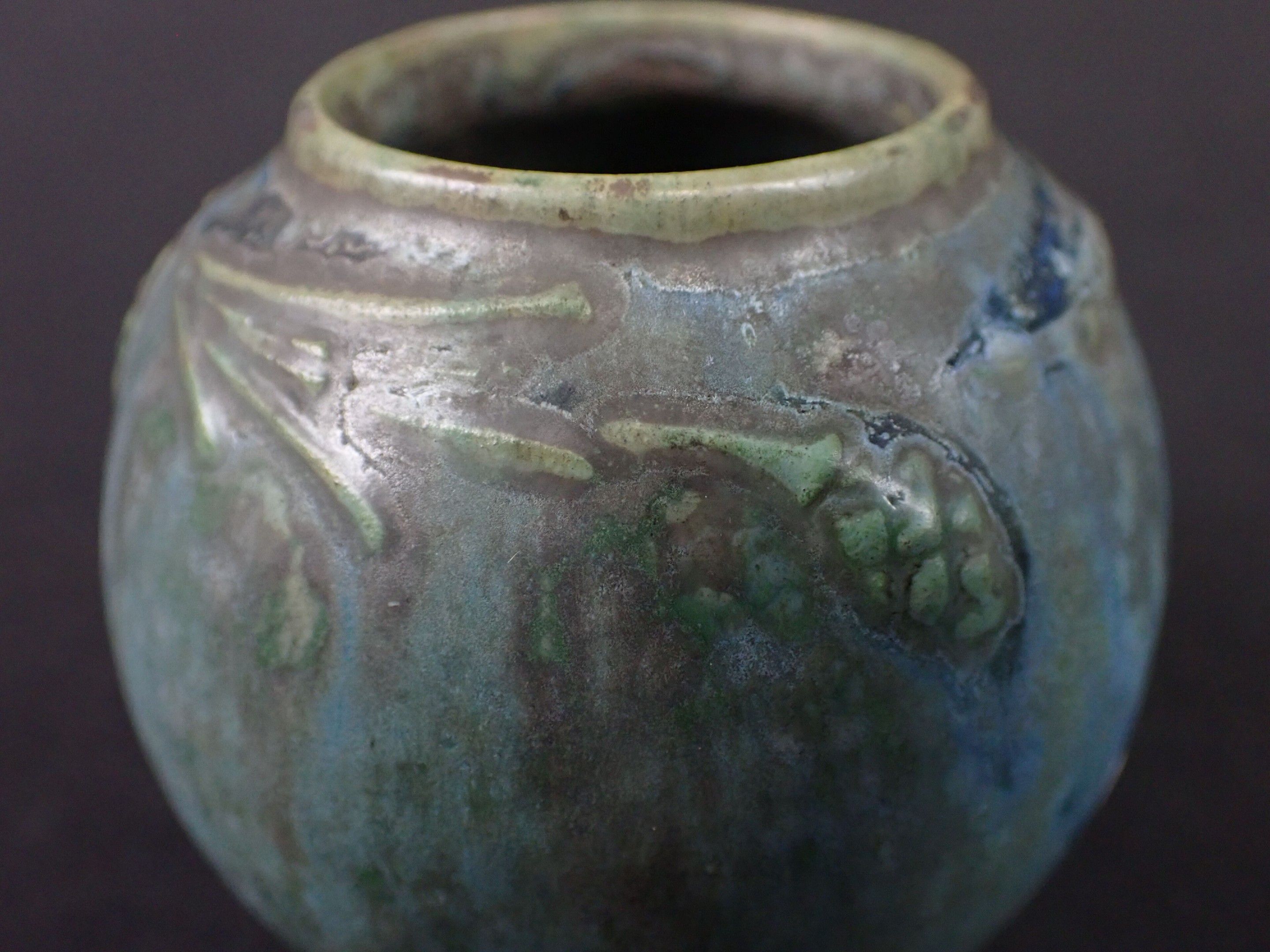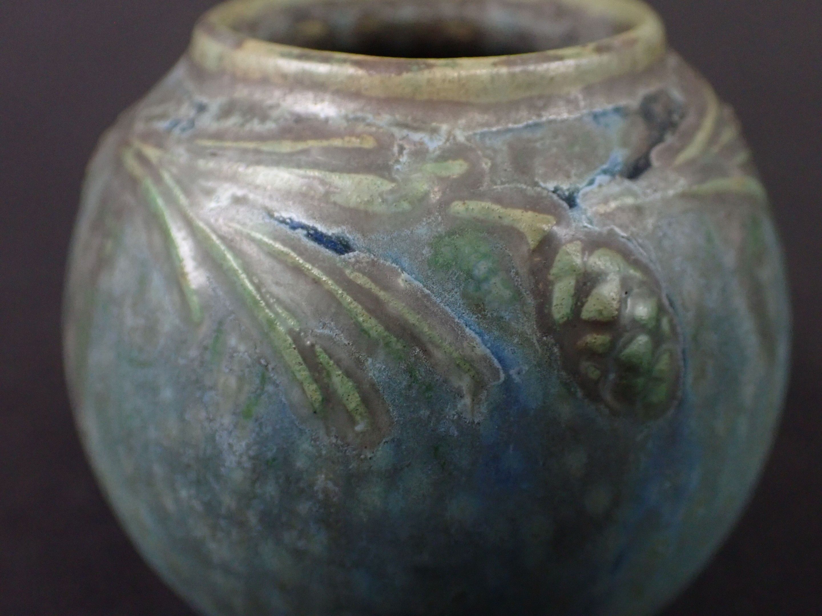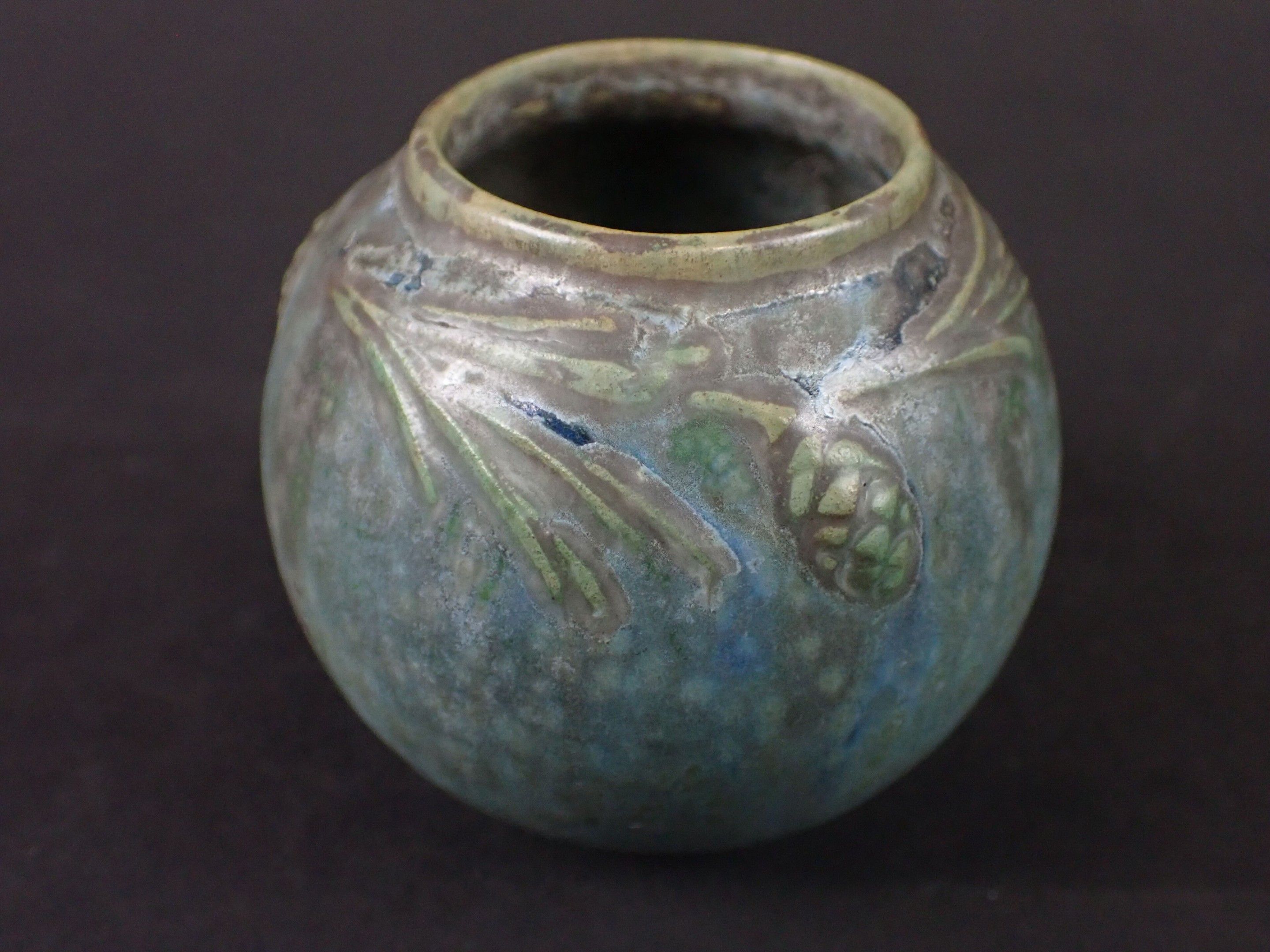 Small ball vase decorated with pine cones; signed below; four pieces; N°142. Height 6 cm