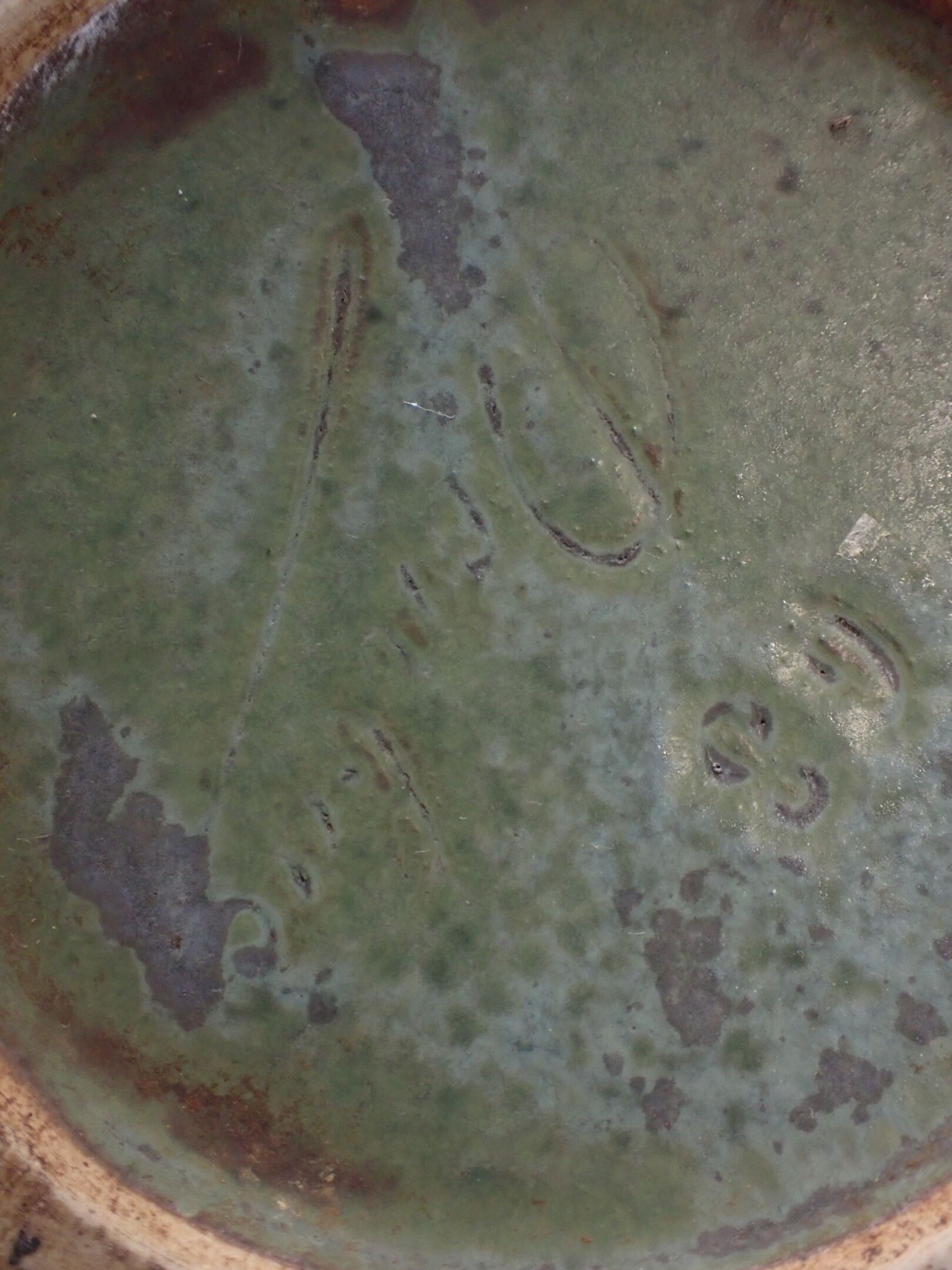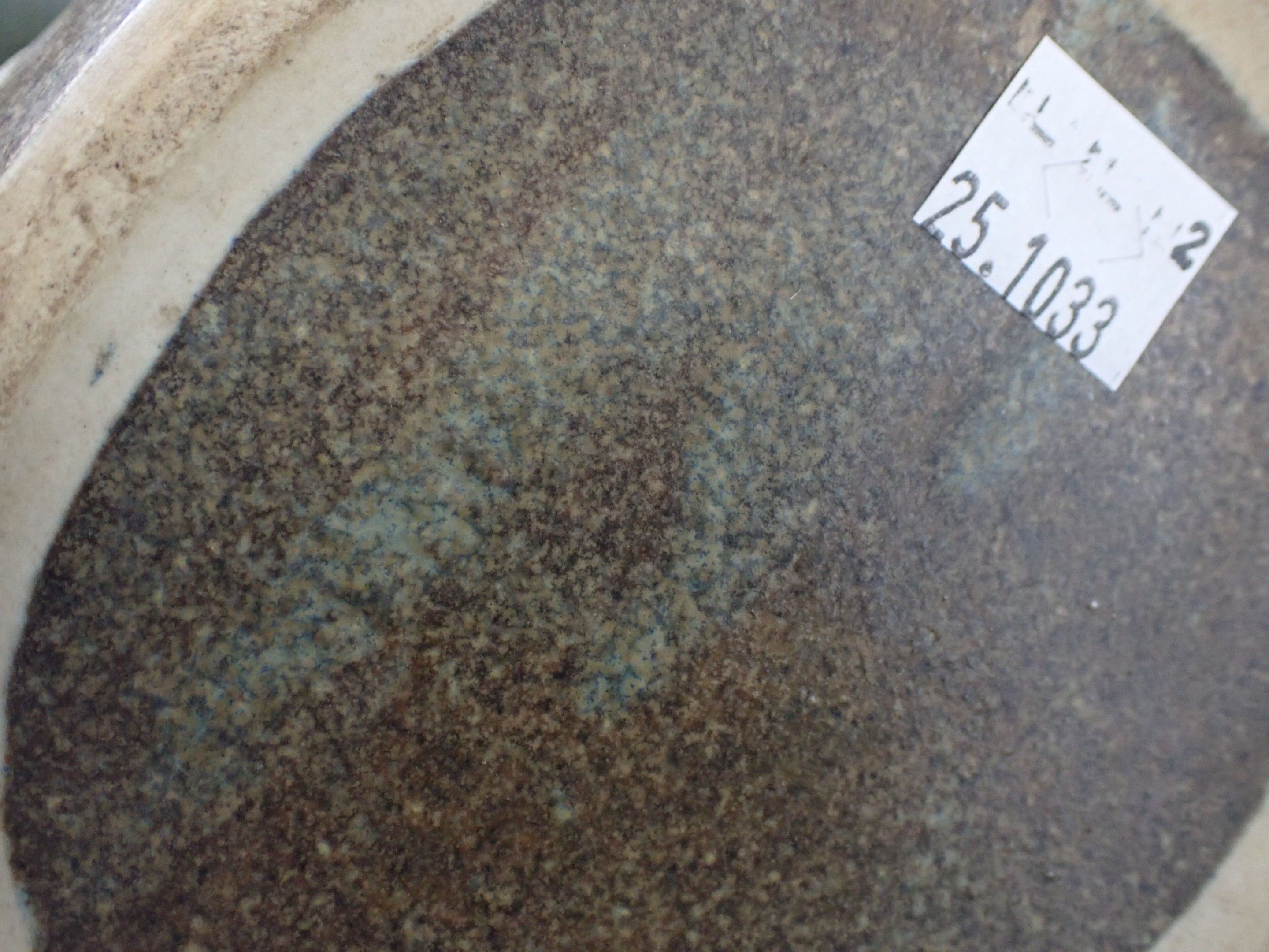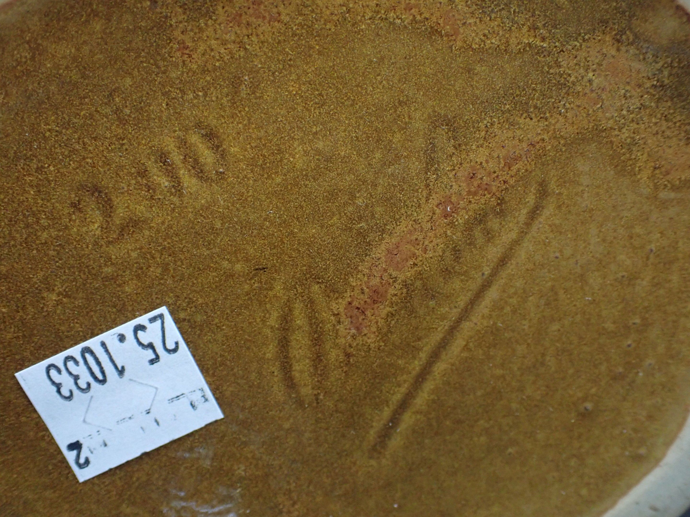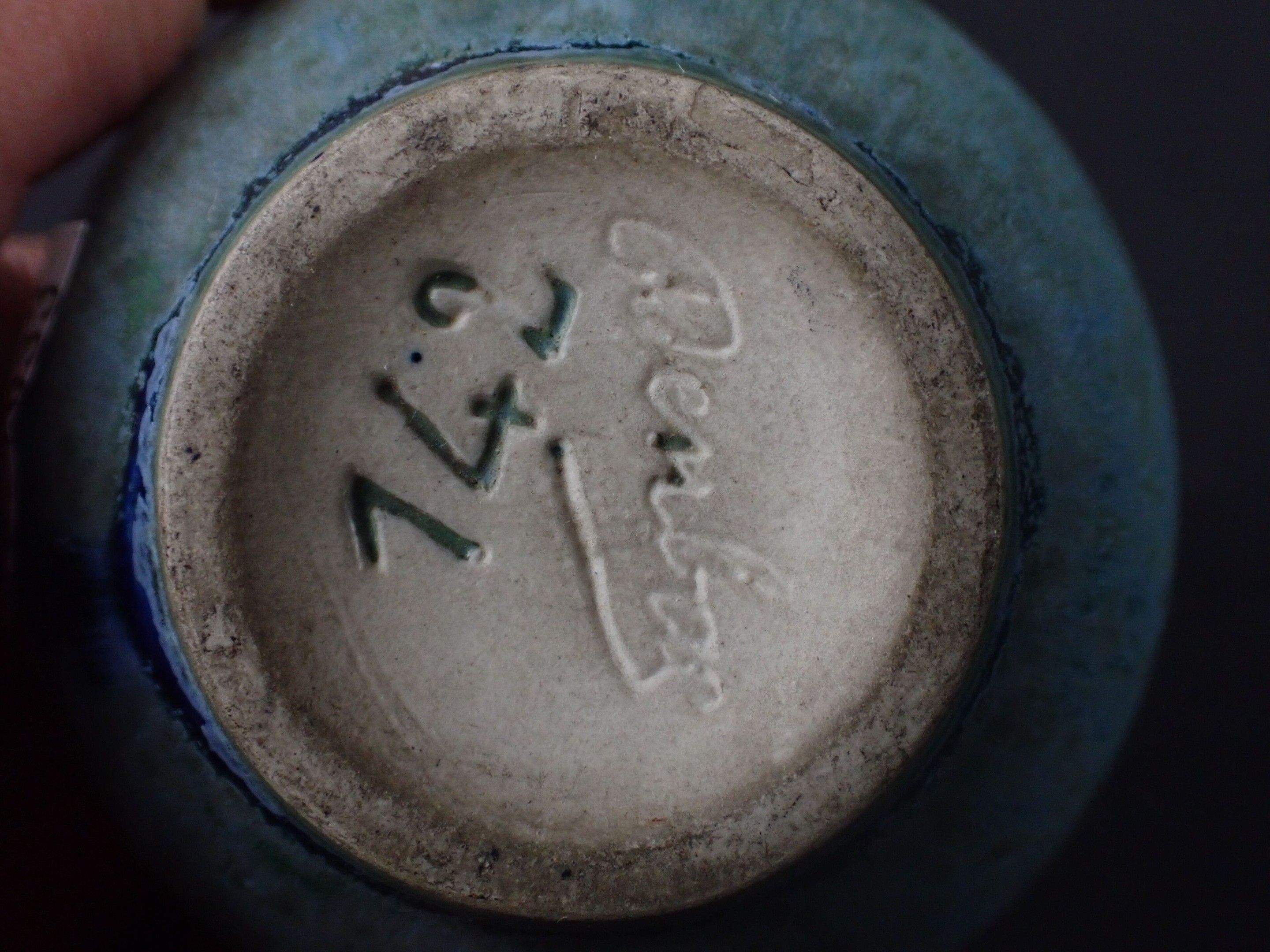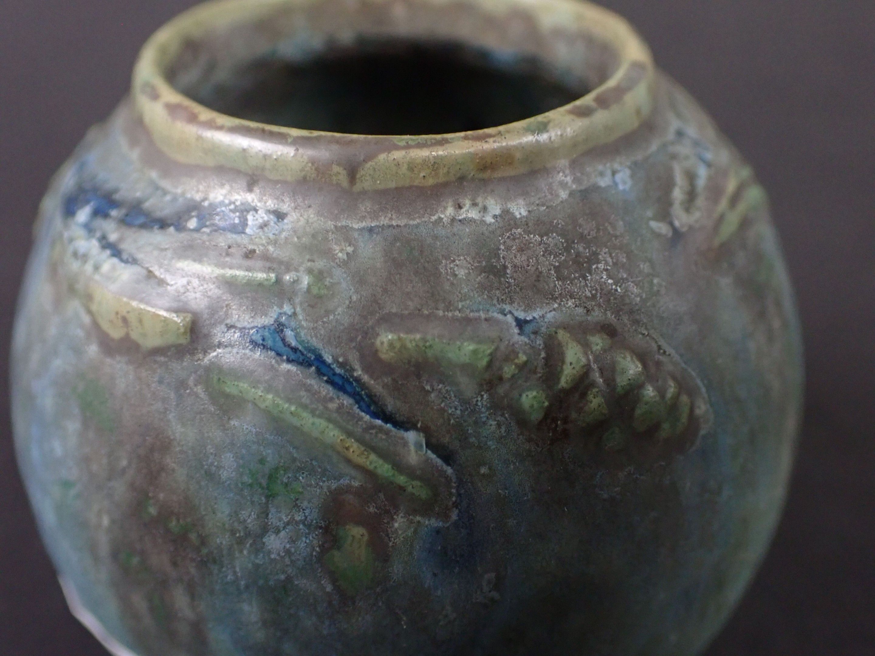 Small ball vase decorated with pine cones; signed below; four pieces; N°142. Height 6 cm