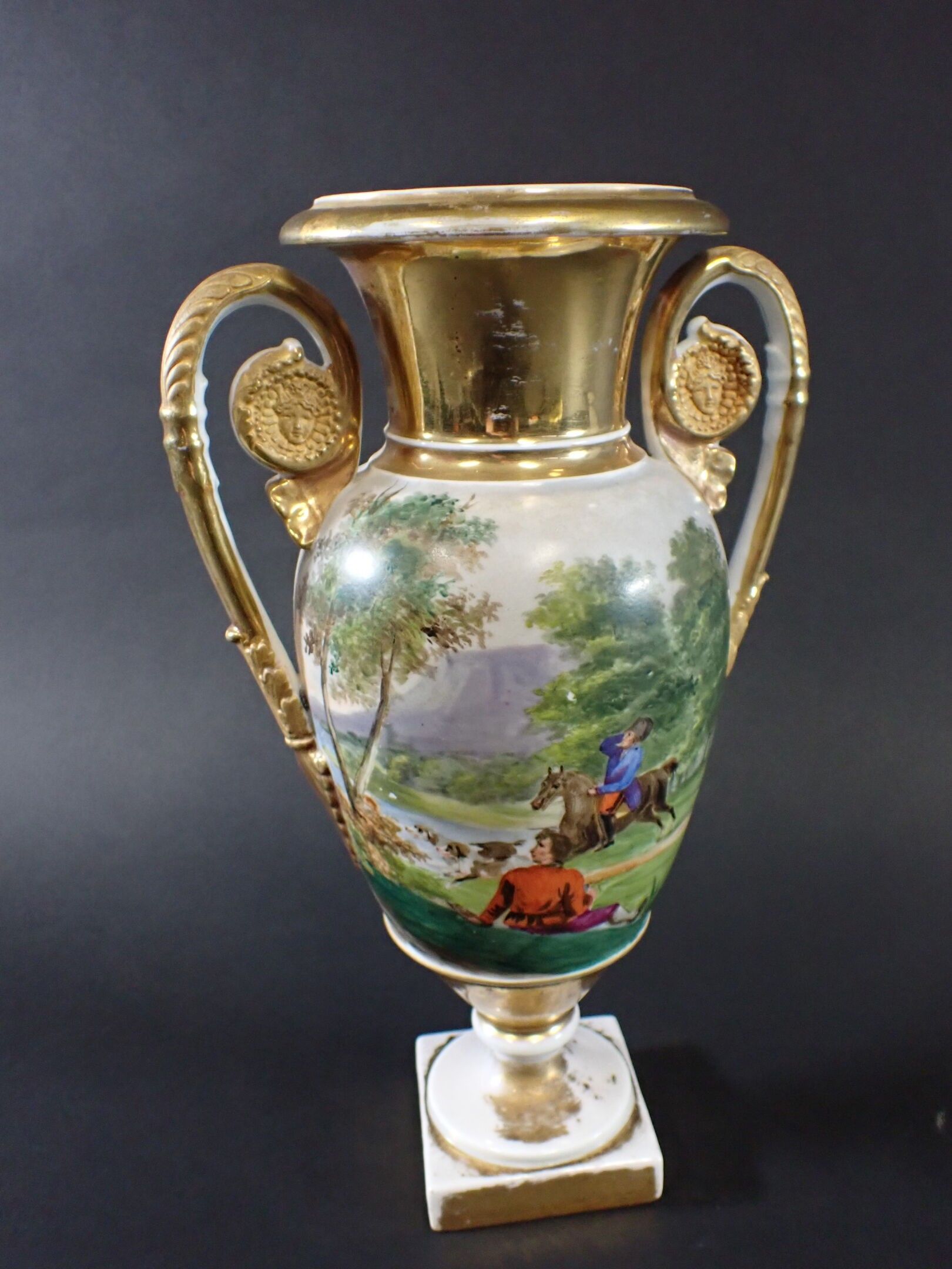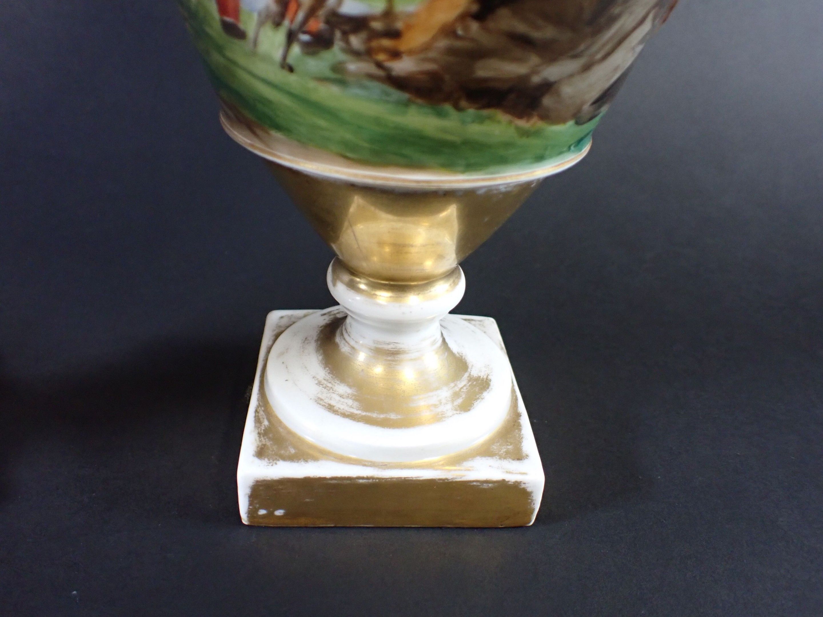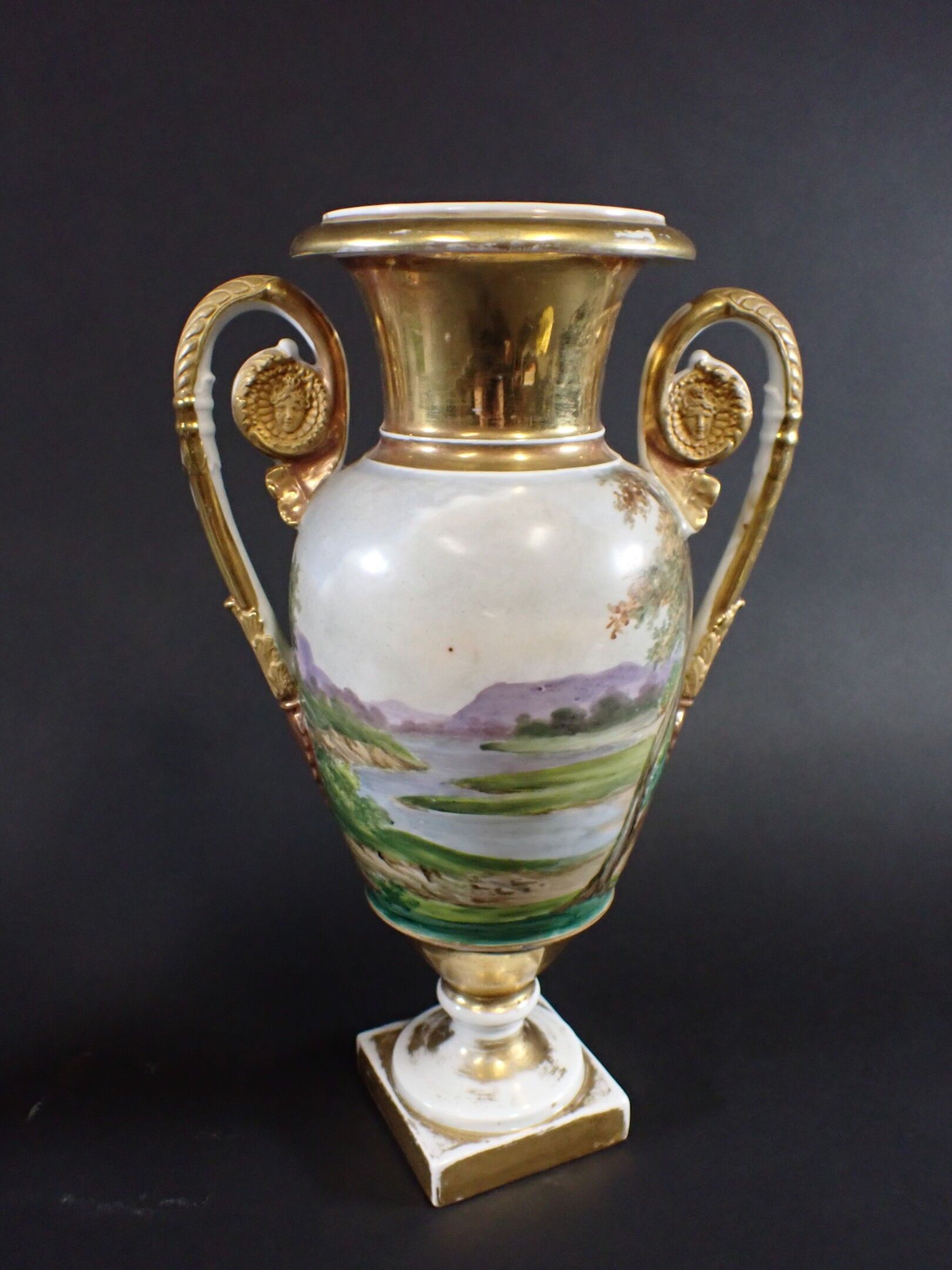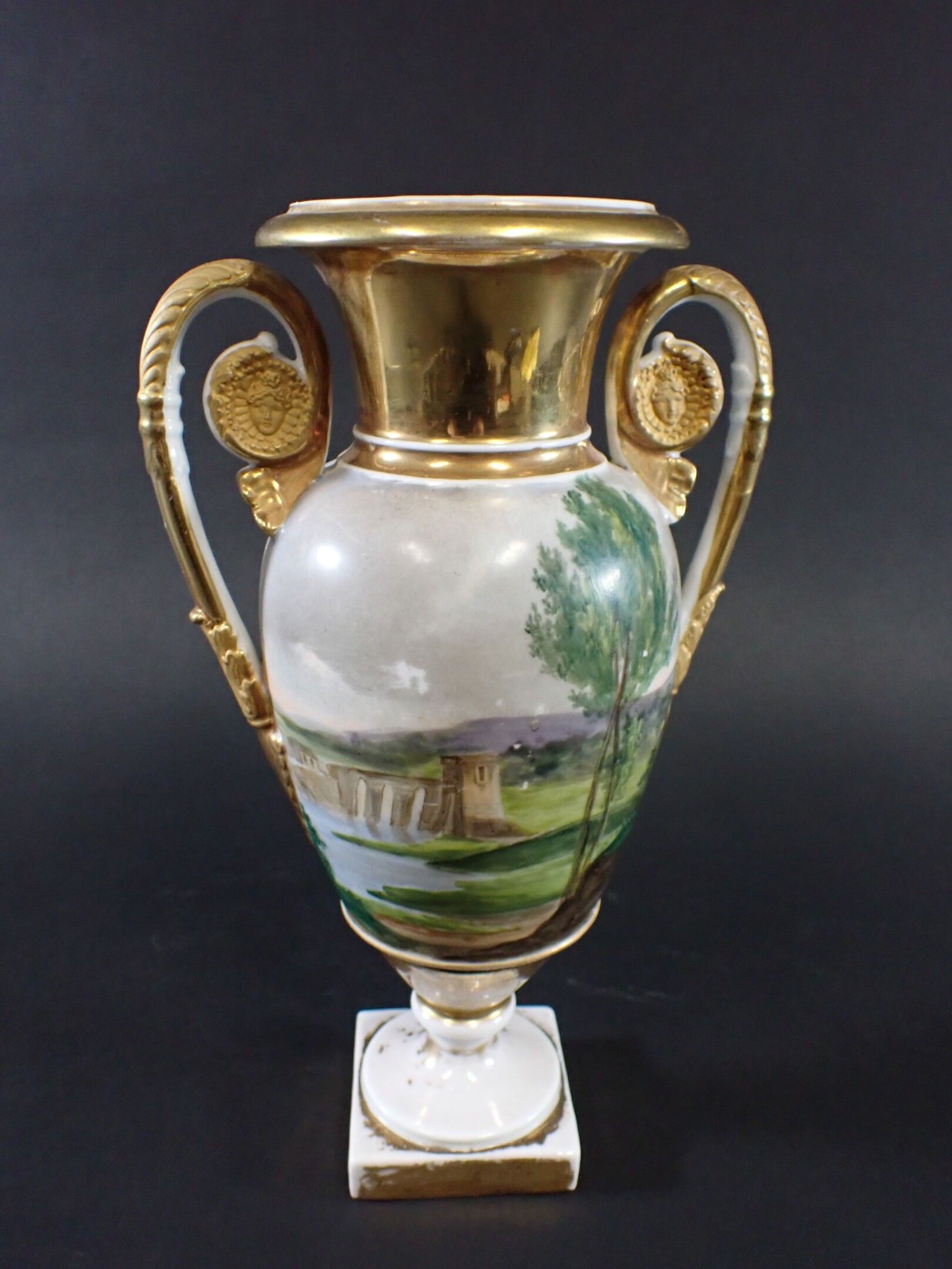 PARIS. A pair of Empire period porcelain vases with painted enamelled decoration and gold highlights, two scrolled handles. Height: 29 cm (wear)