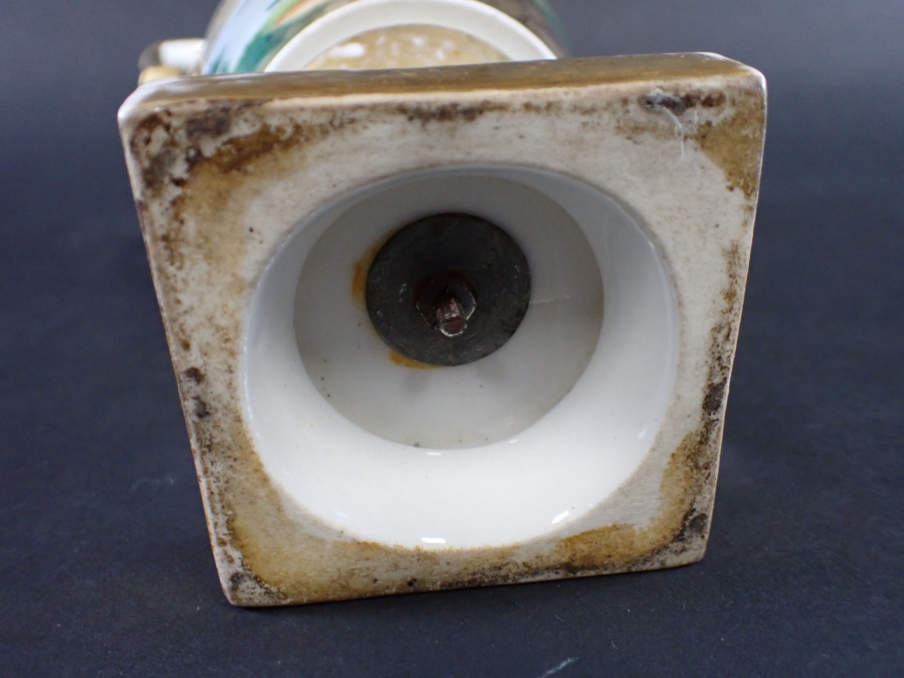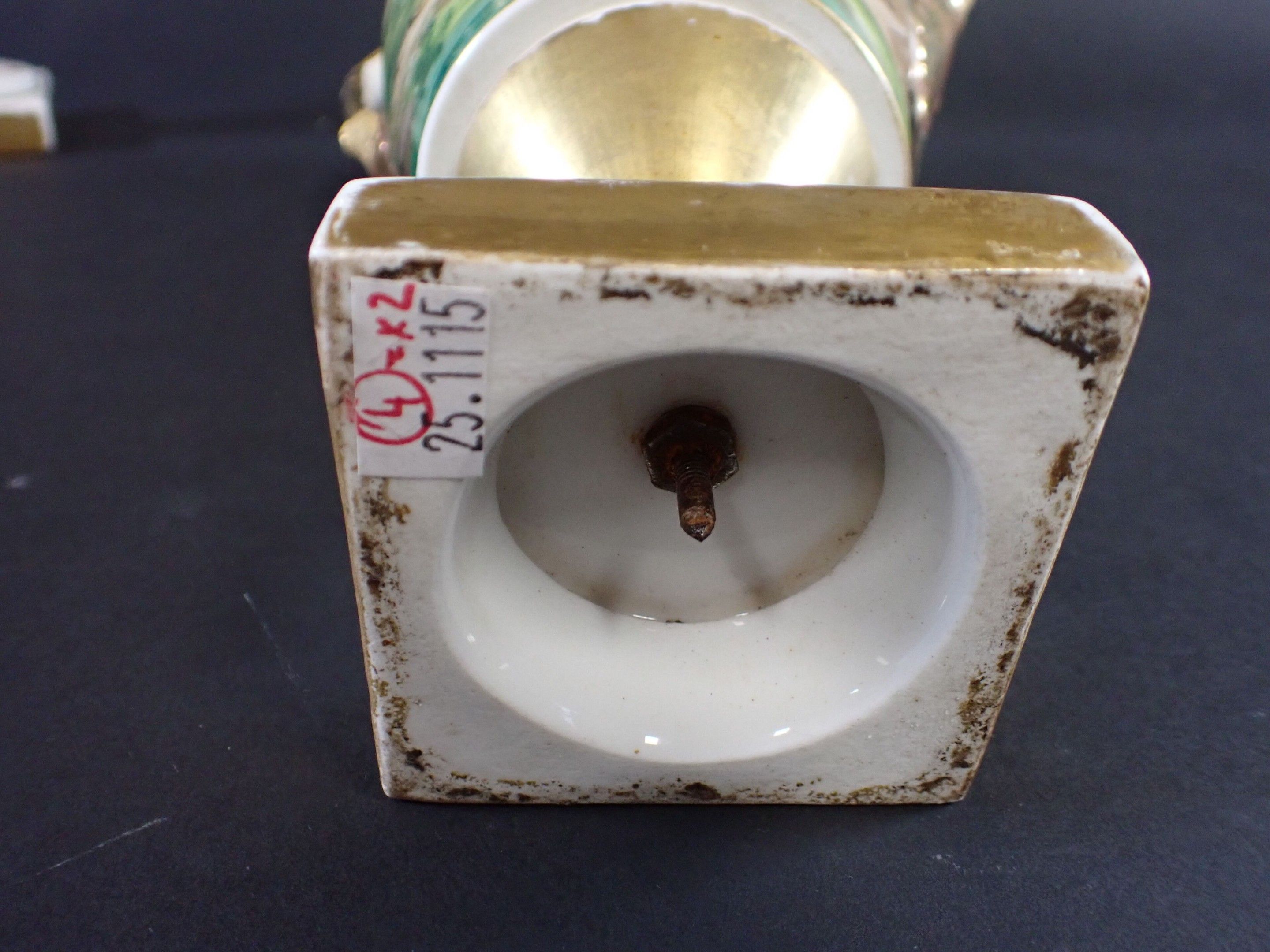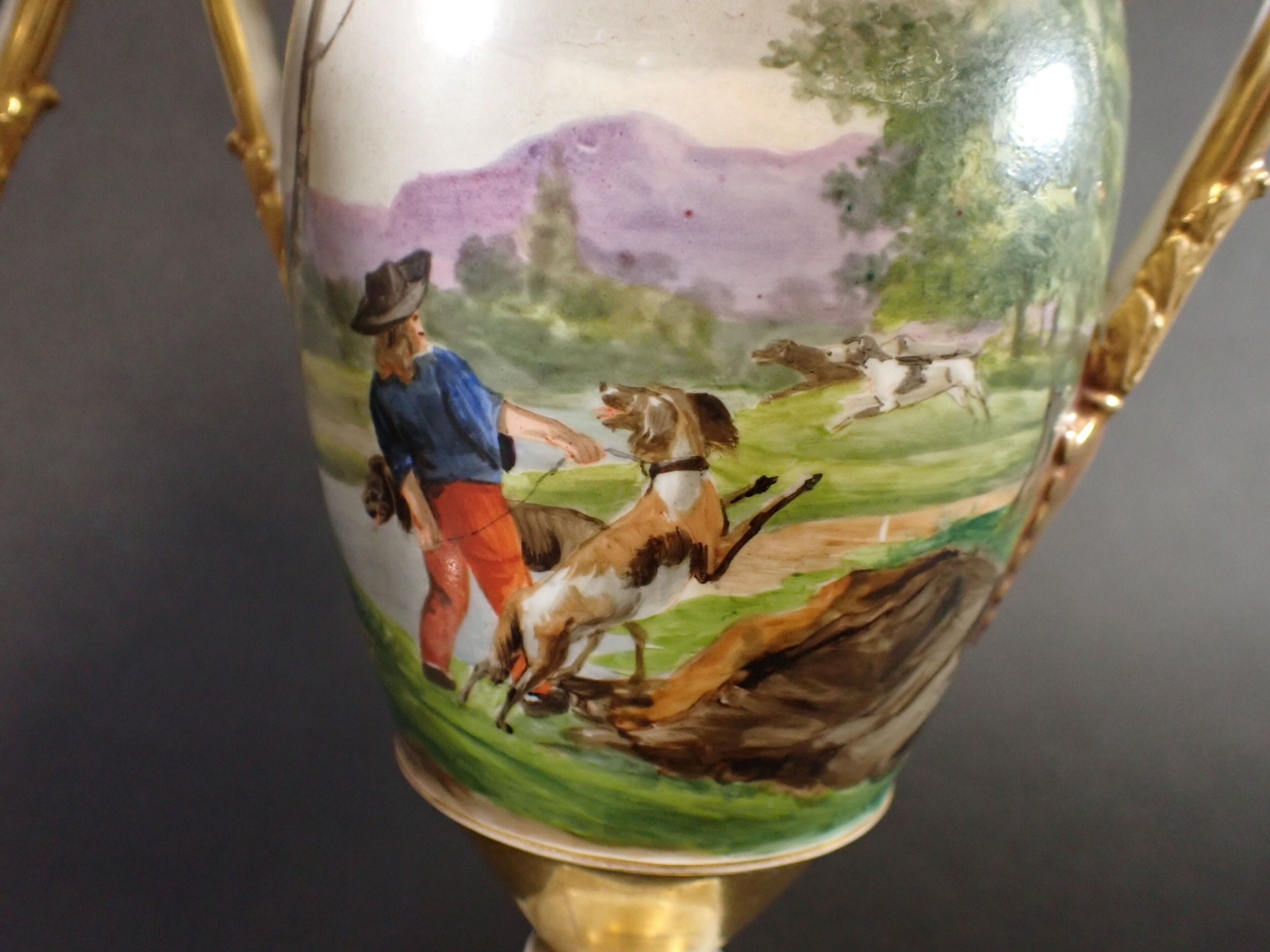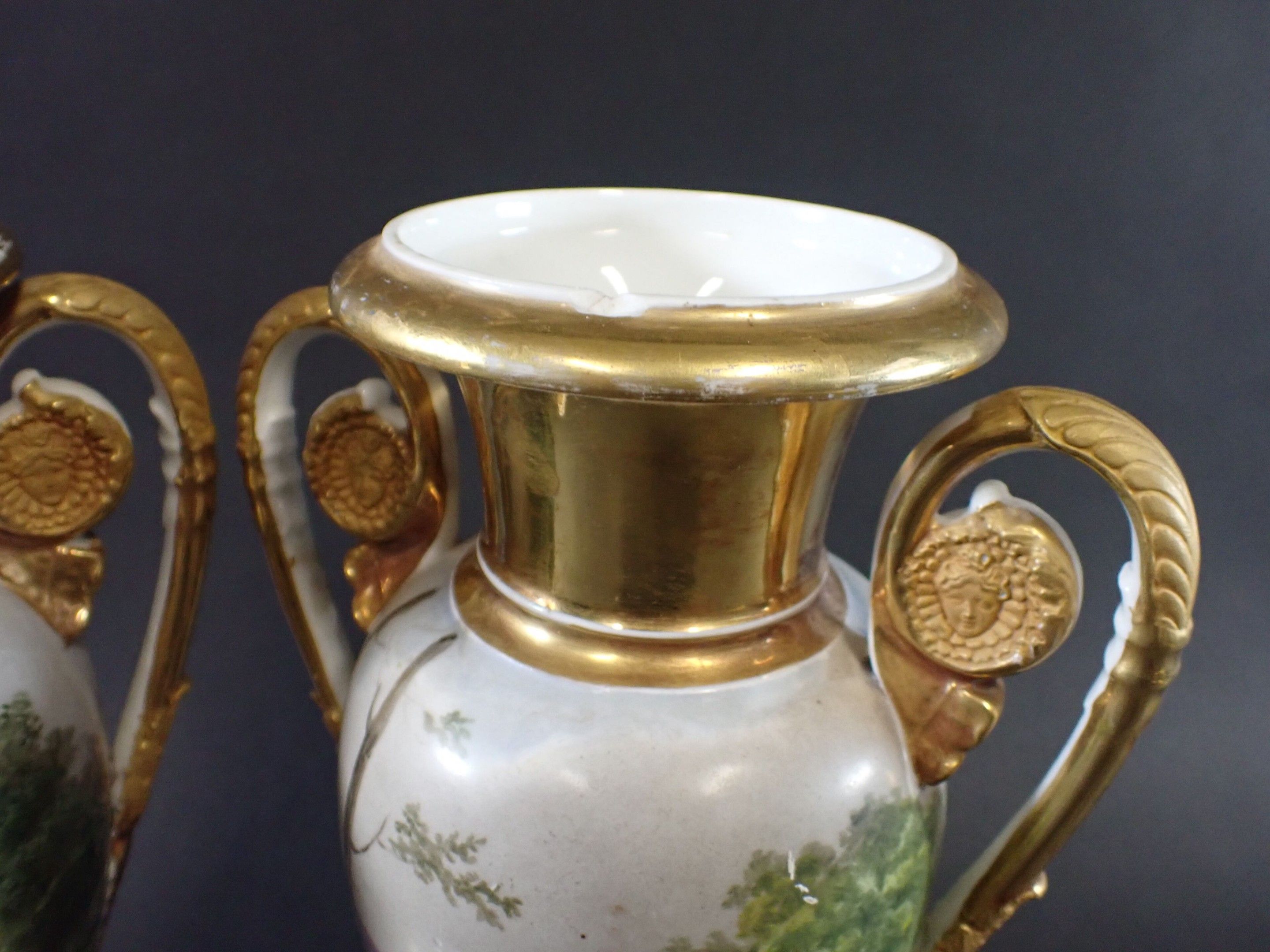 PARIS. A pair of Empire period porcelain vases with painted enamelled decoration and gold highlights, two scrolled handles. Height: 29 cm (wear)