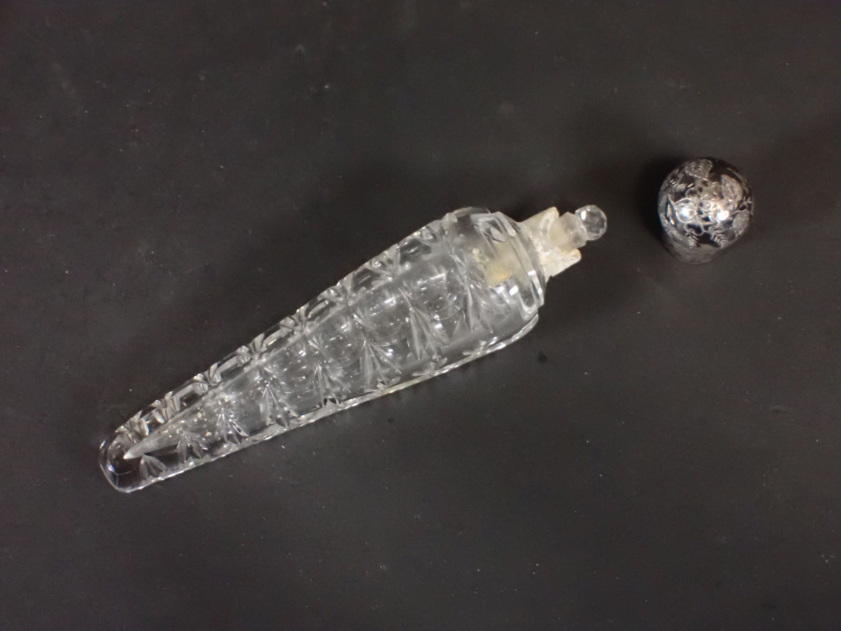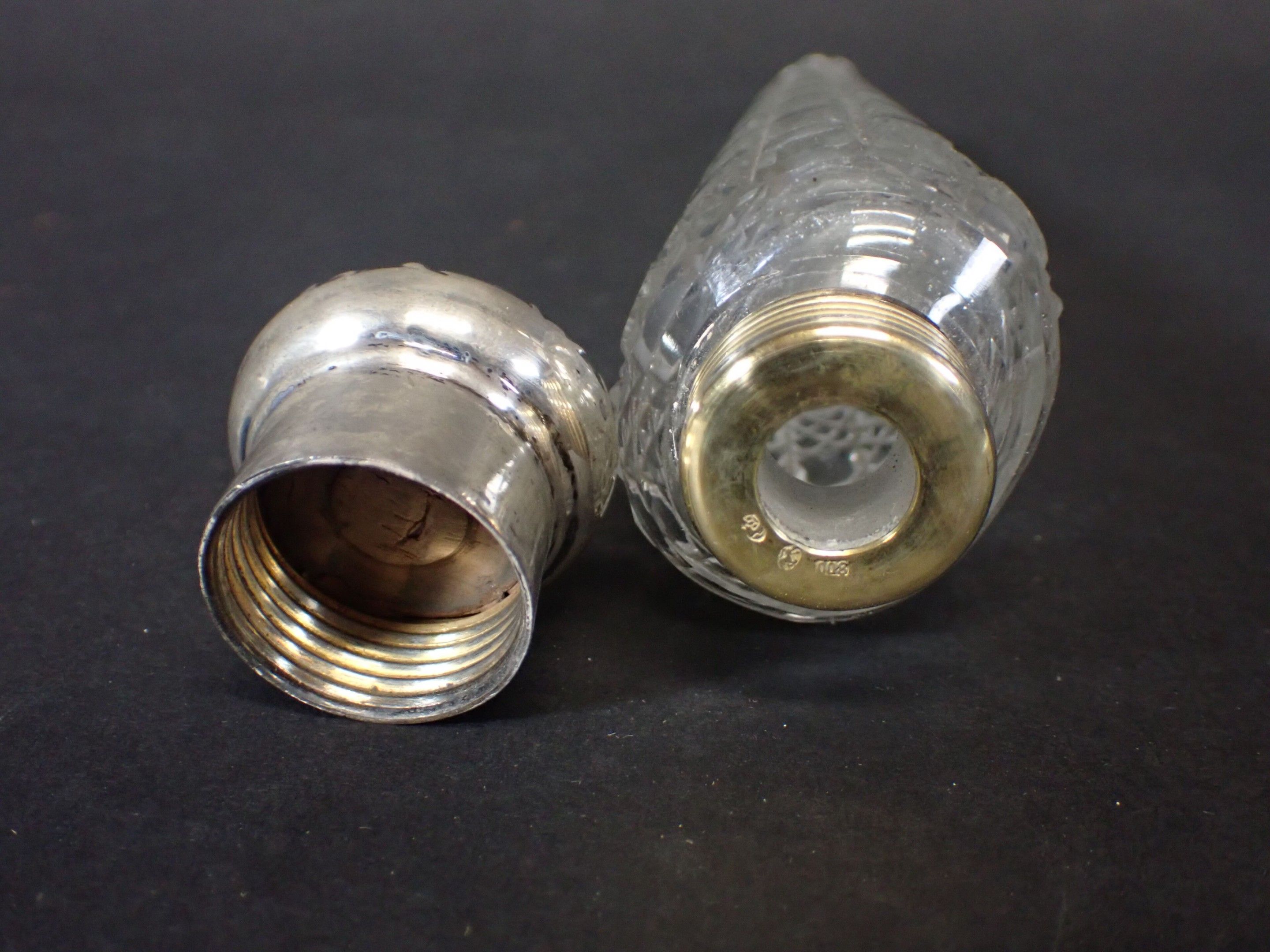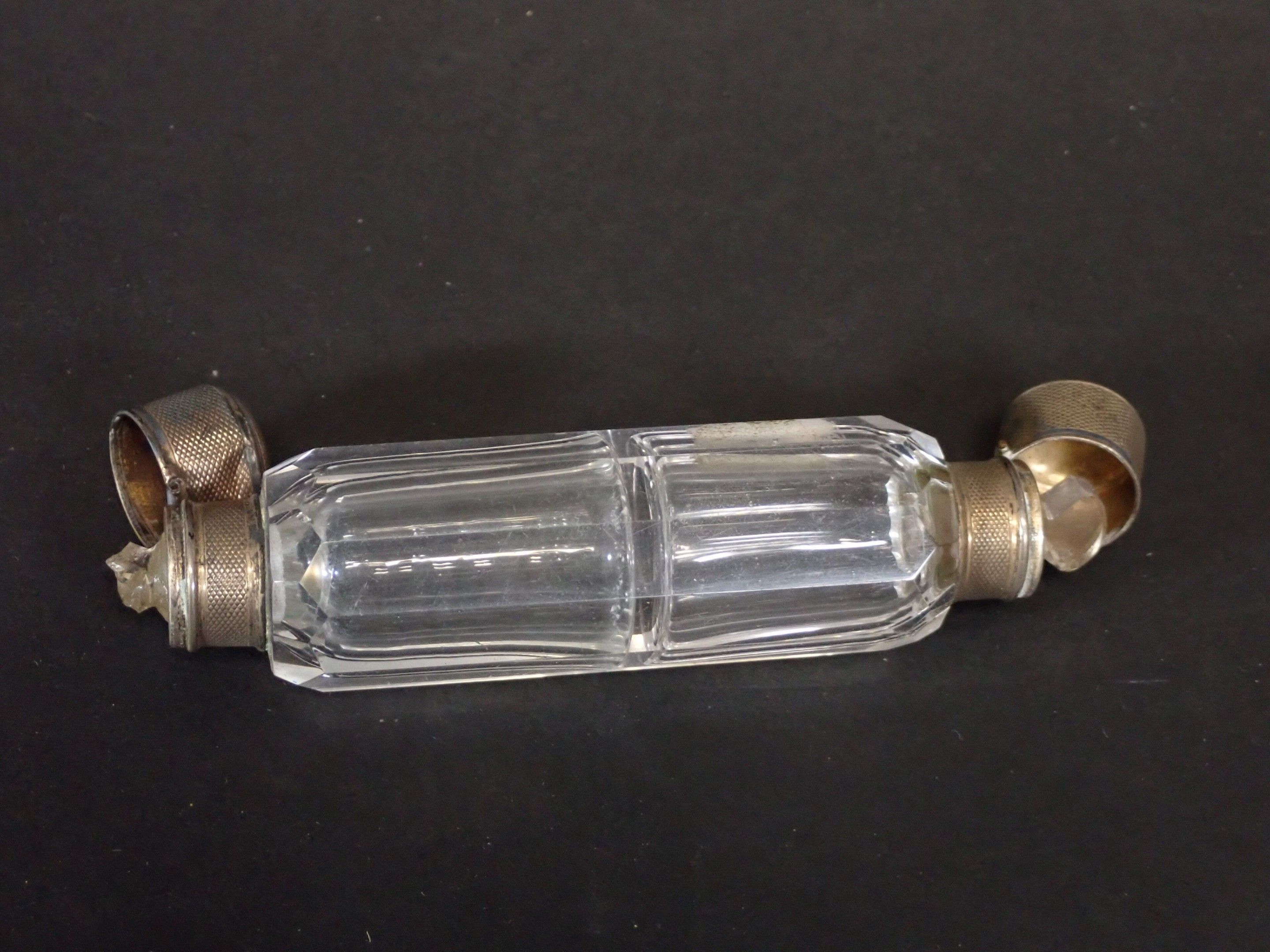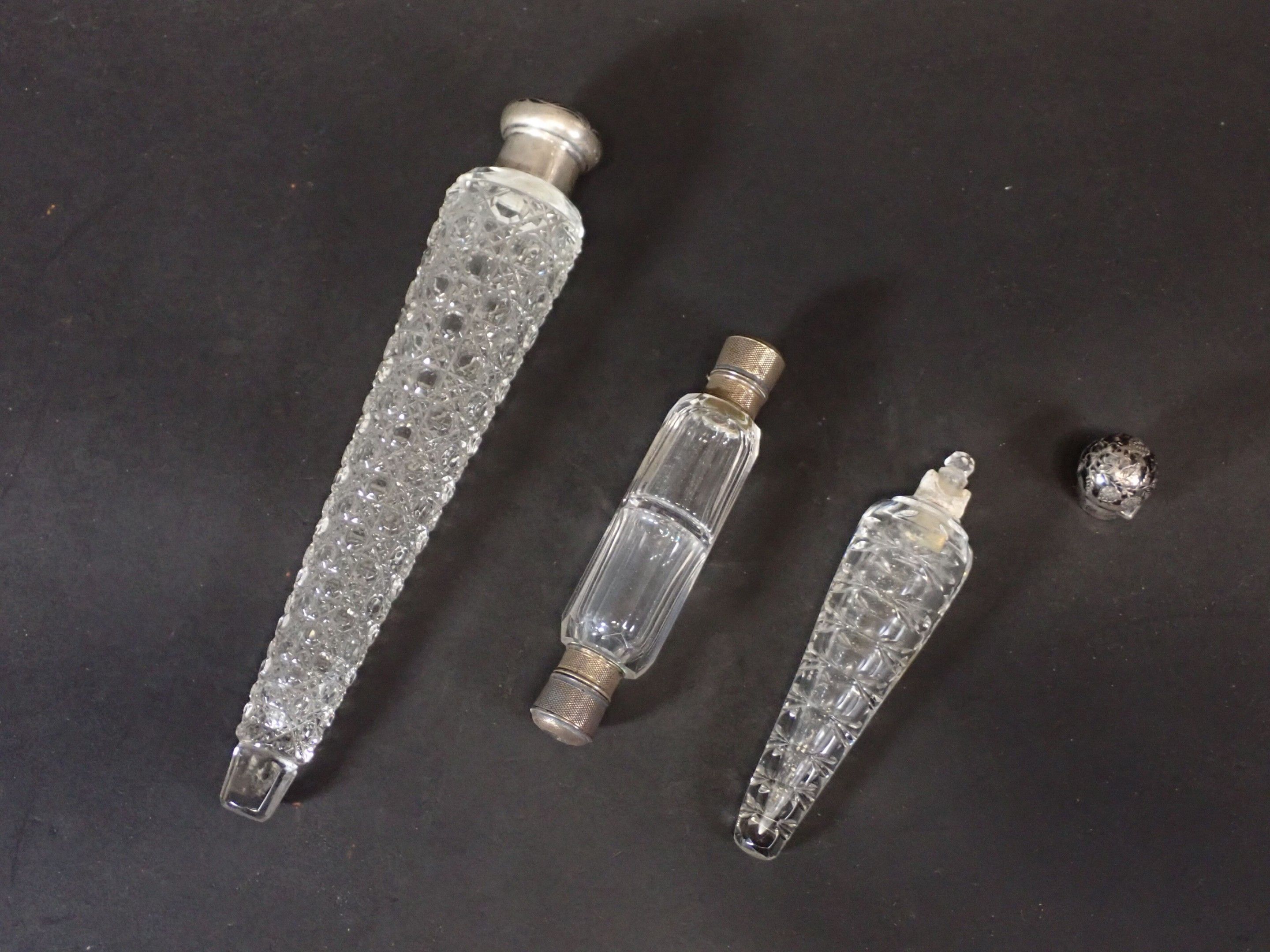 Set of 3 late 19th century salt flasks, one with double glass compartments and double silver stoppers and two other conical engraved glass flasks (one damaged without stopper) - Length 24 to 14 cm (wear)