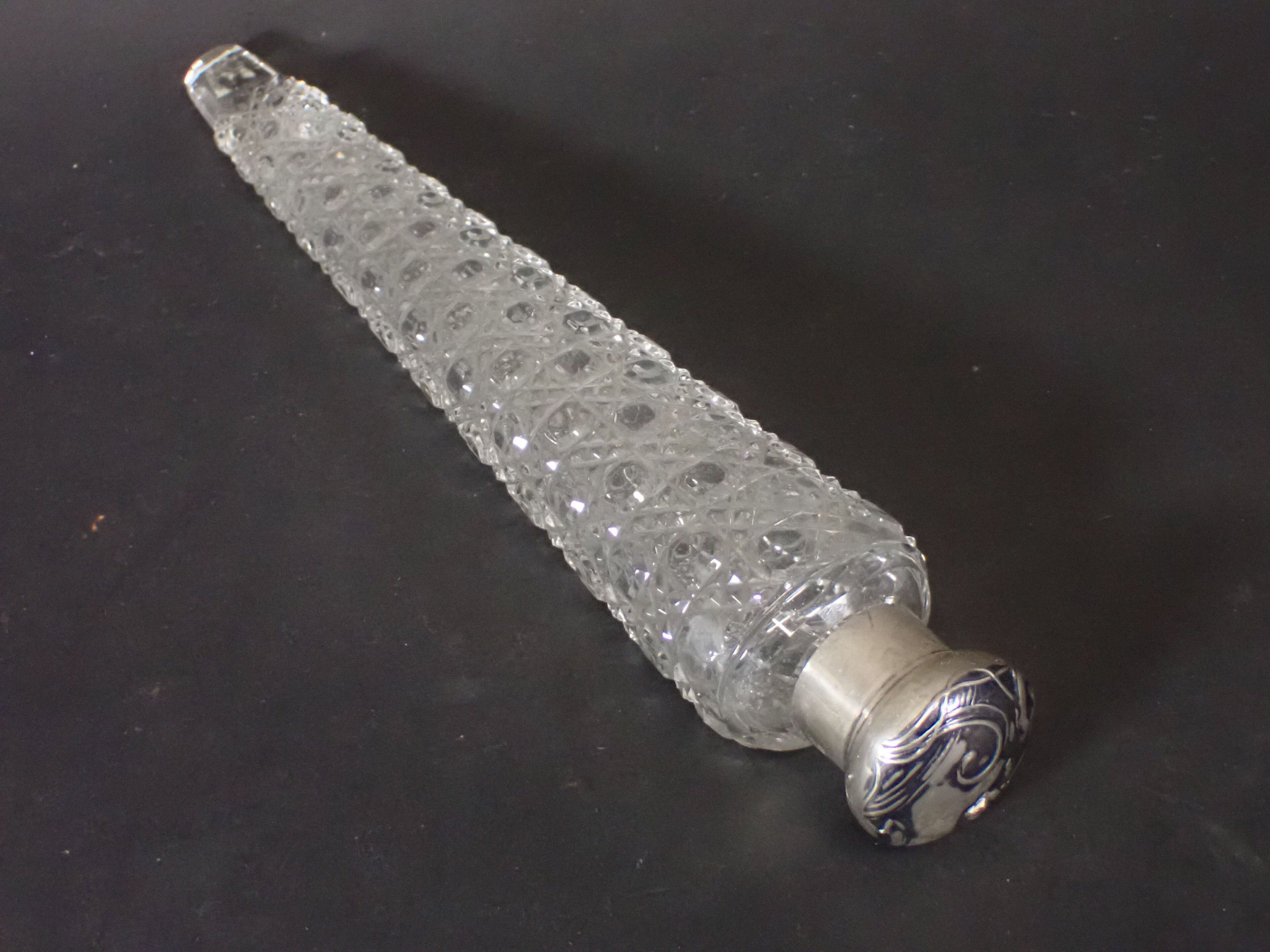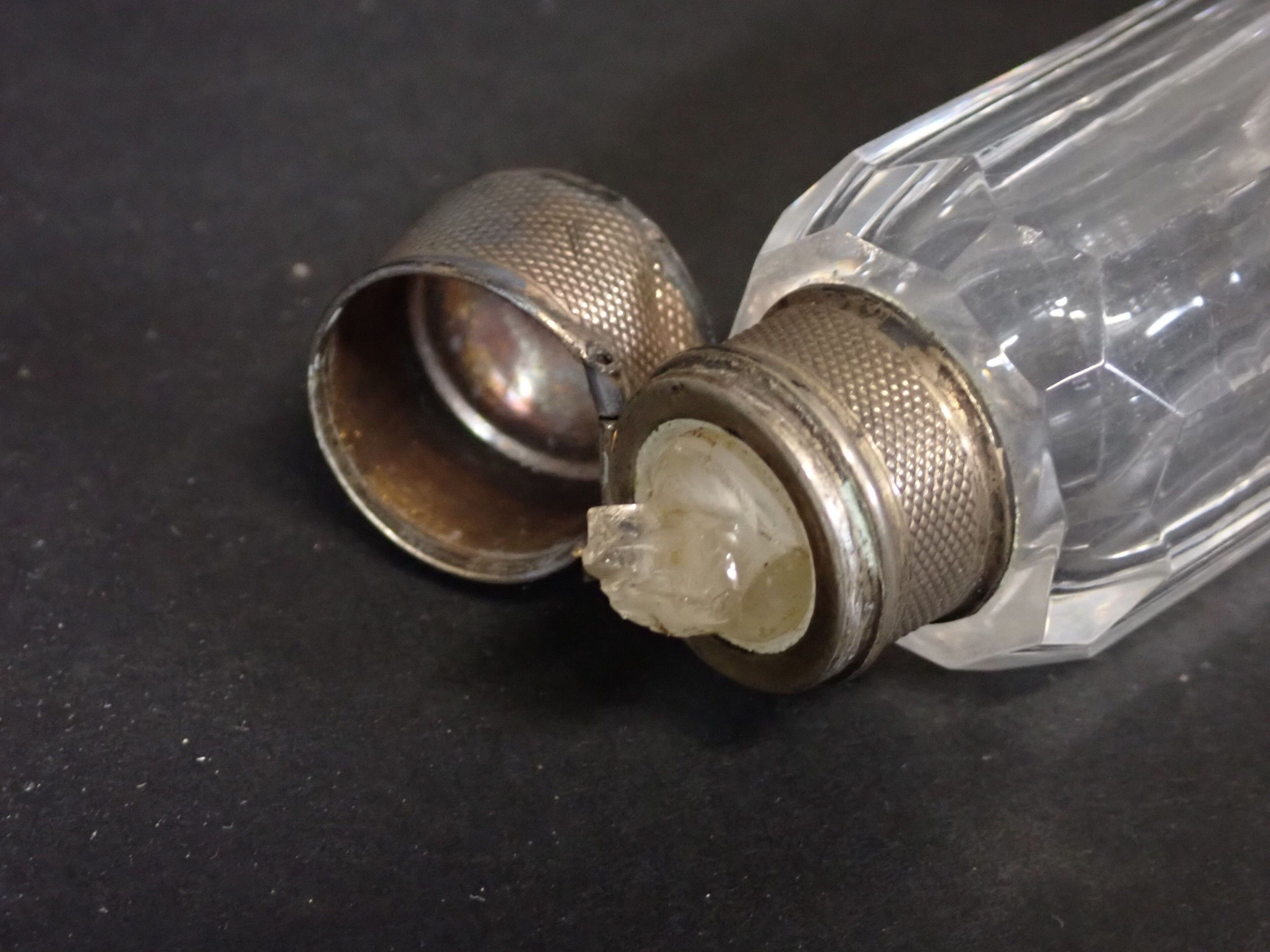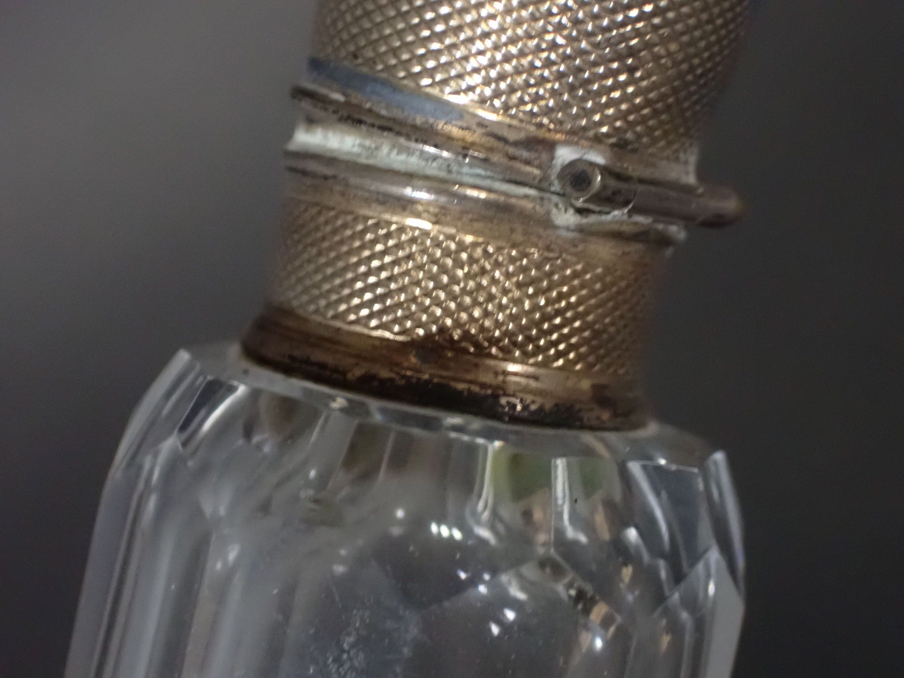 Set of 3 late 19th century salt flasks, one with double glass compartments and double silver stoppers and two other conical engraved glass flasks (one damaged without stopper) - Length 24 to 14 cm (wear)