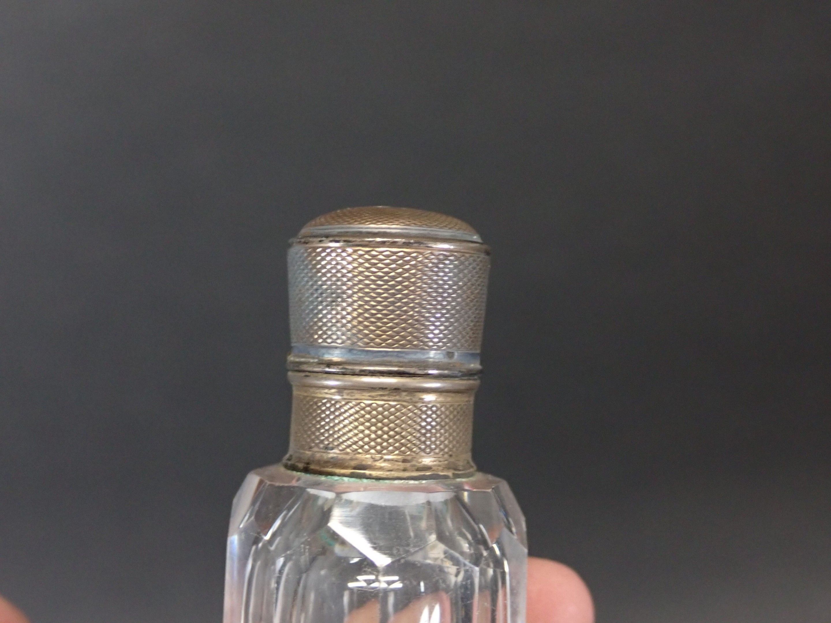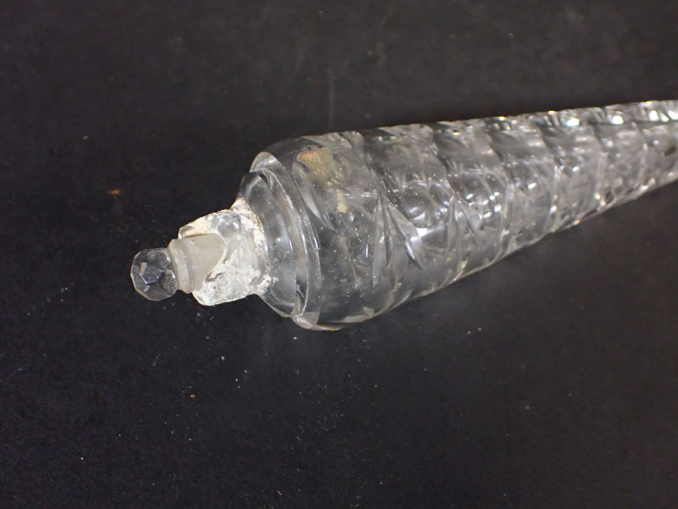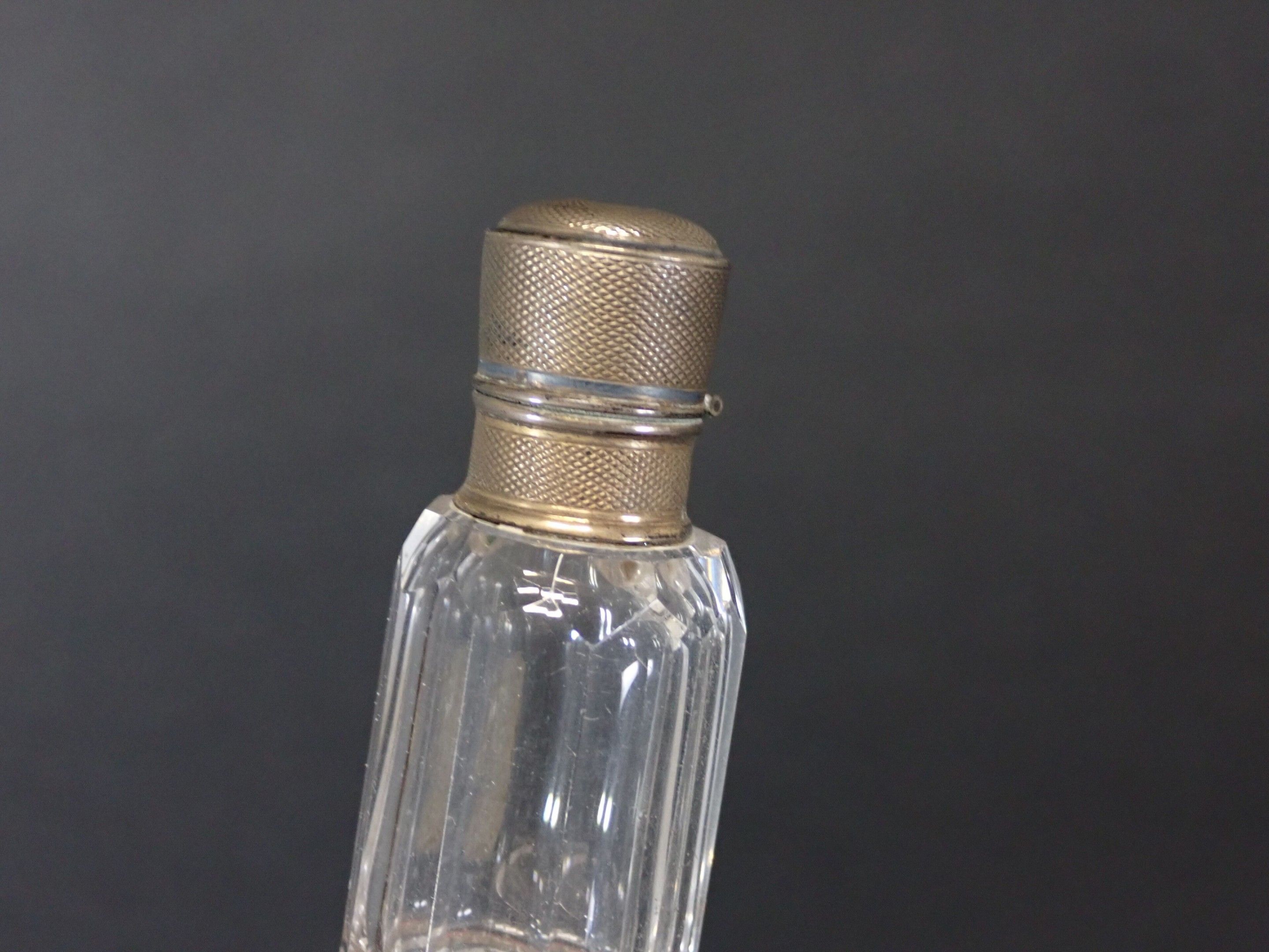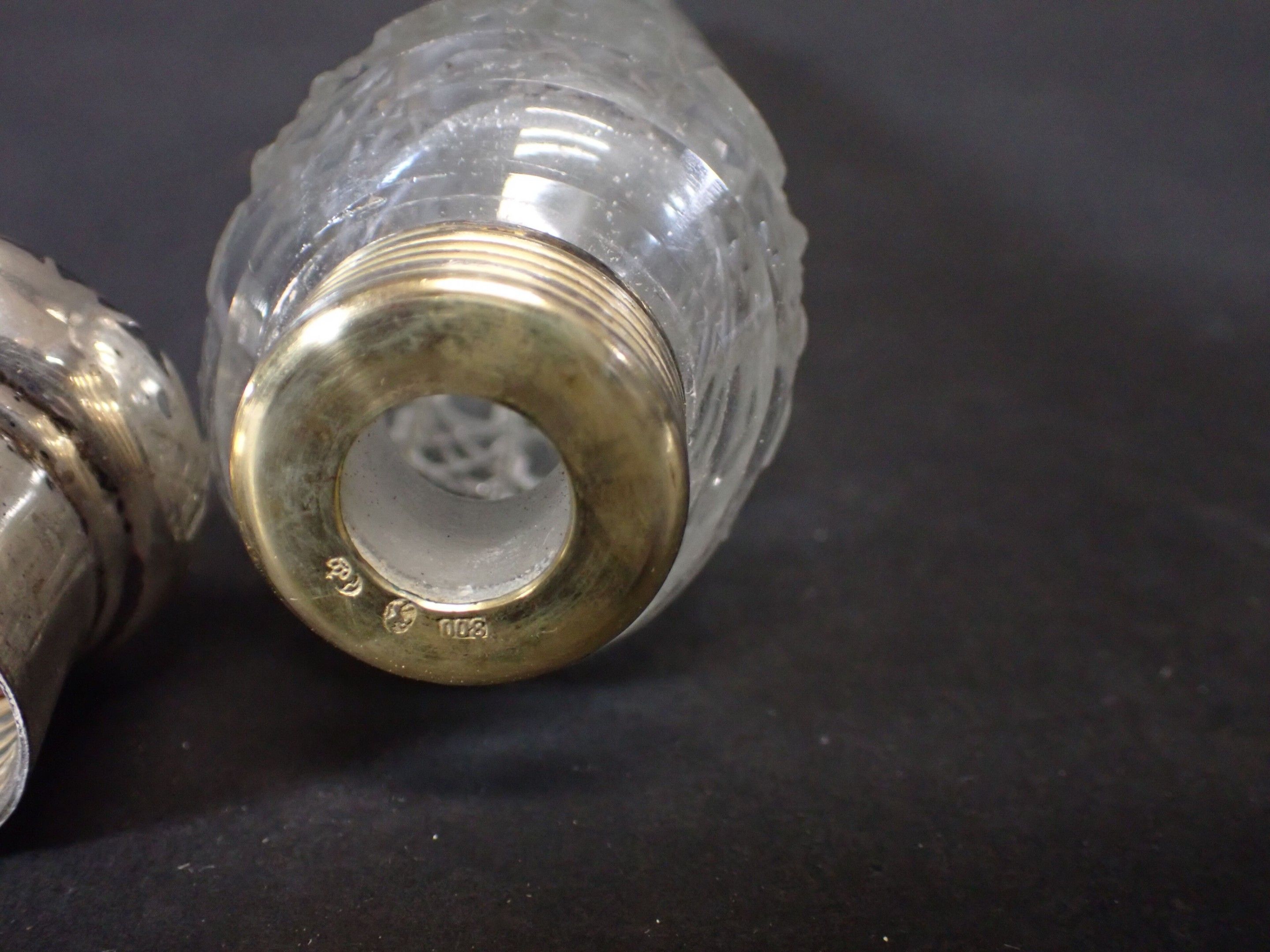 Set of 3 late 19th century salt flasks, one with double glass compartments and double silver stoppers and two other conical engraved glass flasks (one damaged without stopper) - Length 24 to 14 cm (wear)