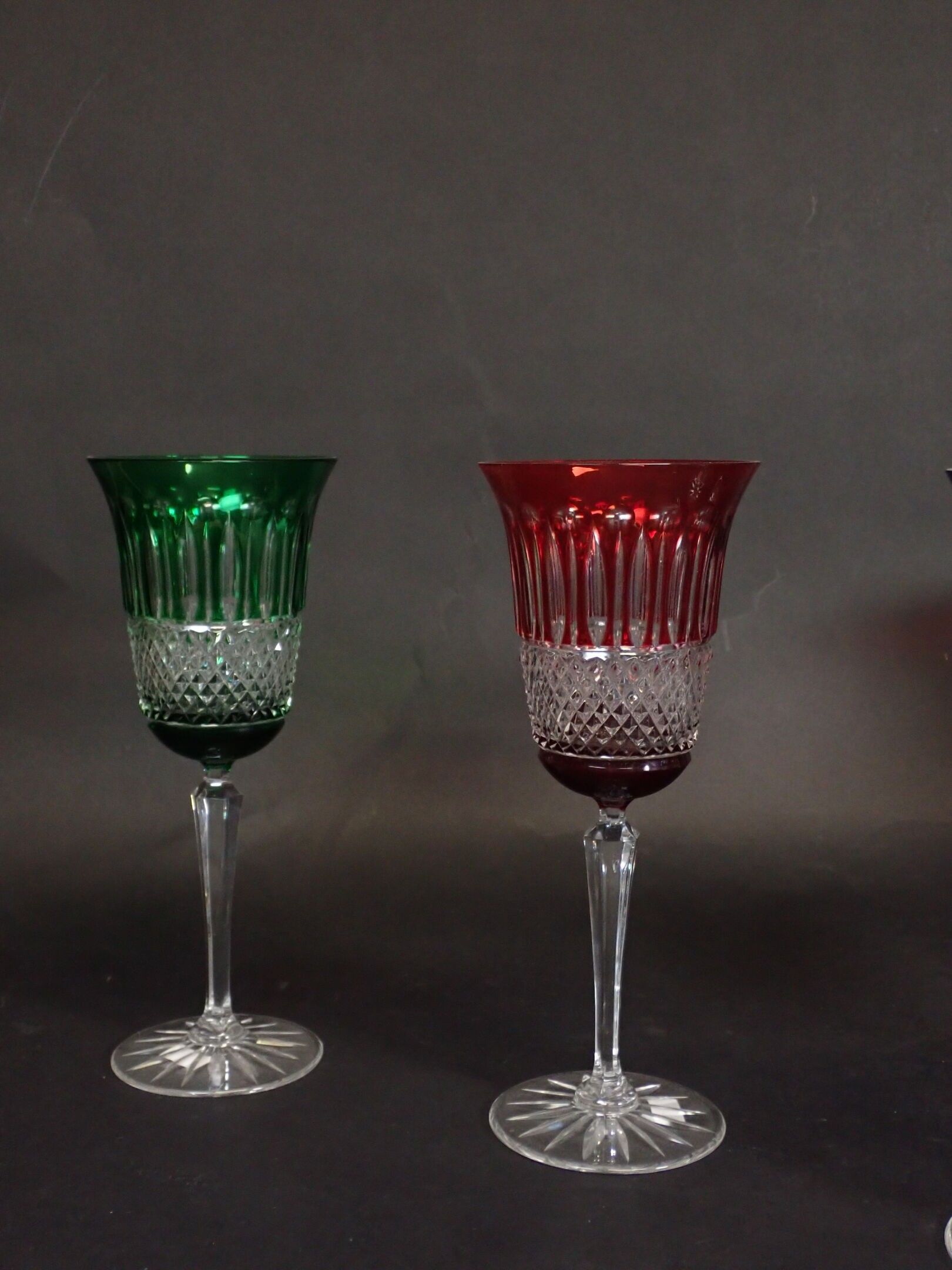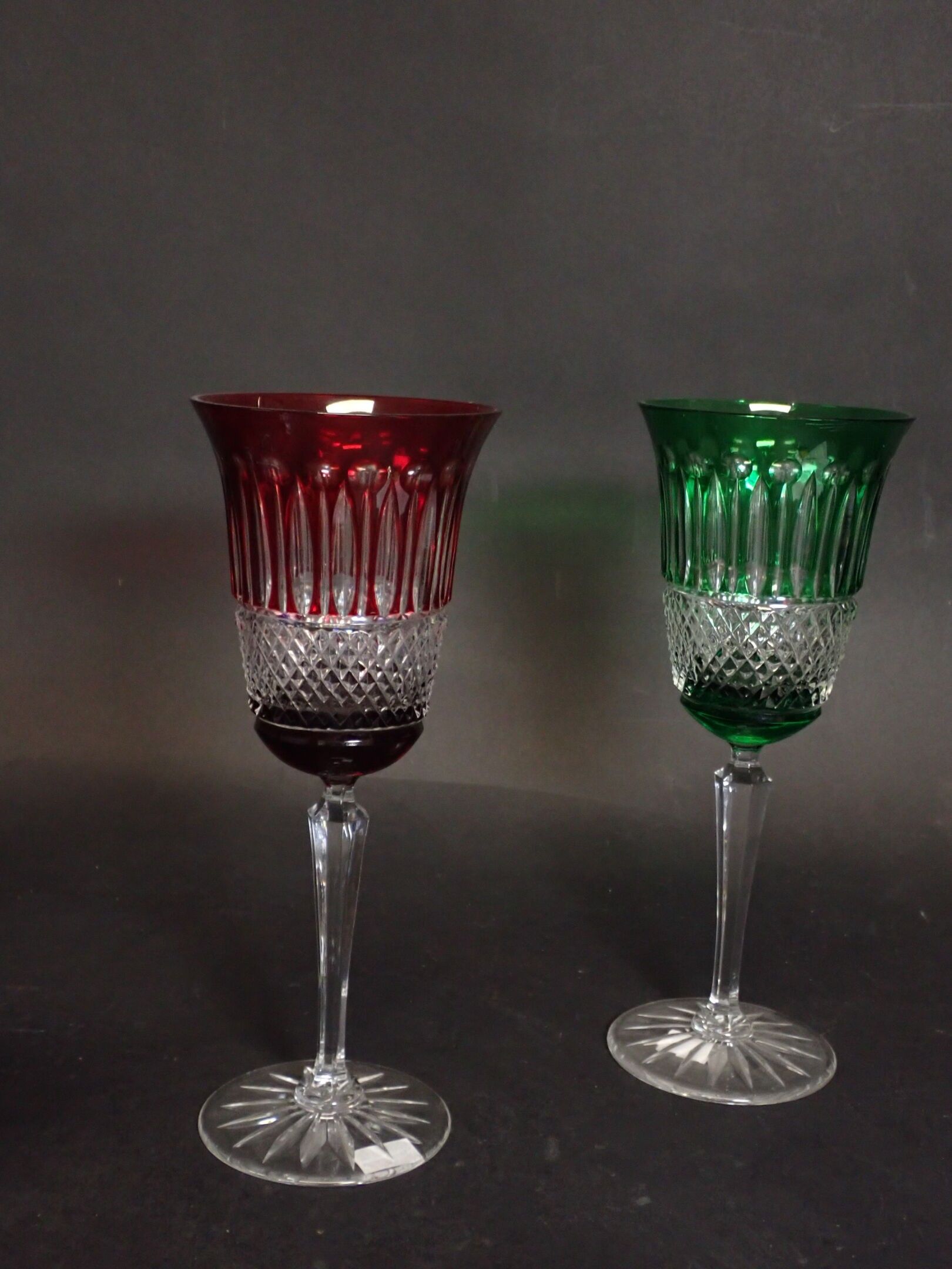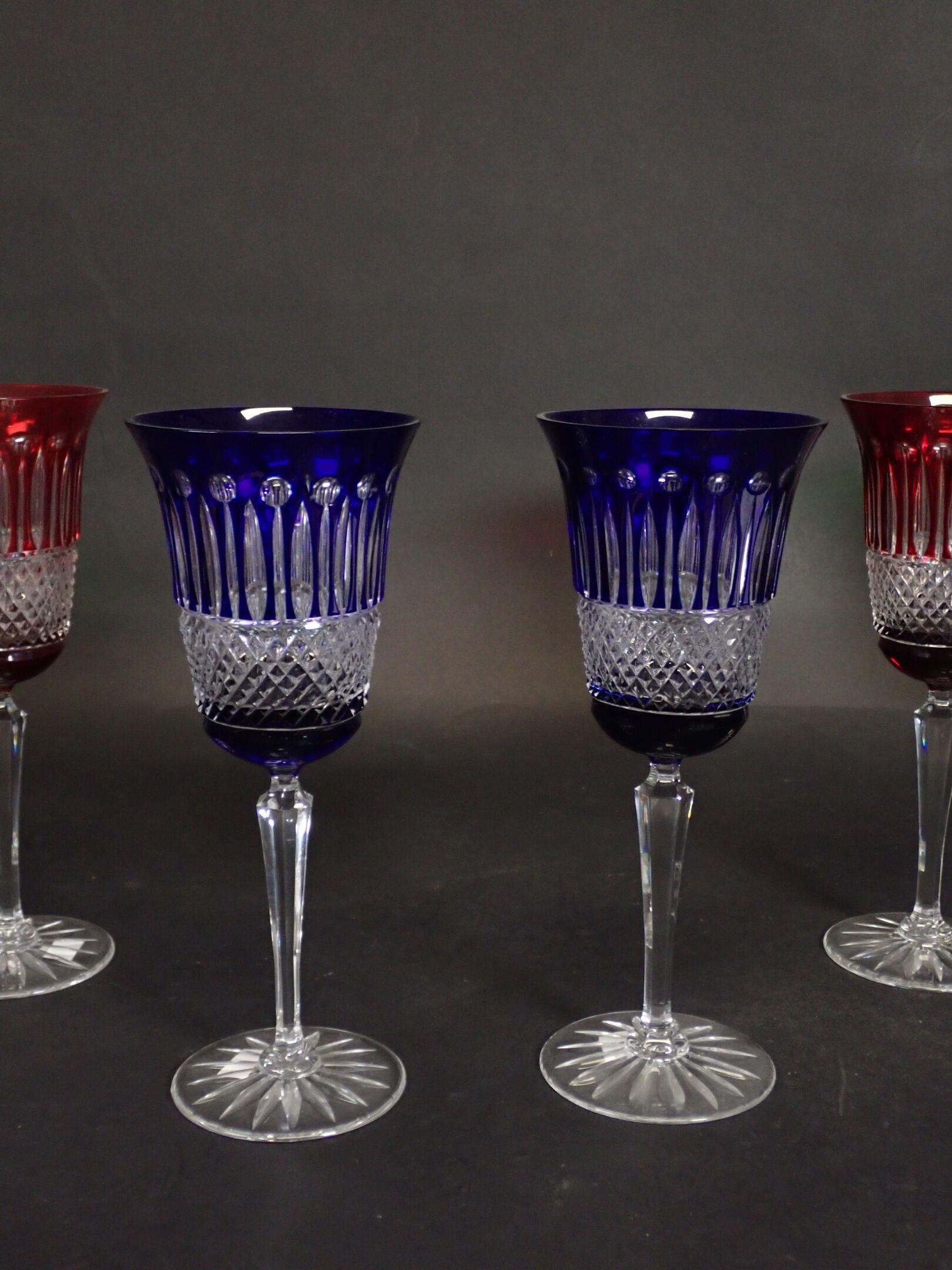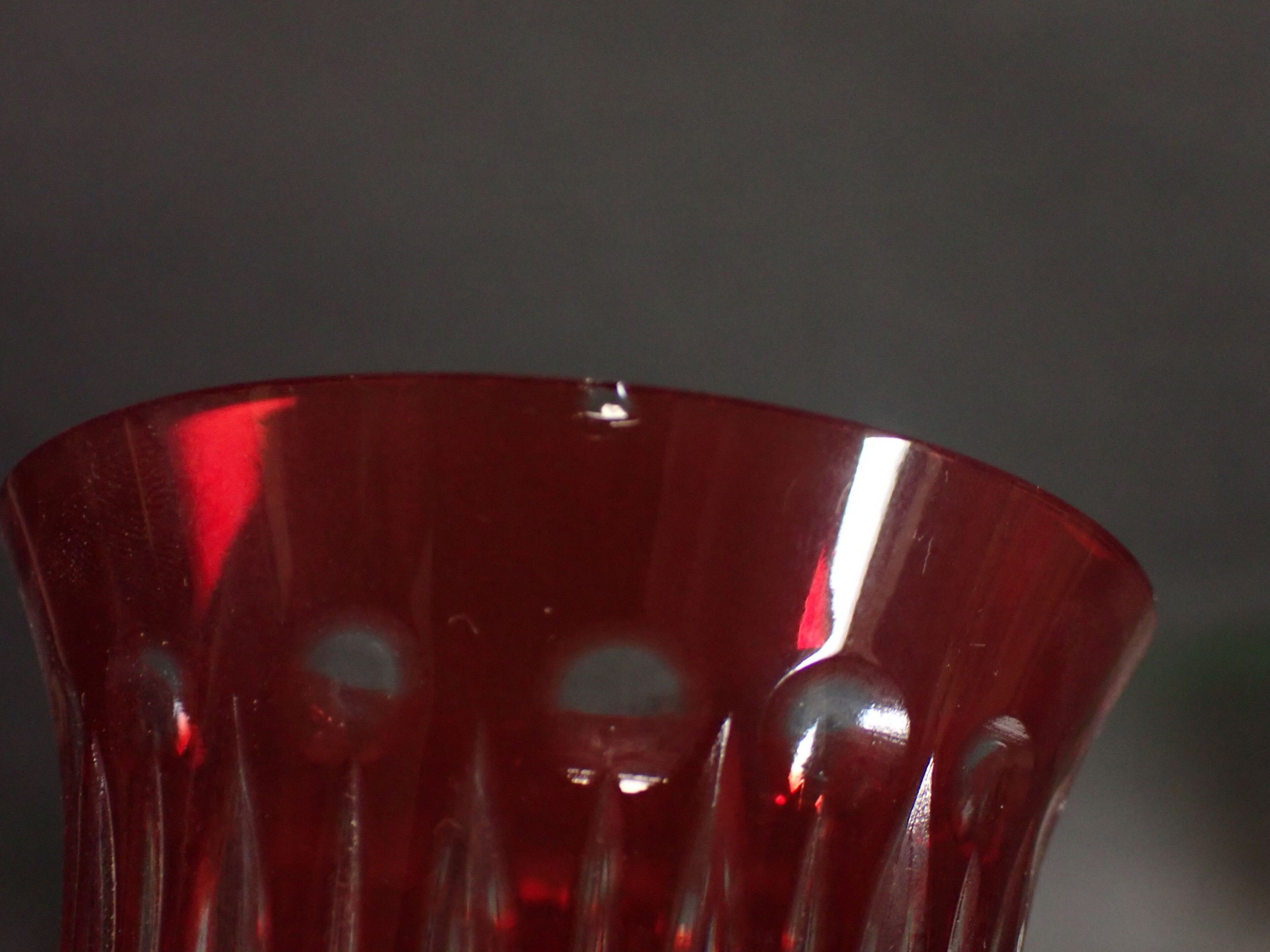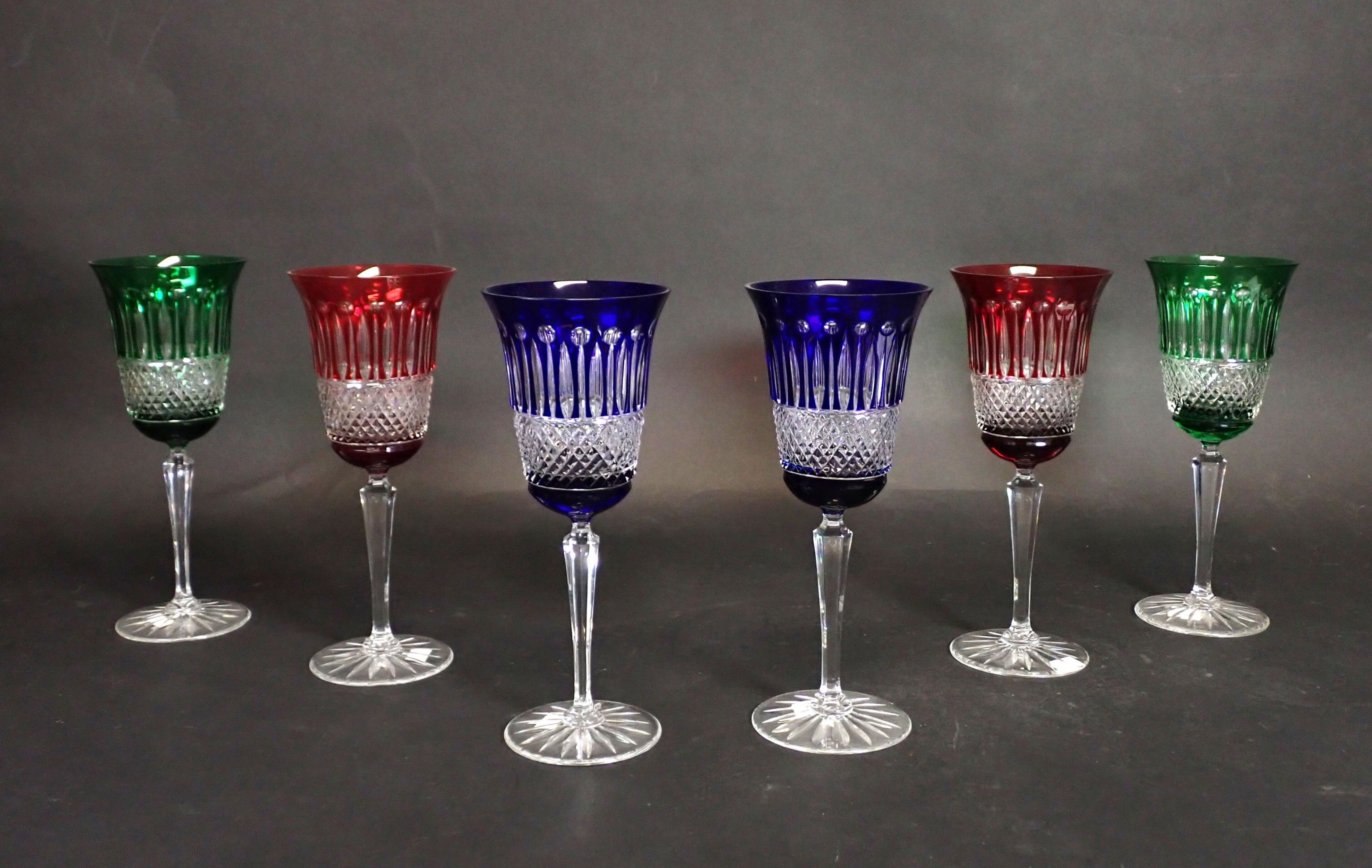 In the taste of SAINT-LOUIS and the Tommy model: suite of 6 cut crystal and overlay wine glasses. Height: 22.5 cm