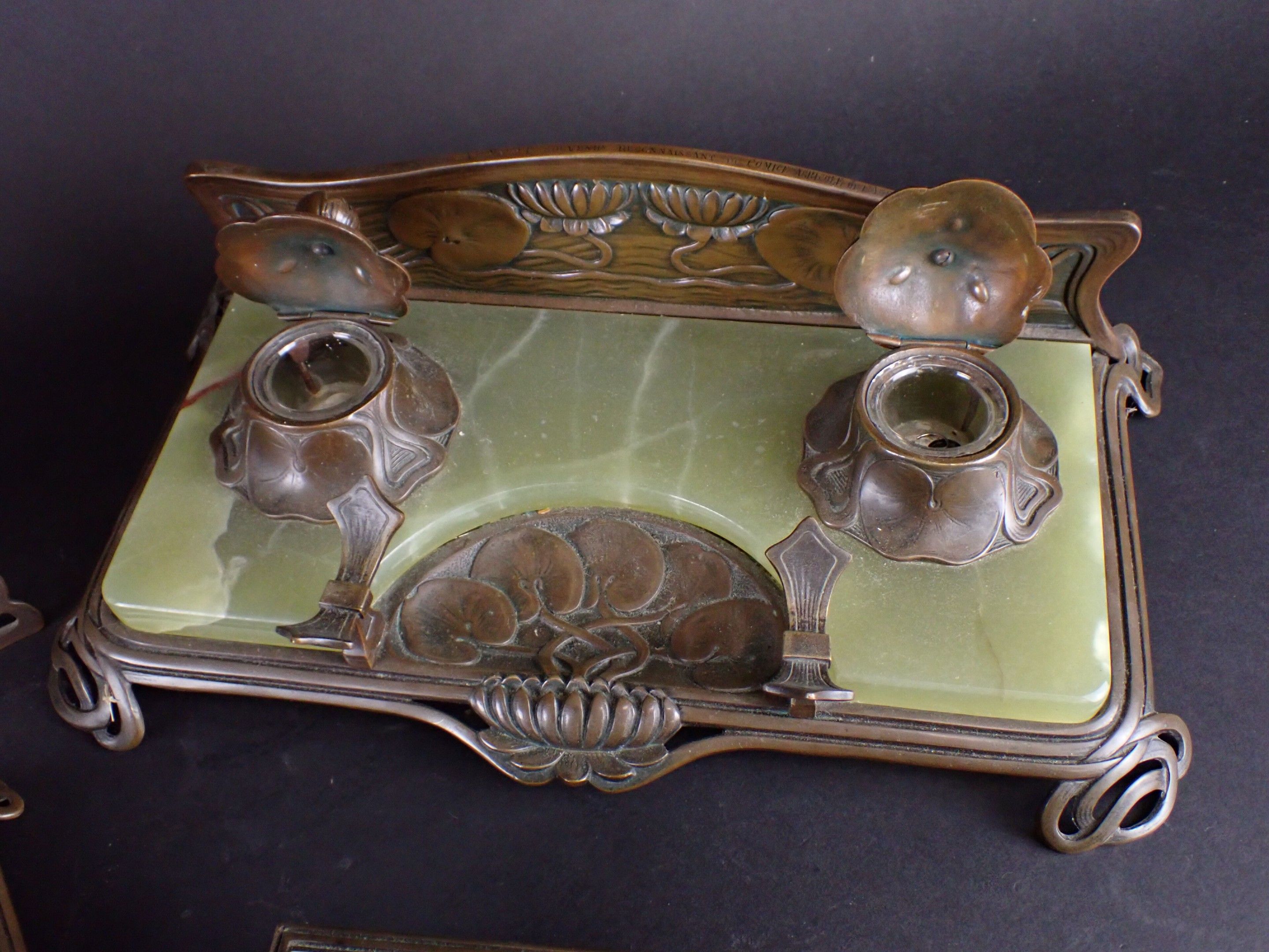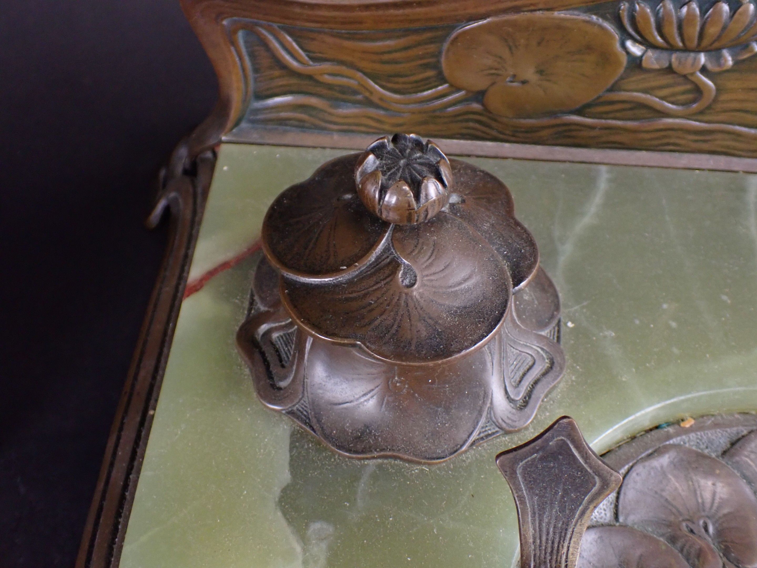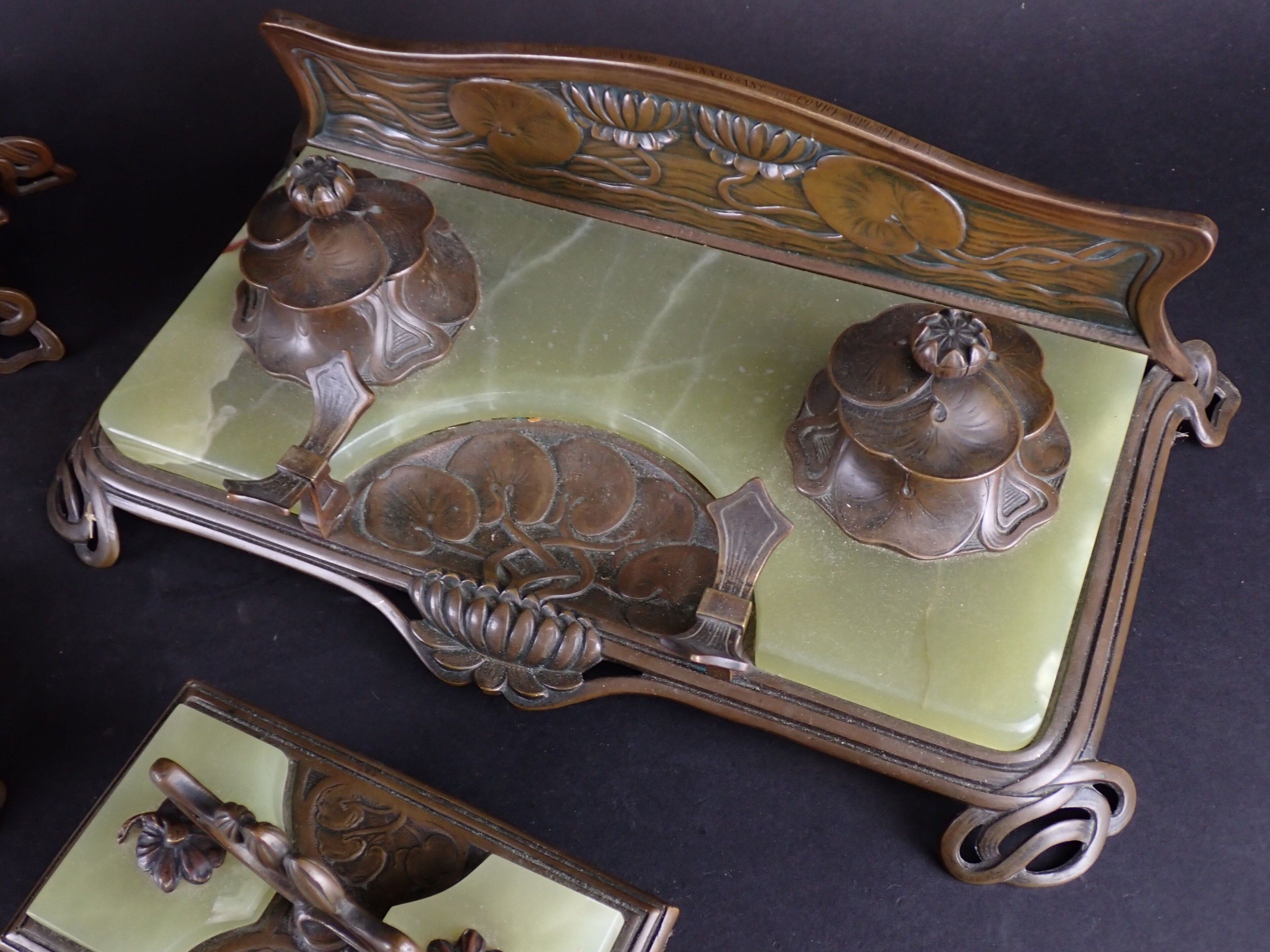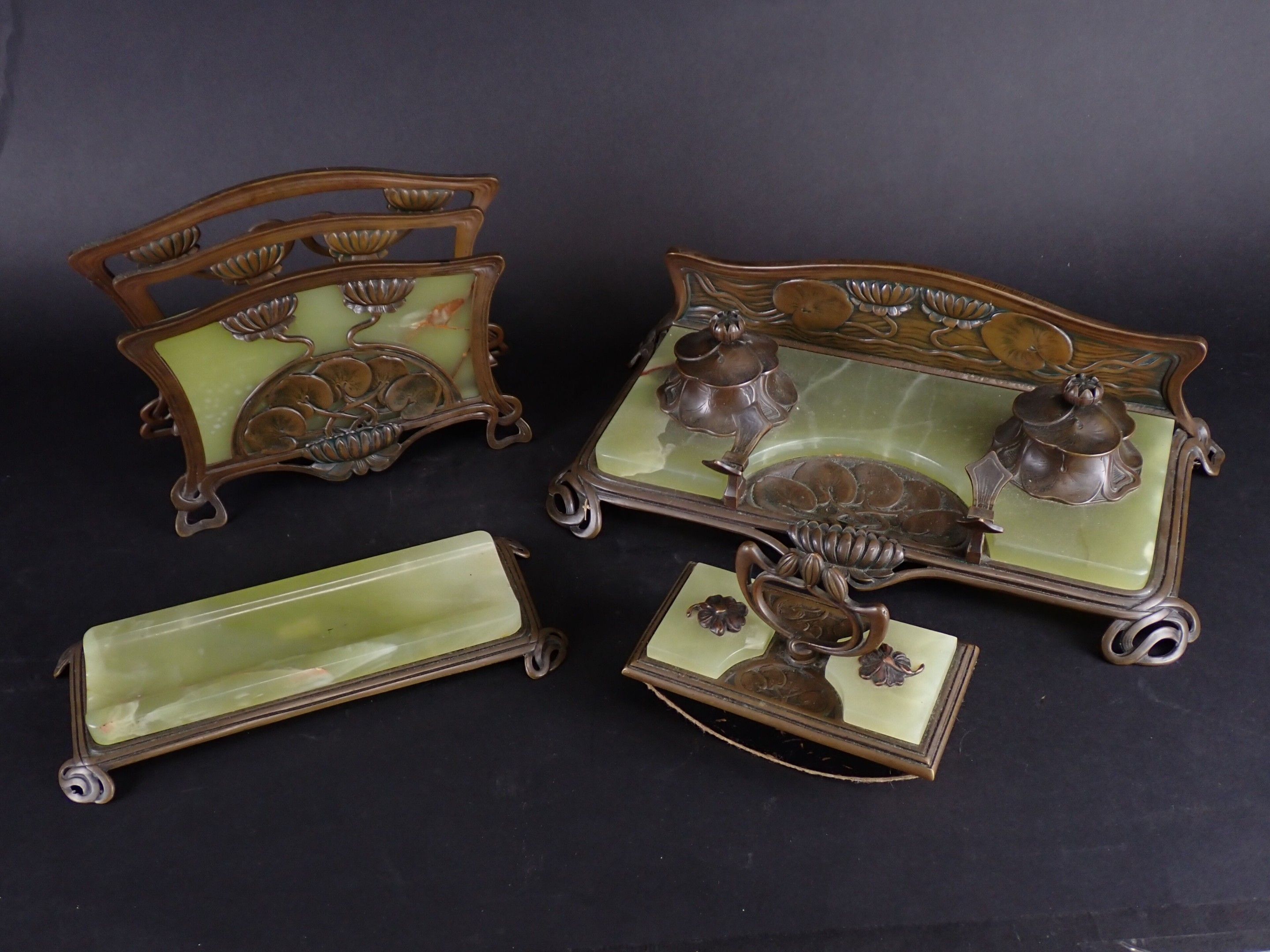 Art Nouveau desk set in bronze and green onyx decorated with water lilies, comprising: double inkwell, pen rest, letter tray, blotter. Art Nouveau period. Inkwell Dim: 10.5 x 36 x 19 cm Letter holder: 16 x 24 x 8 cm