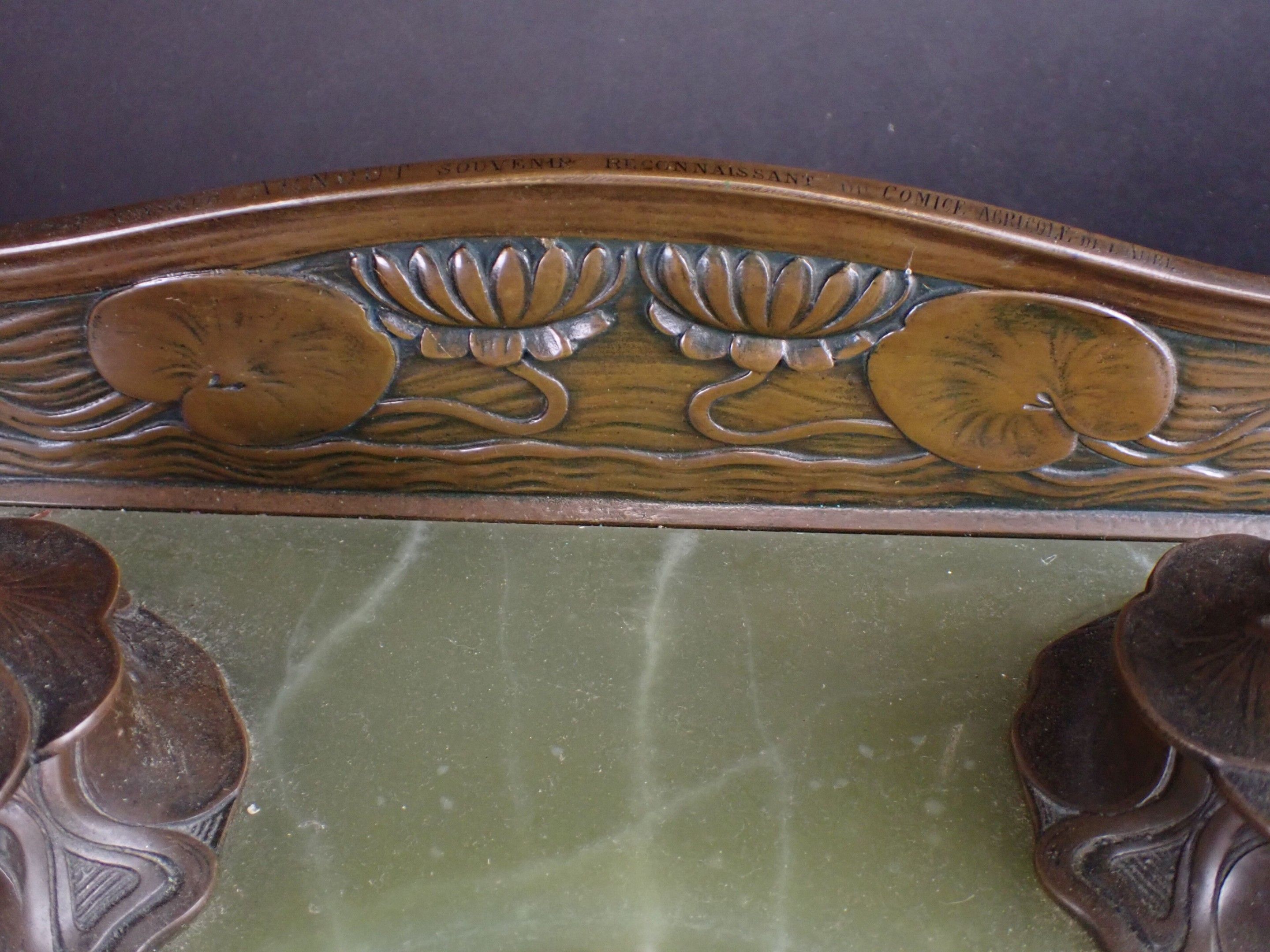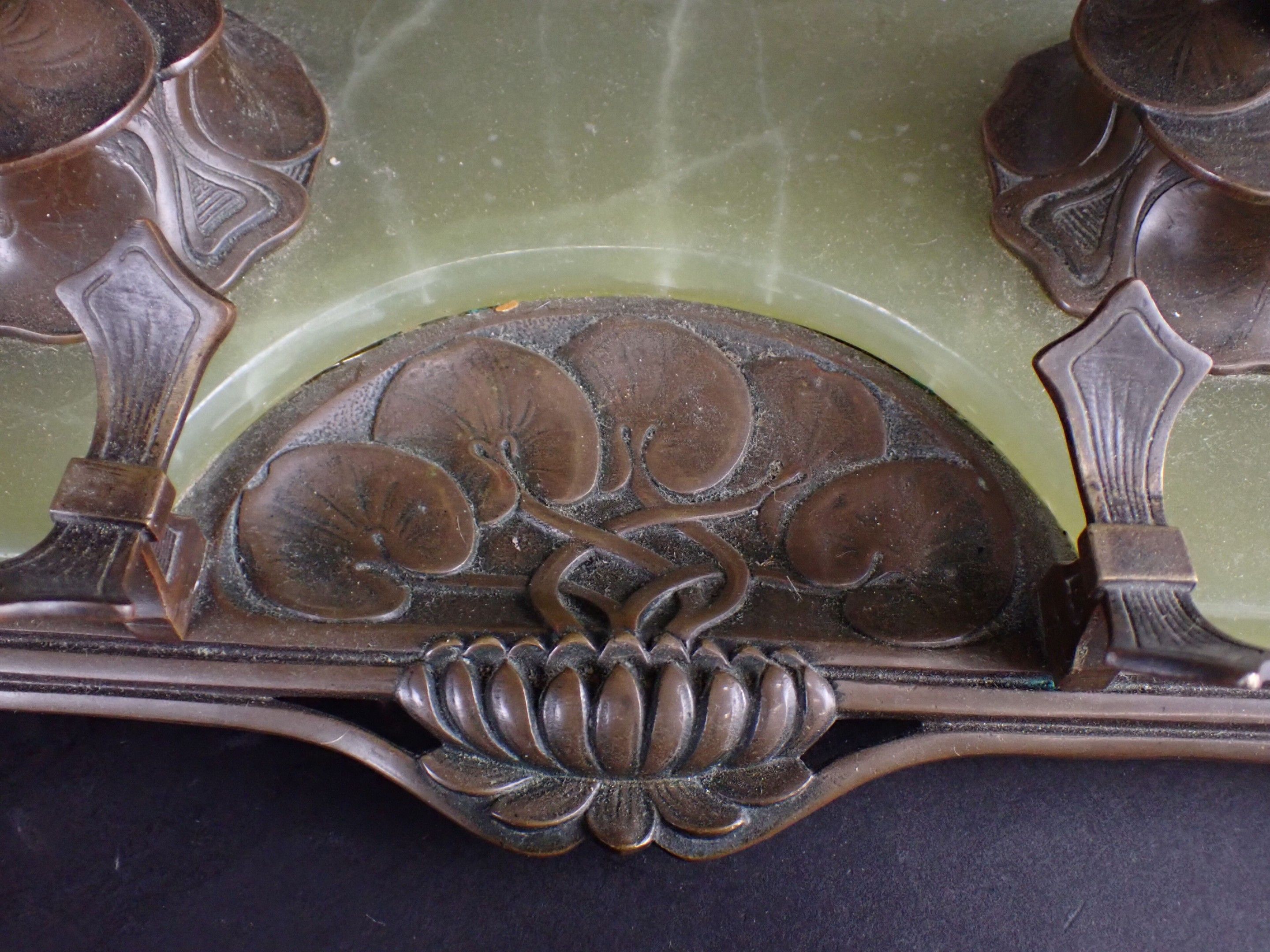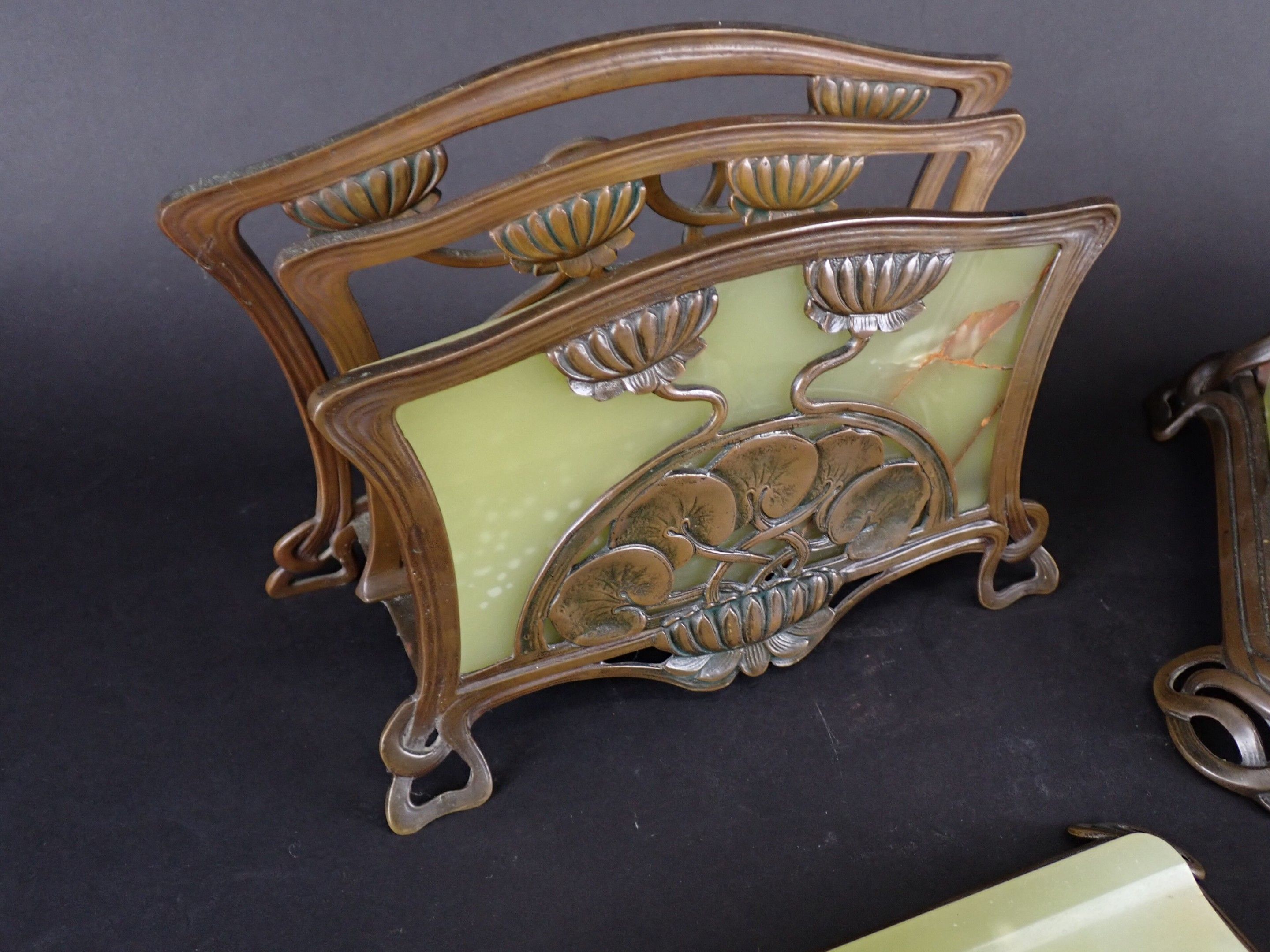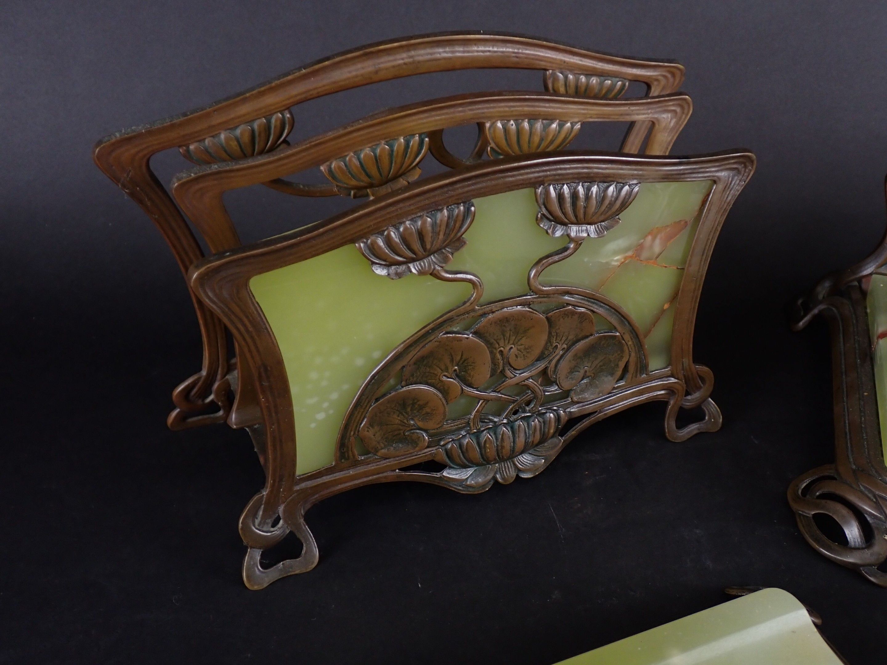 Art Nouveau desk set in bronze and green onyx decorated with water lilies, comprising: double inkwell, pen rest, letter tray, blotter. Art Nouveau period. Inkwell Dim: 10.5 x 36 x 19 cm Letter holder: 16 x 24 x 8 cm