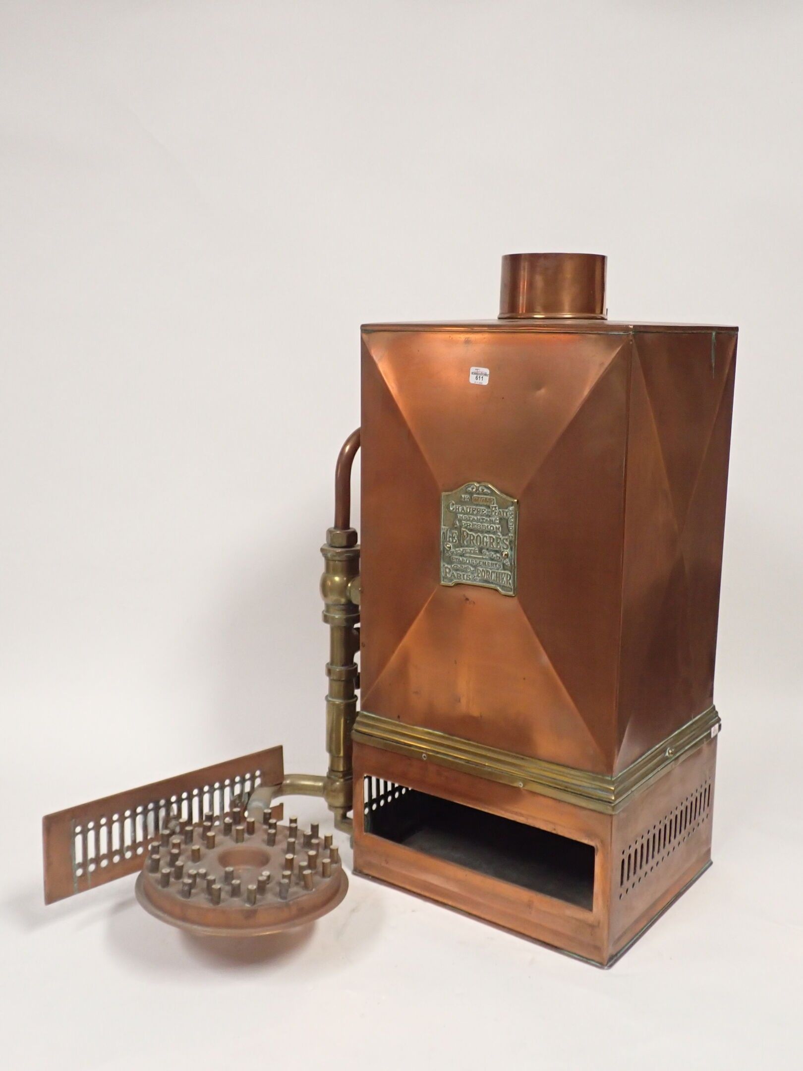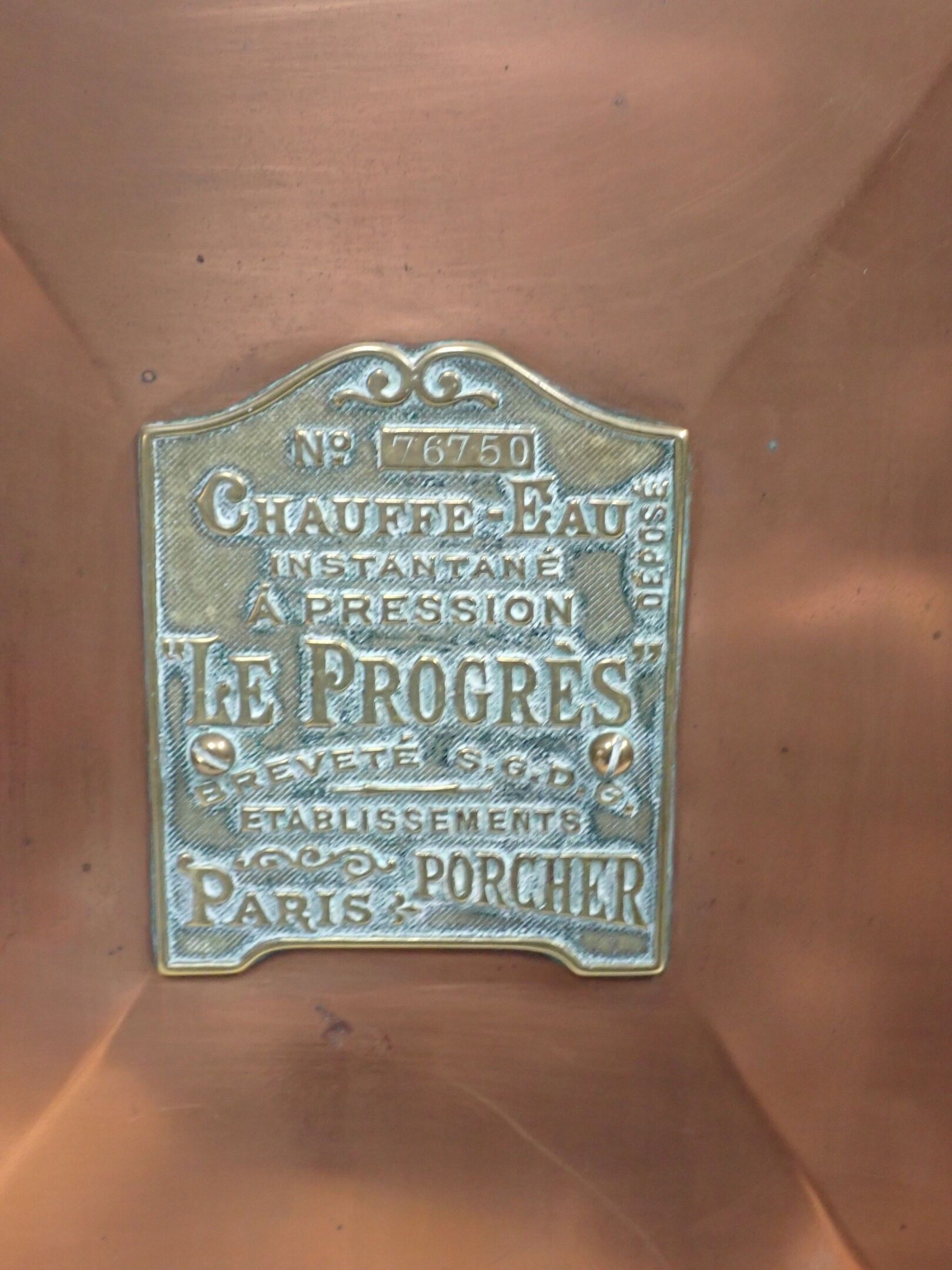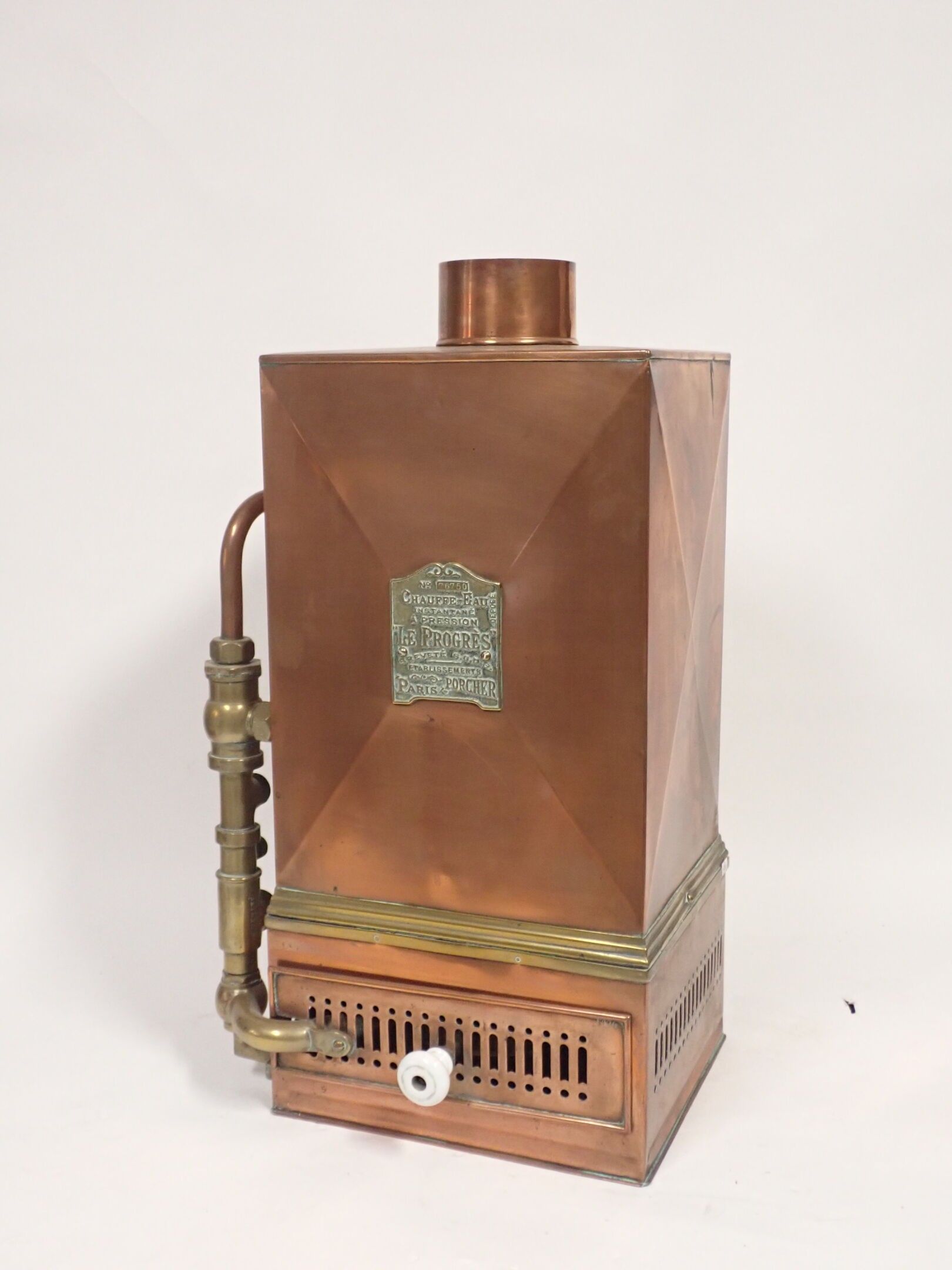 Early 20th century yellow and red copper pressure boiler with drawer for "Le Progrès" burners from the Porcher company. Height: 70 cm - Width: 41 cm - Depth: 29 cm