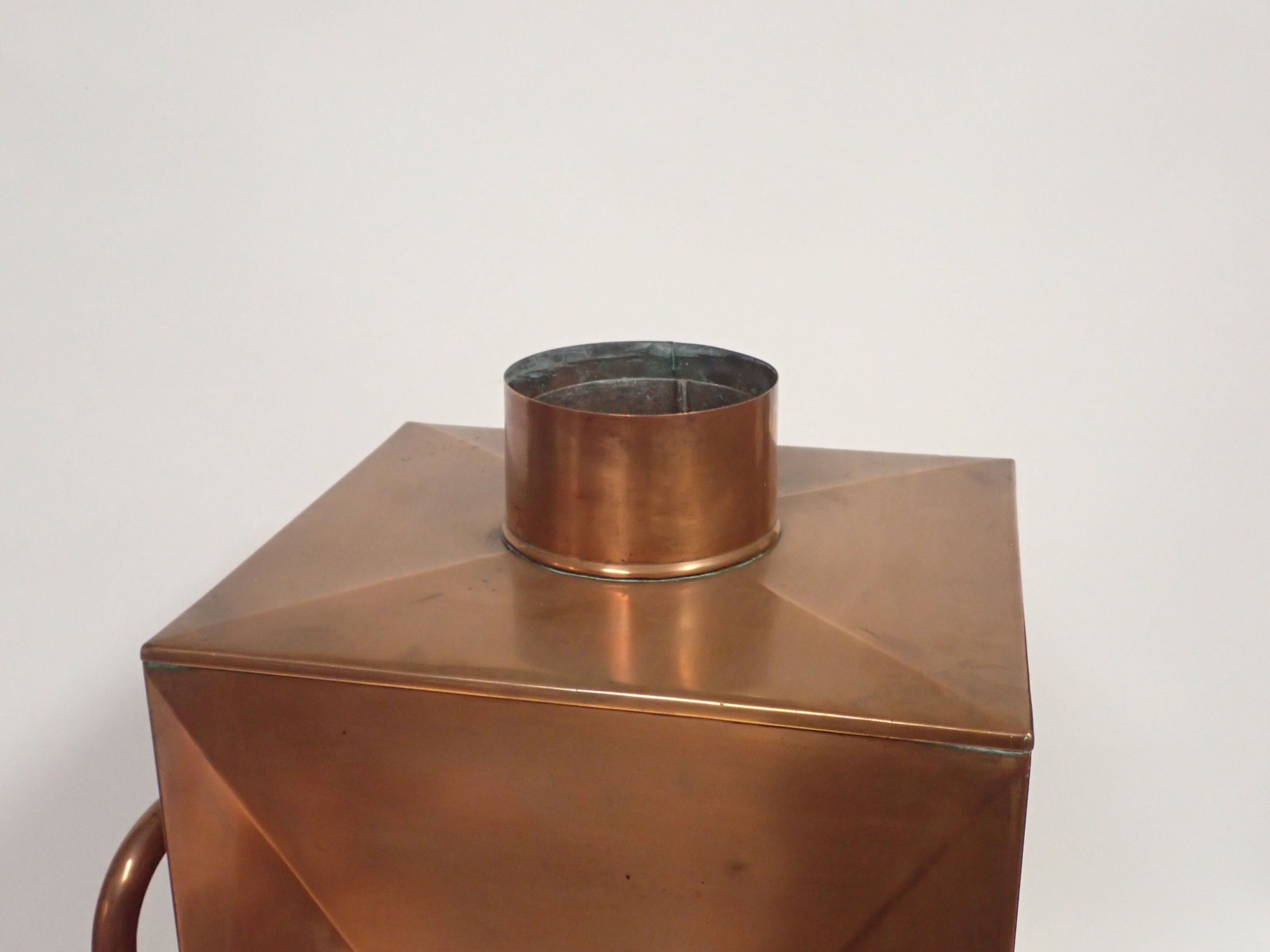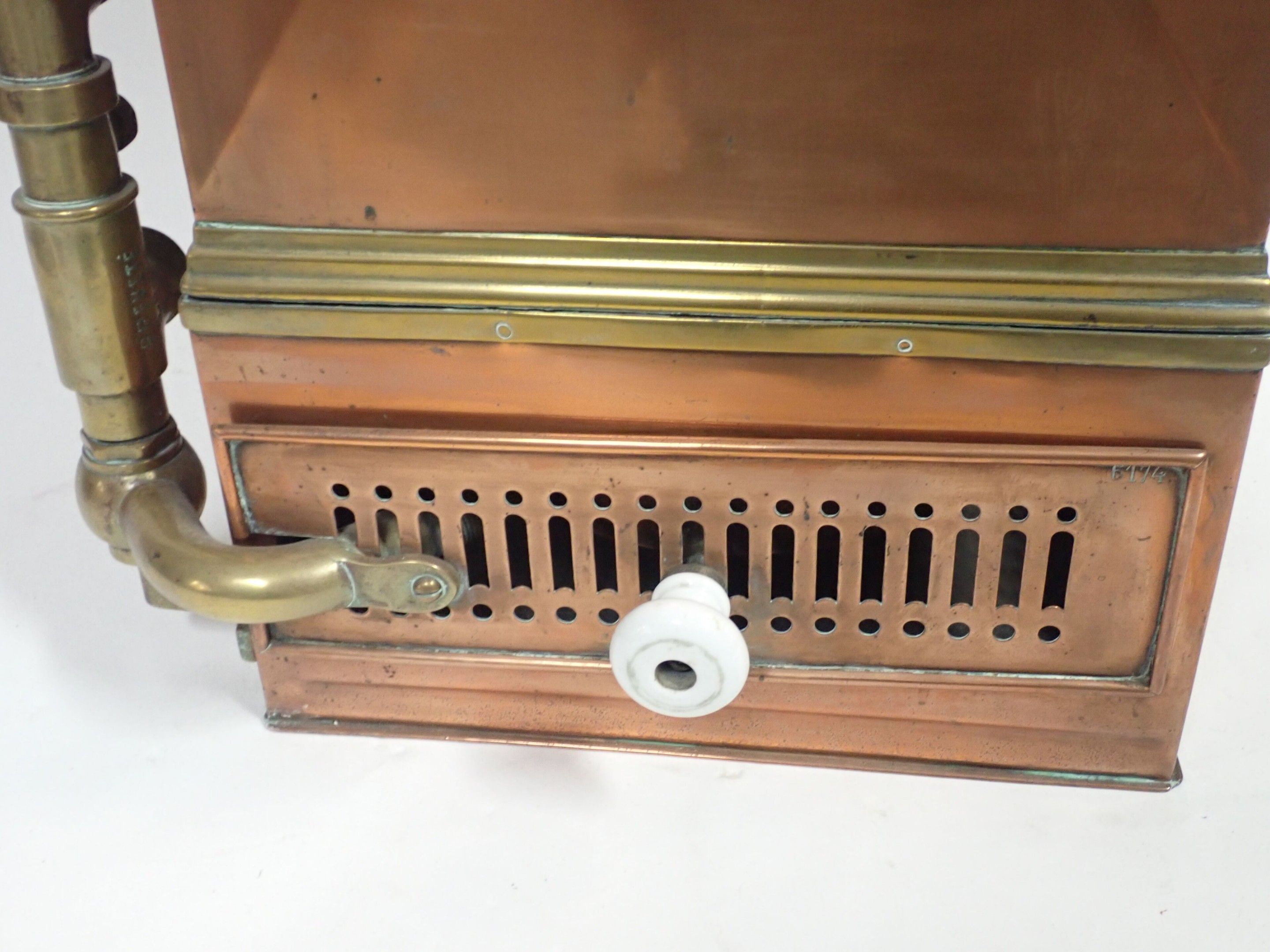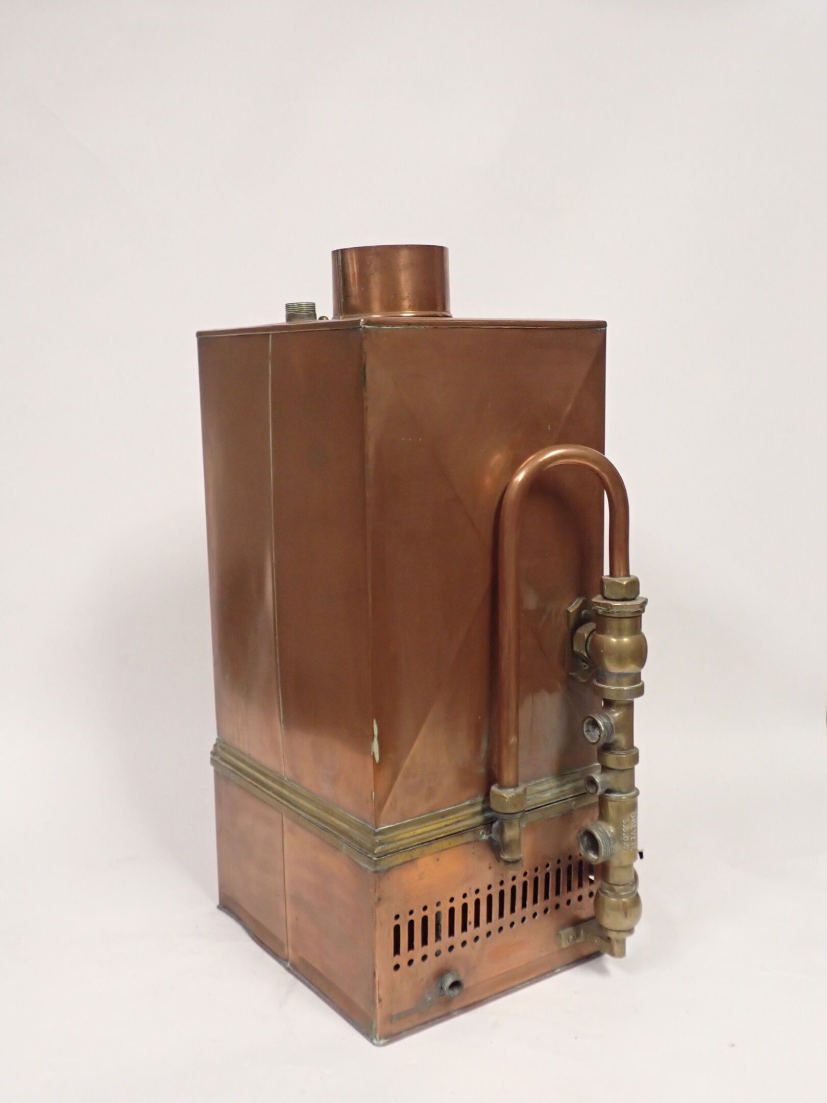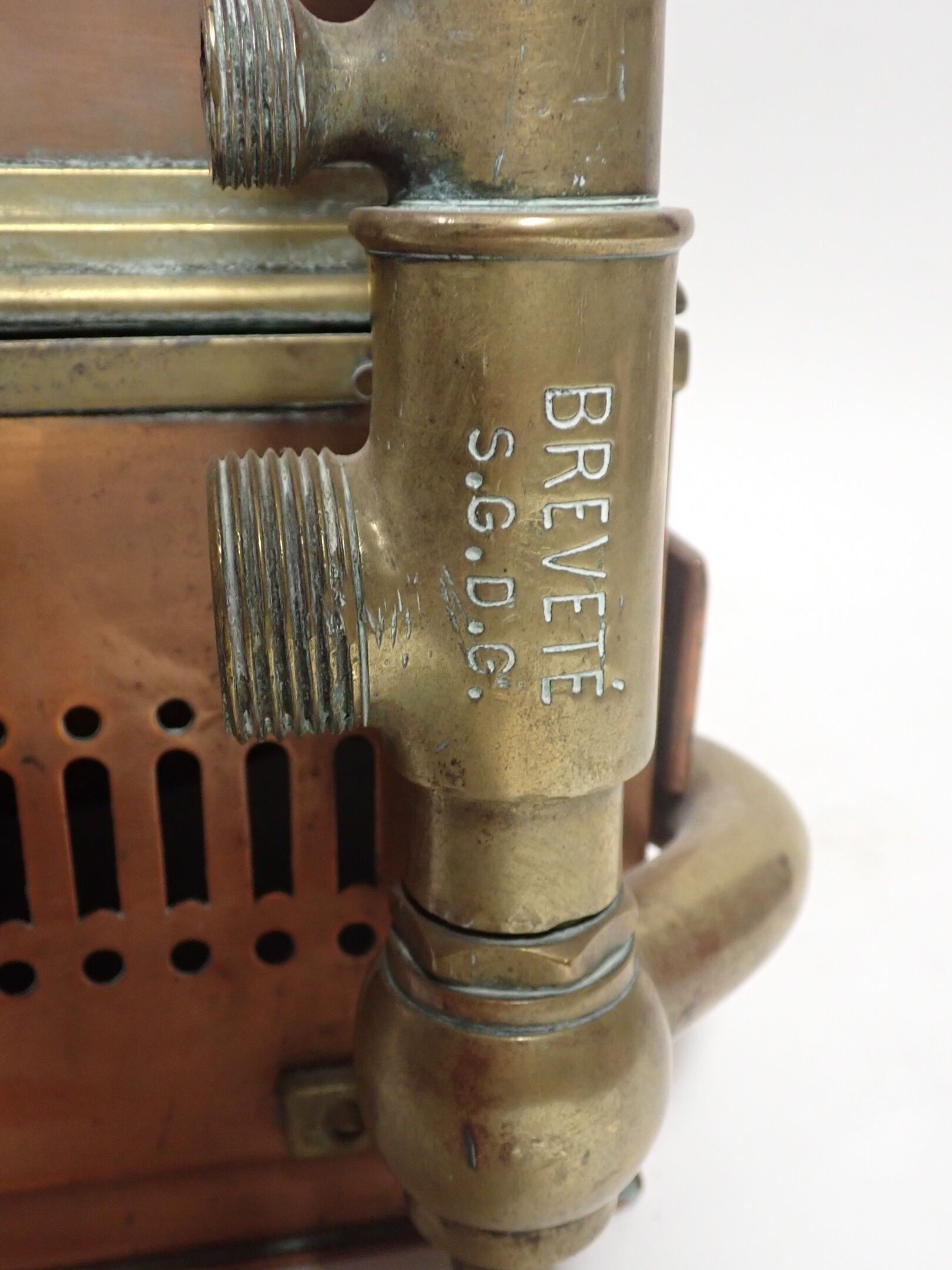Early 20th century yellow and red copper pressure boiler with drawer for "Le Progrès" burners from the Porcher company. Height: 70 cm - Width: 41 cm - Depth: 29 cm