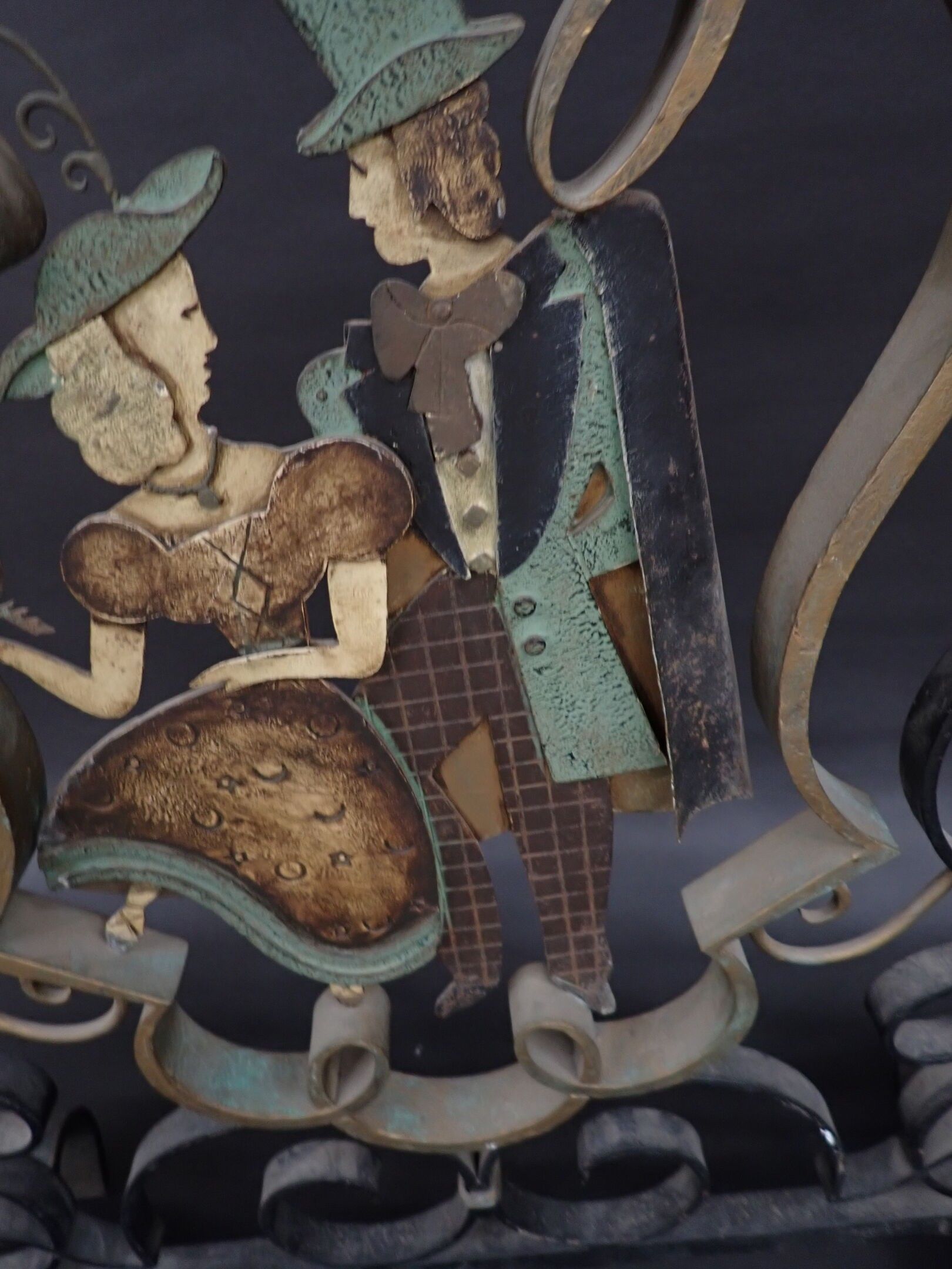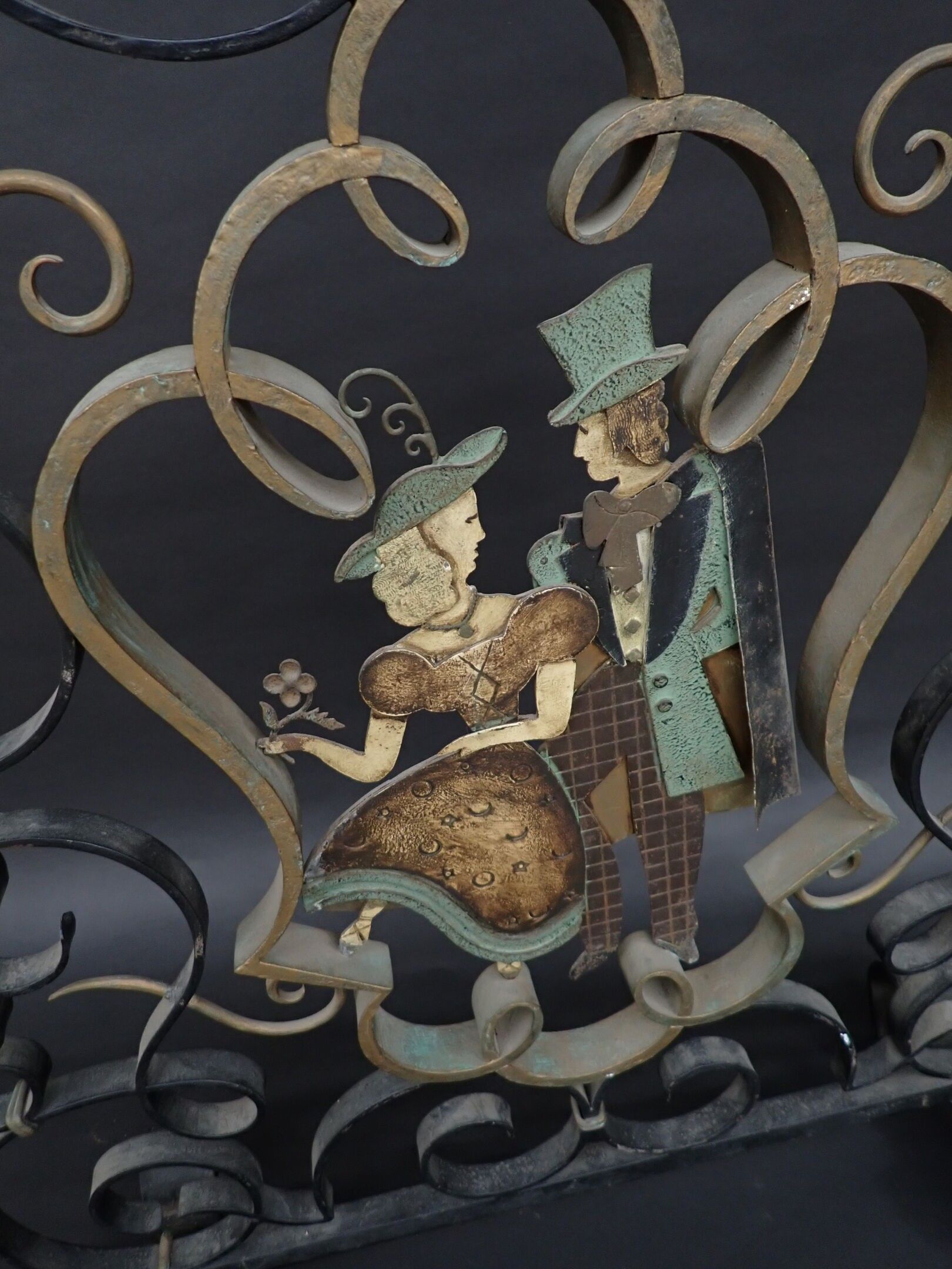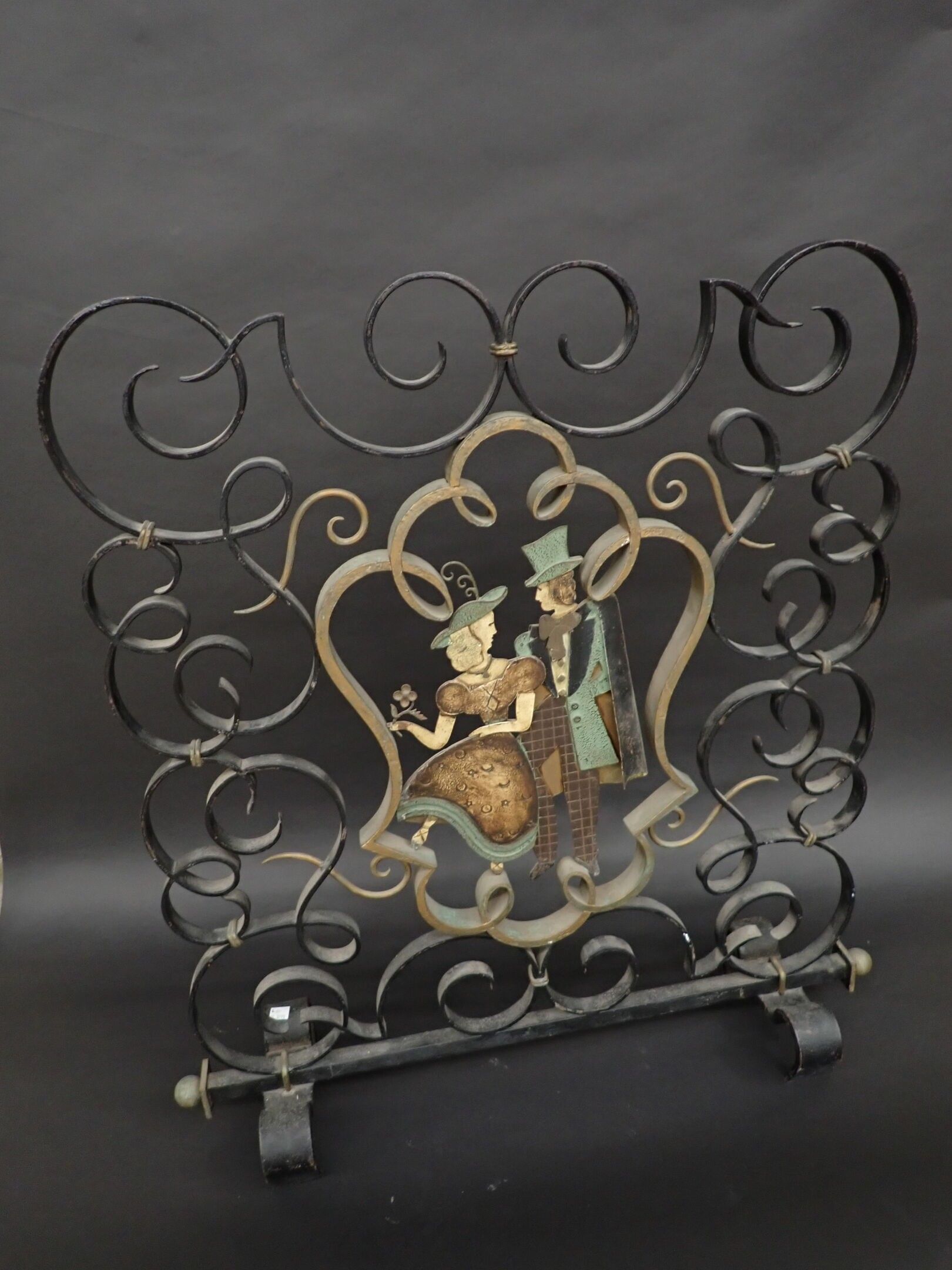 In the style of Raymond SUBES: Flat, patinated wrought iron figurative mantel screen adorned with large symmetrical scrolls and spirals and a central medallion depicting a couple, on a low mounting bar with scrolled side feet. Worked around 1950