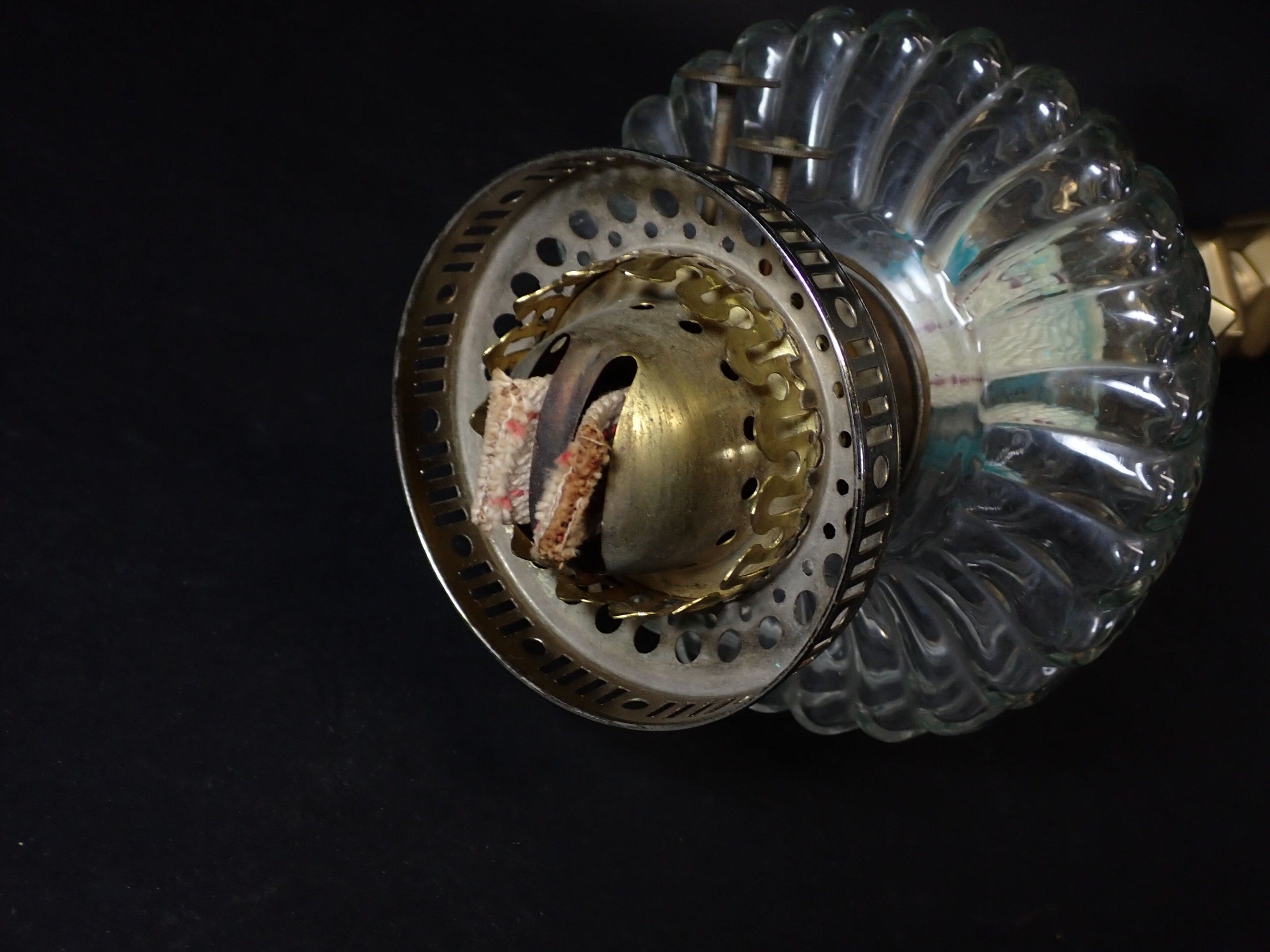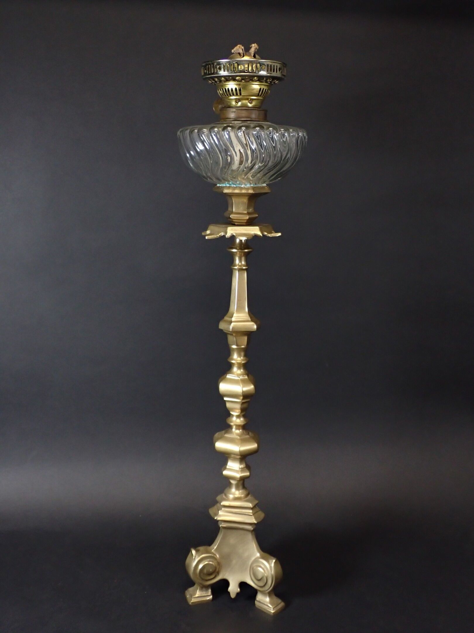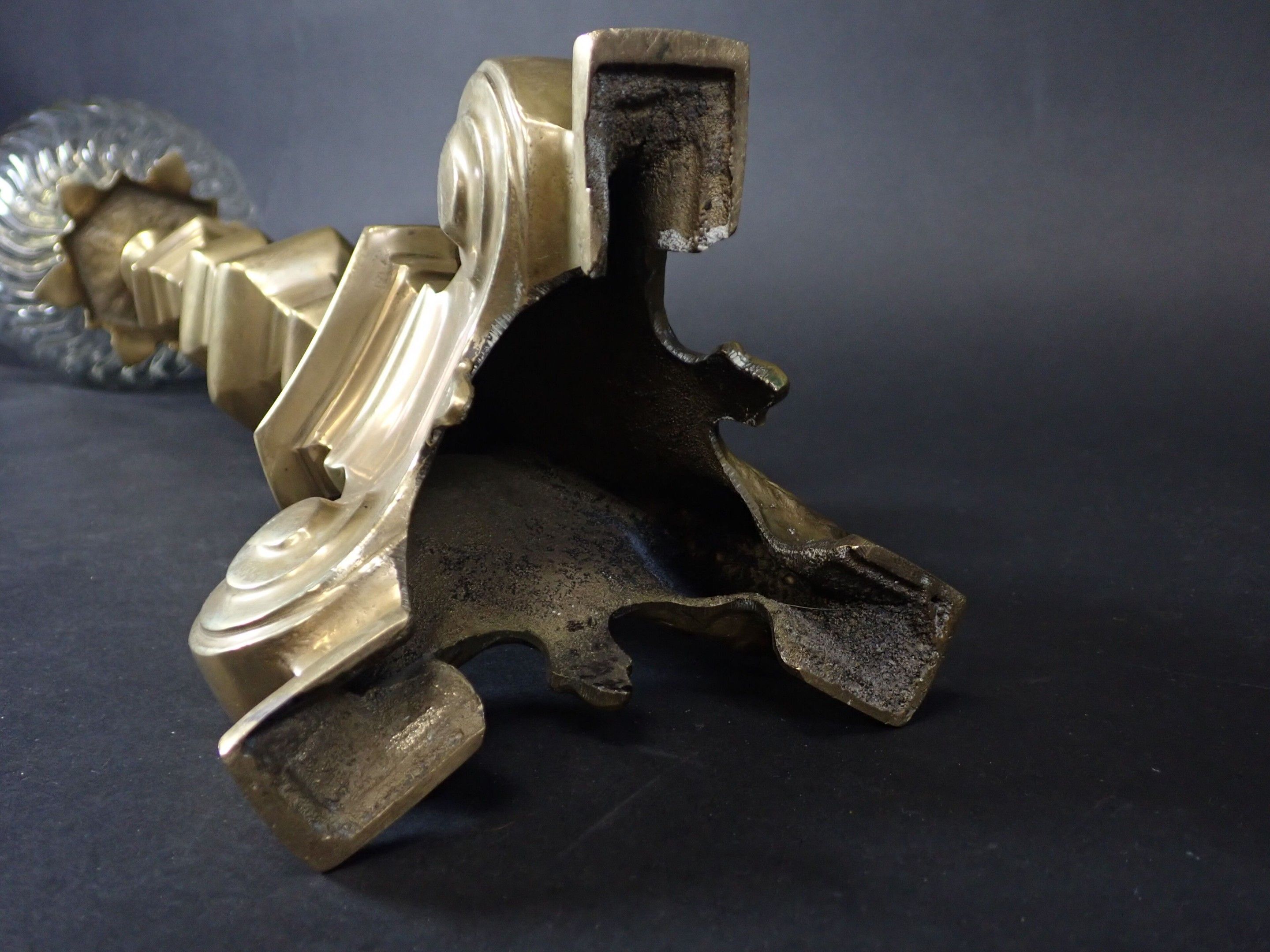 Tripod bronze candlestick mounted with a moulded glass lamp …