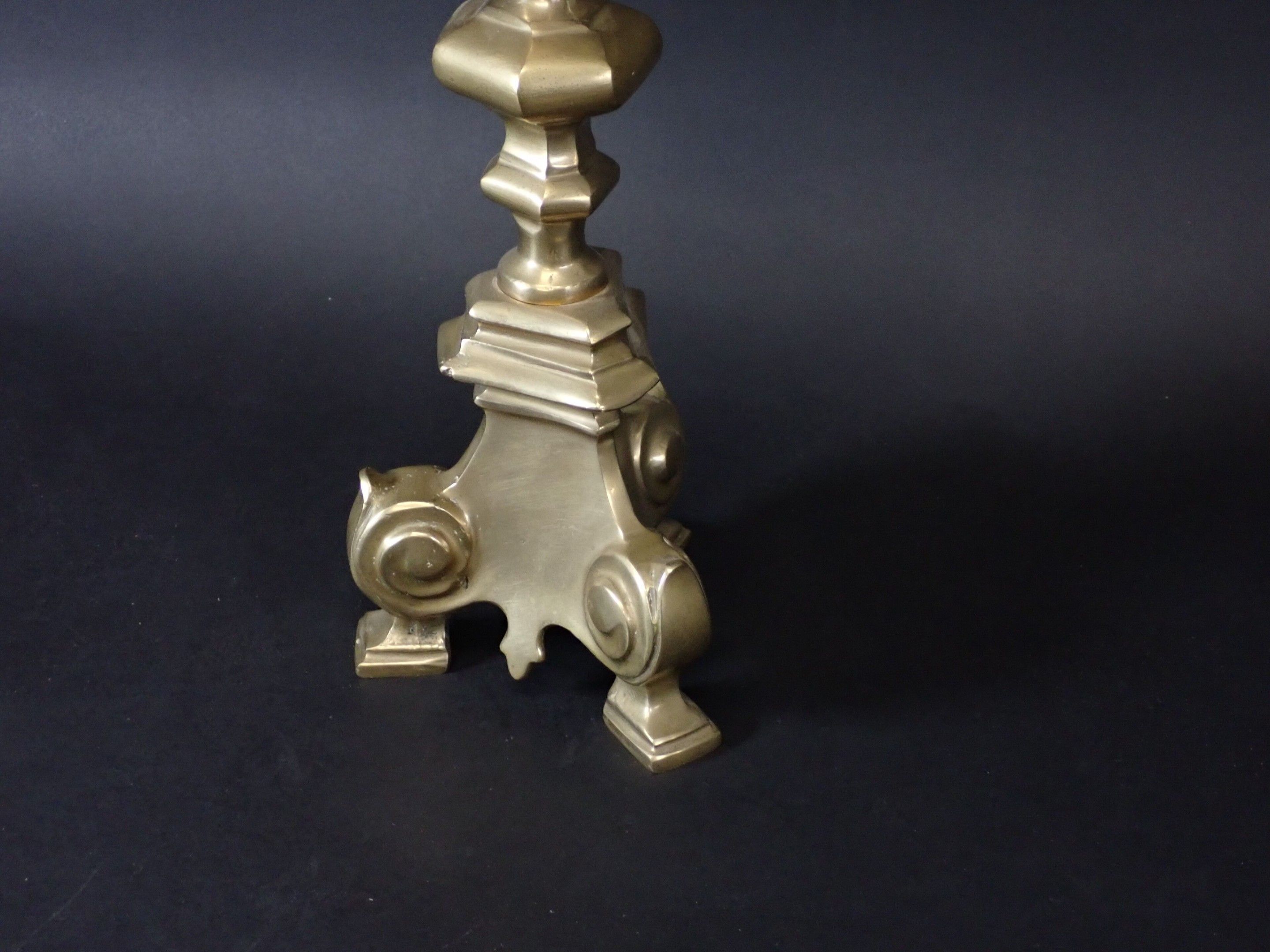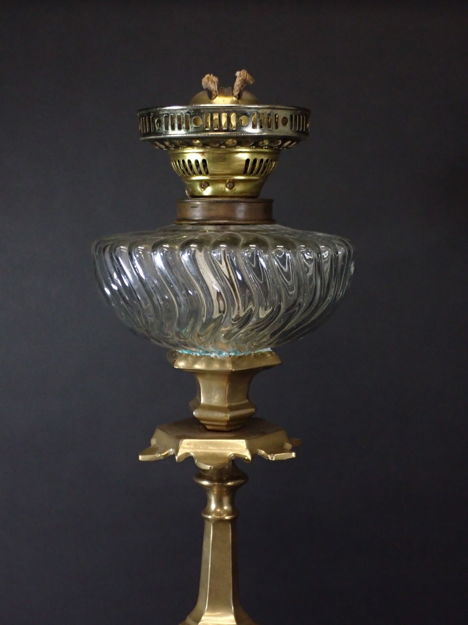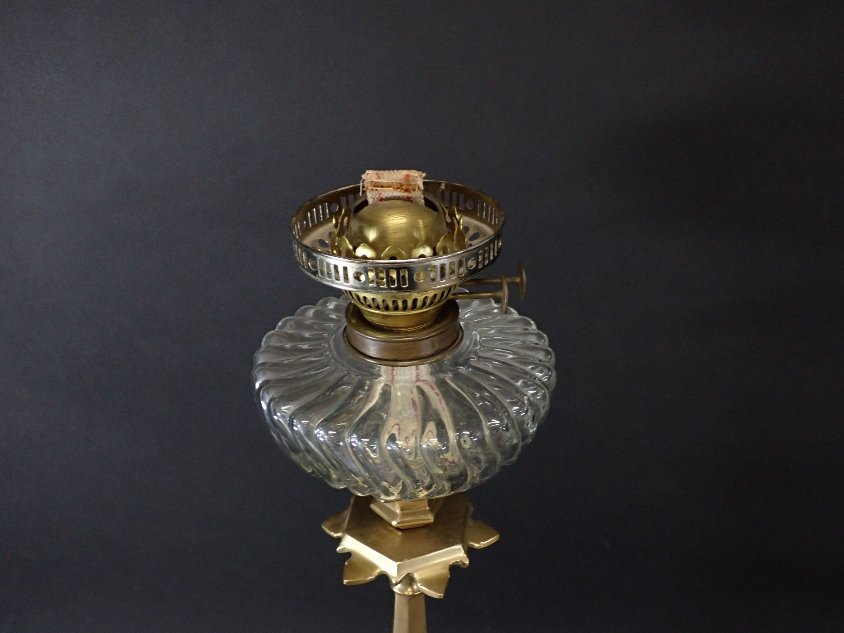 Tripod bronze candlestick mounted with a moulded glass lamp …