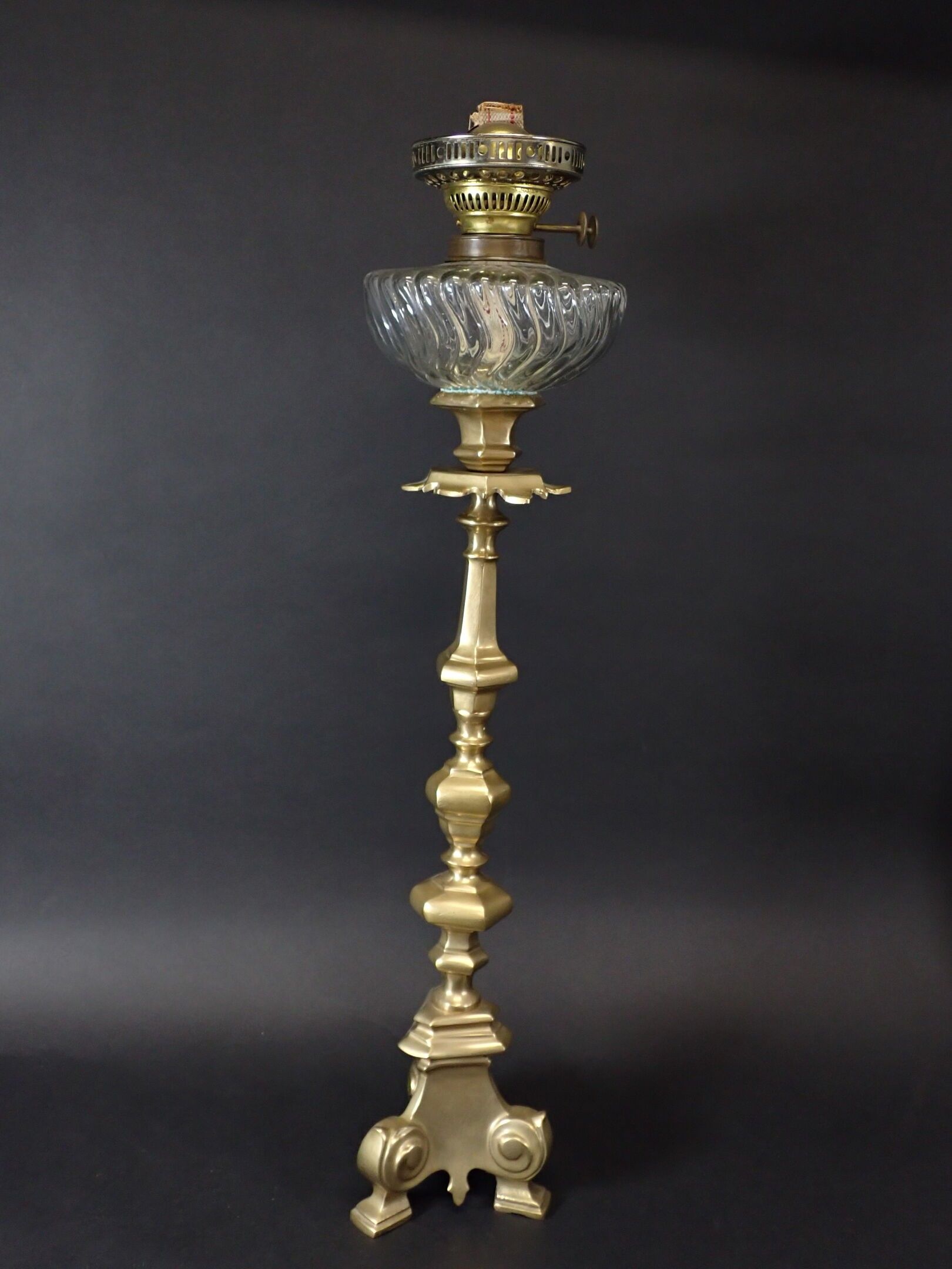 Tripod bronze candlestick mounted with a moulded glass lamp body. Height: 73 cm