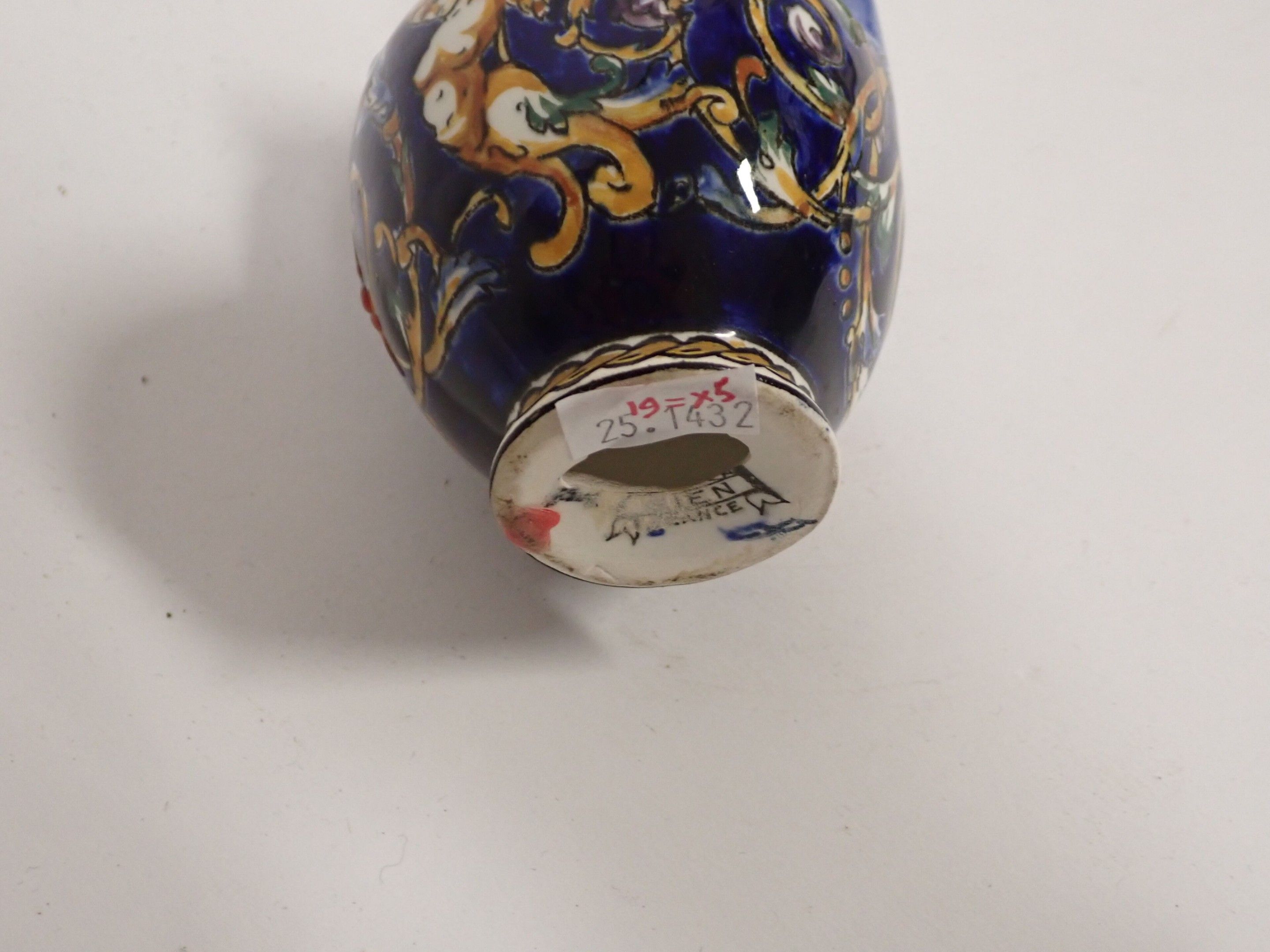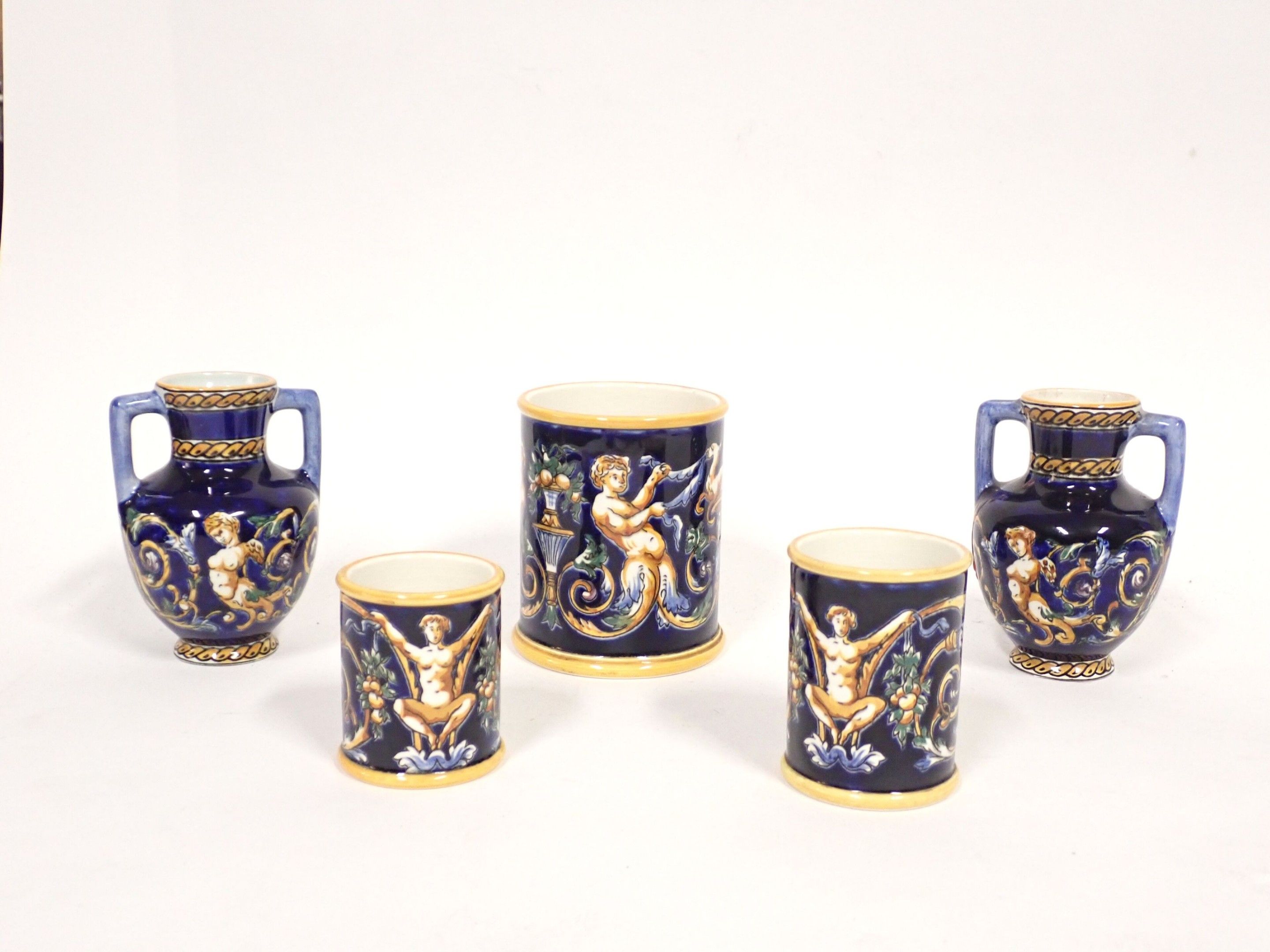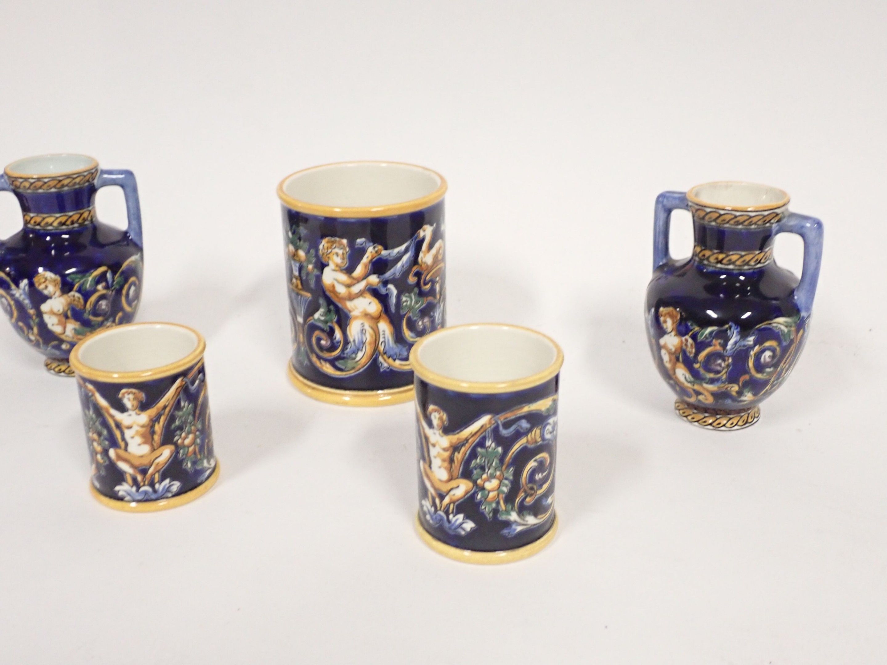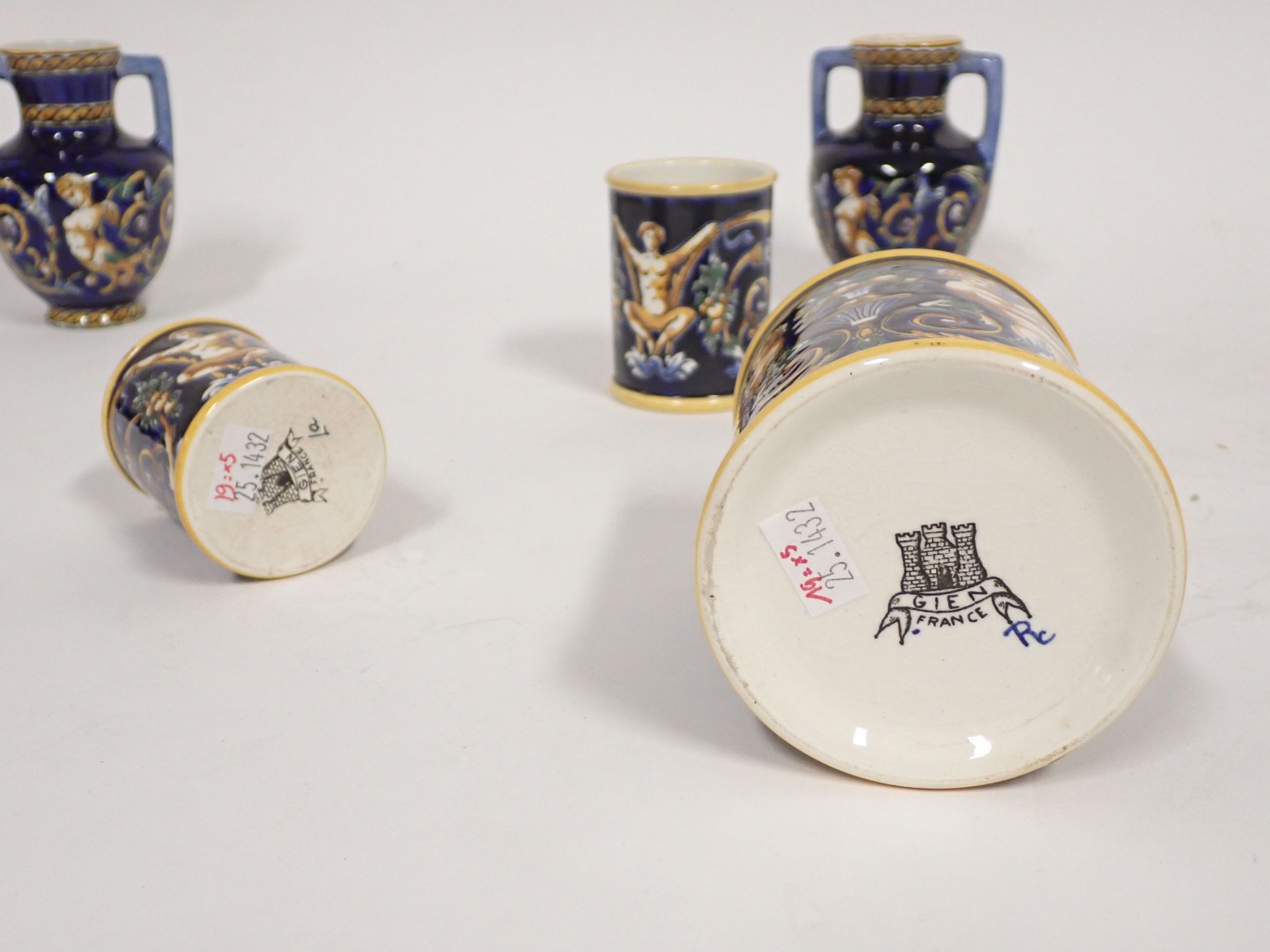 GIEN. An earthenware lot with Renaissance style decoration on a blue background comprising: 5 small objects, various pots, vases. Height: 6 and 10 cm. Height: 10 and 11 cm