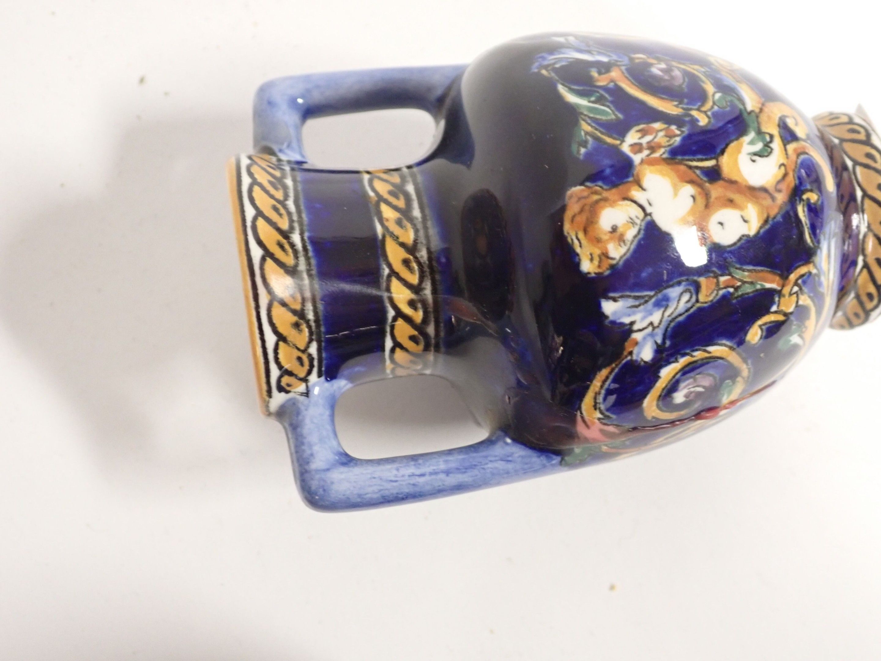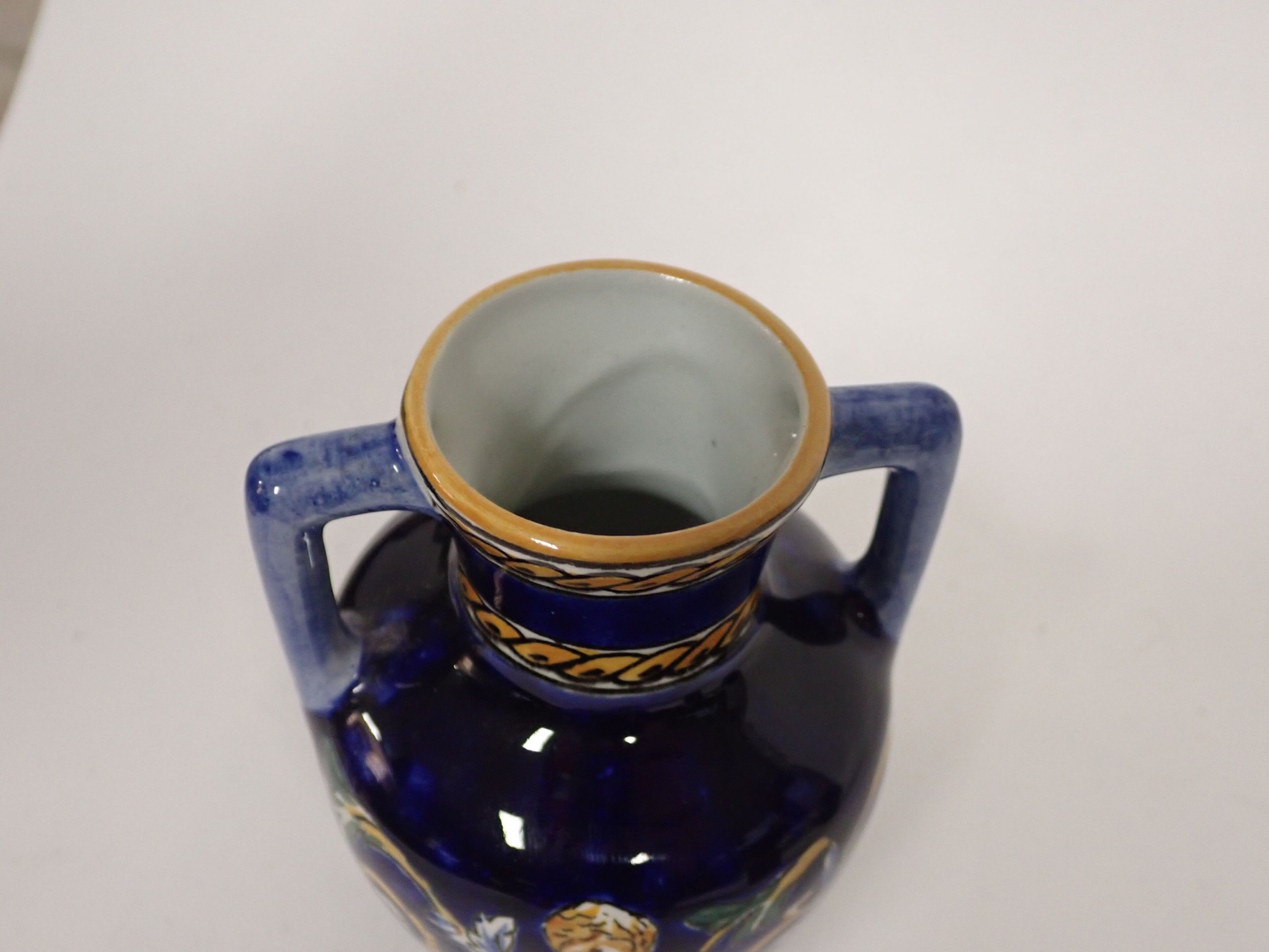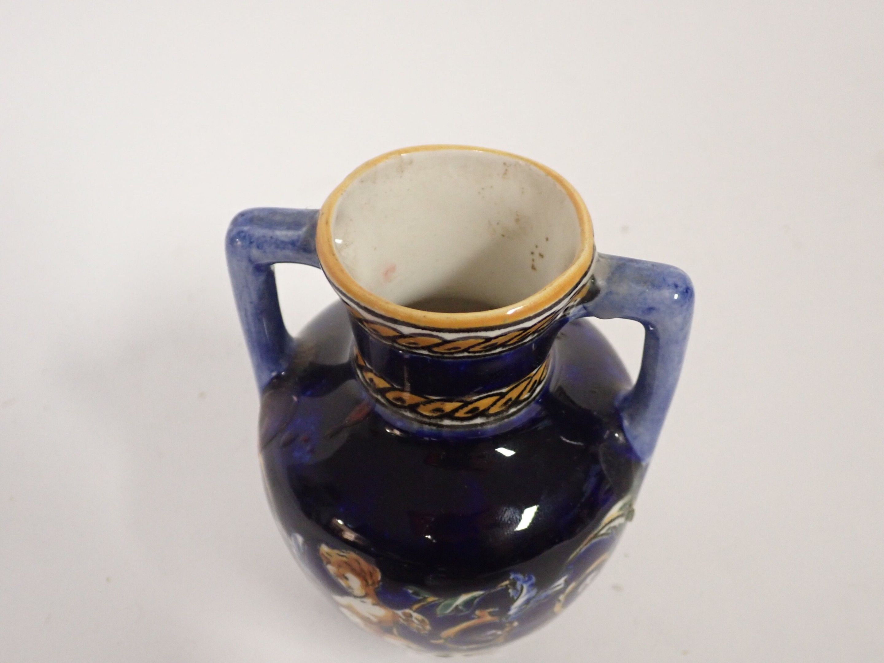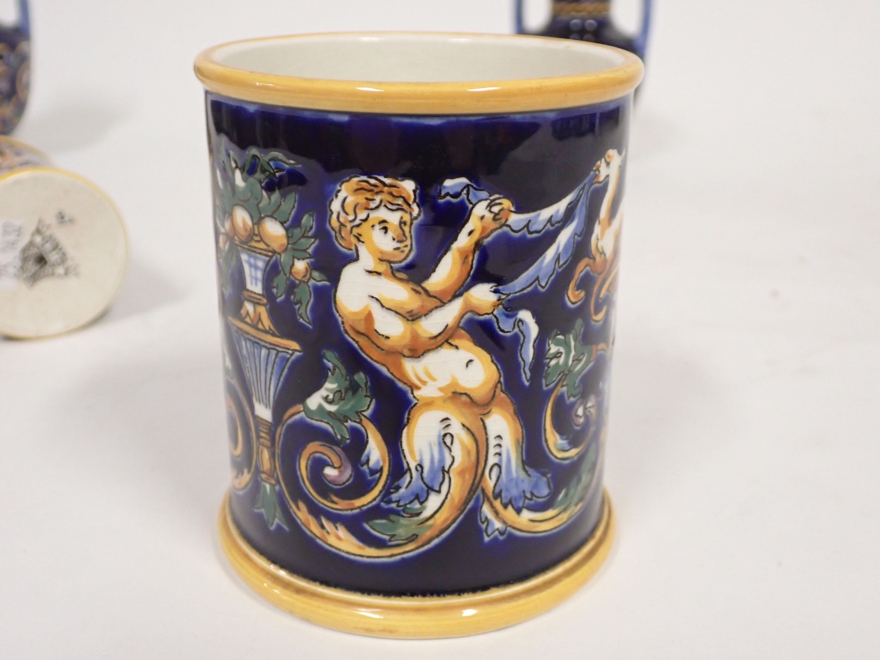 GIEN. An earthenware lot with Renaissance style decoration on a blue background comprising: 5 small objects, various pots, vases. Height: 6 and 10 cm. Height: 10 and 11 cm