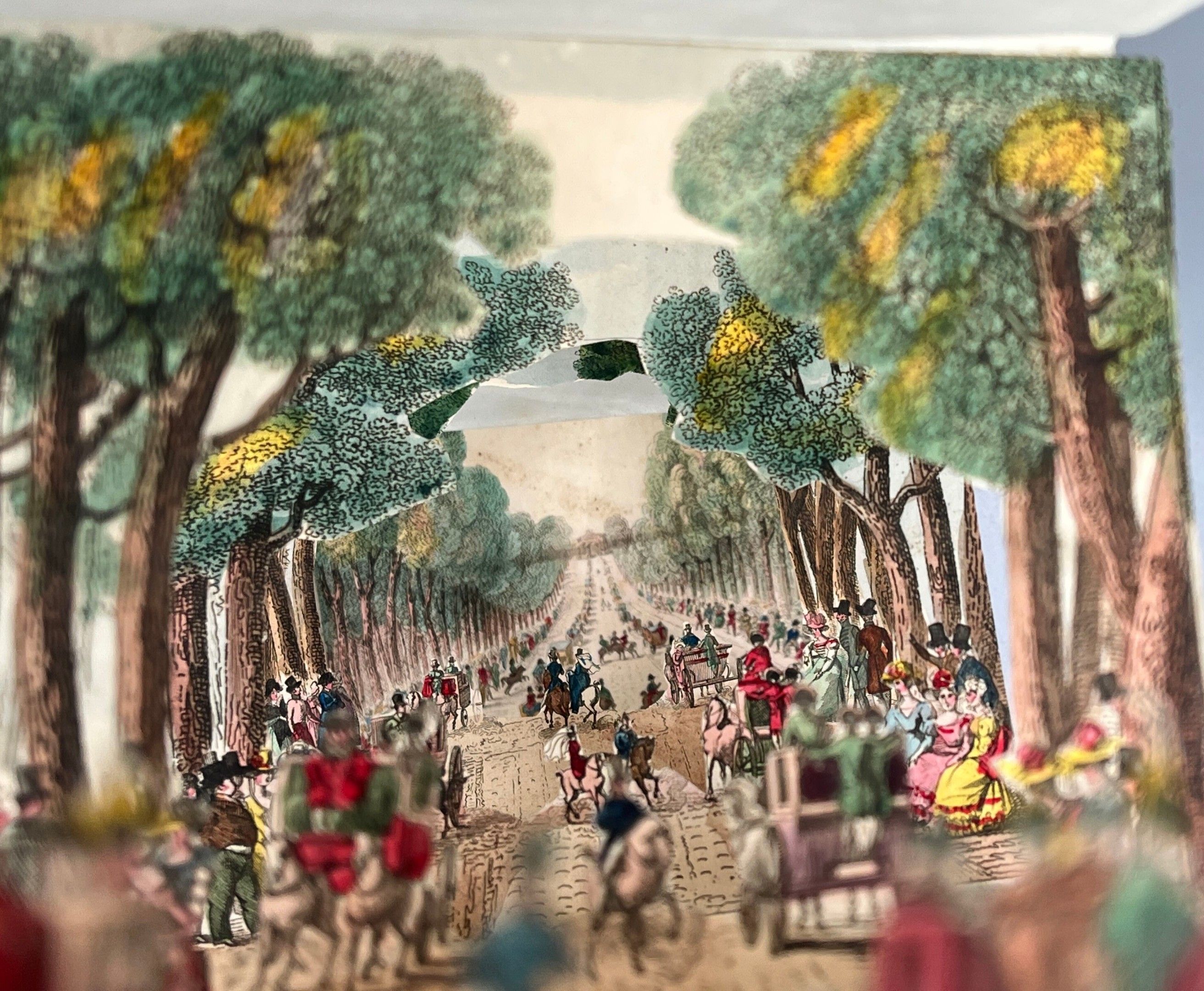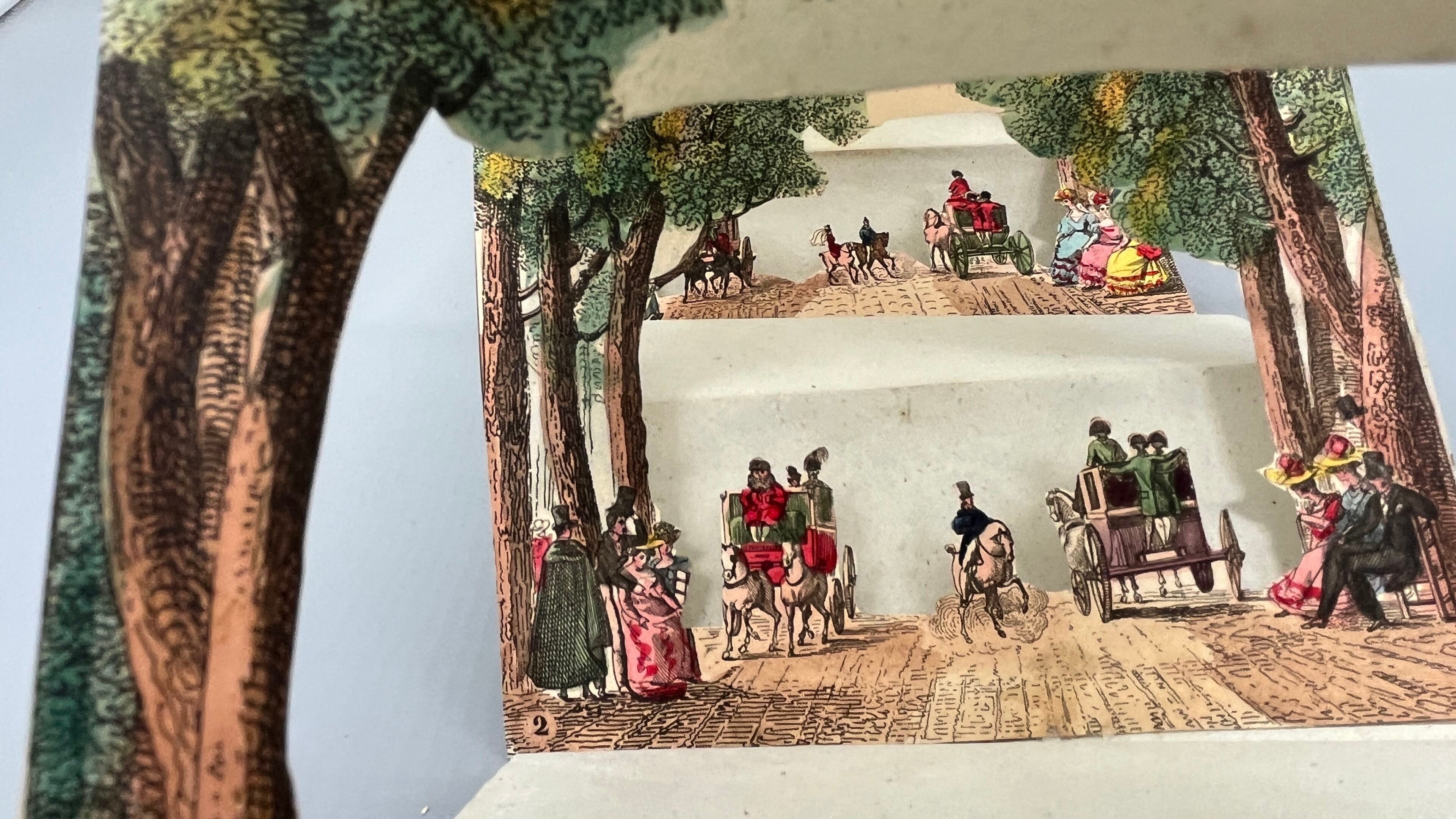It shows a scene of elegant strolling, animated by cabriolets, carriages, horsemen, bourgeois and nobles strolling under the trees of the avenue, typical of 19thᵉ century worldly Paris. The first and last plates, mounted on cardboard, form the hard slipcase.