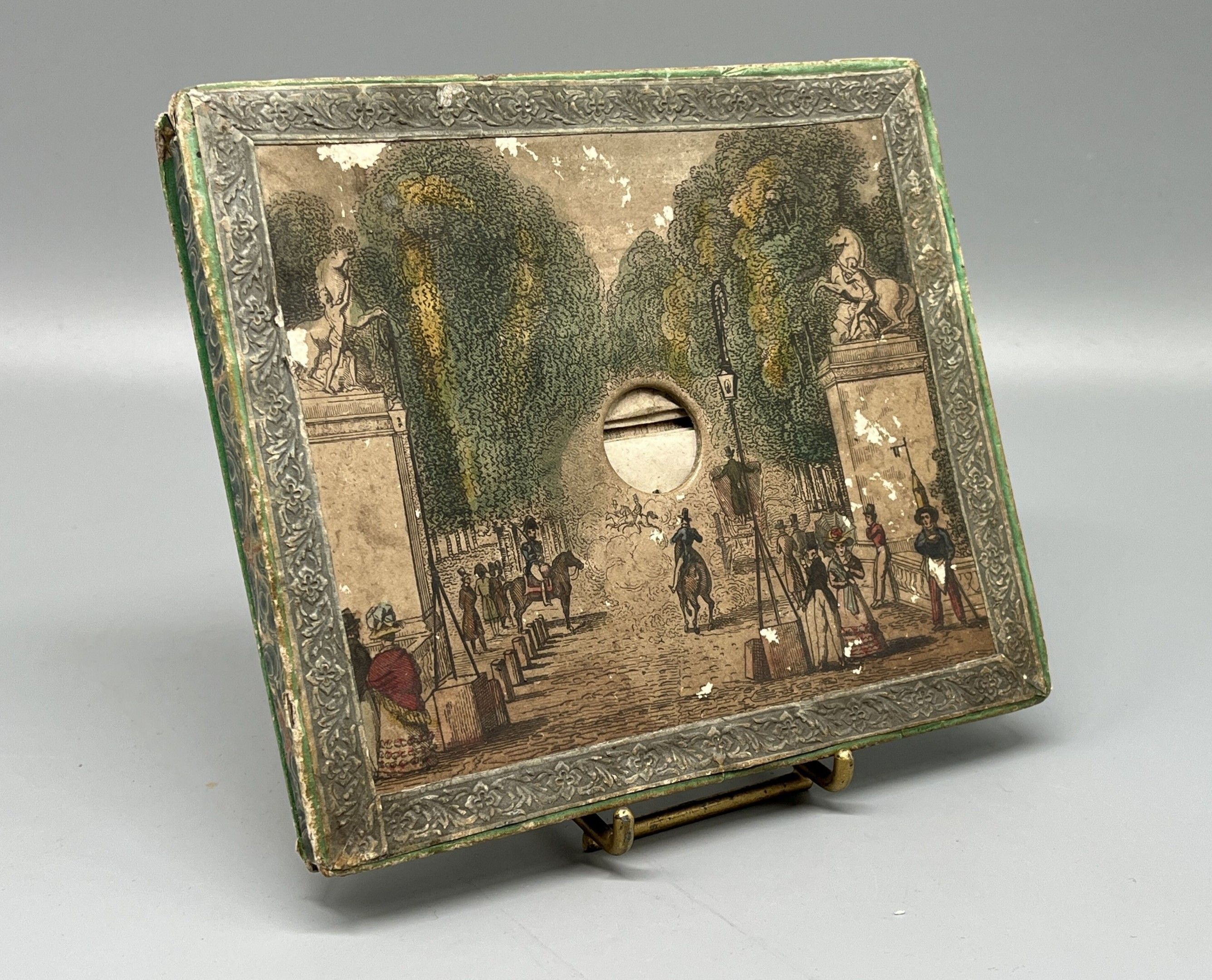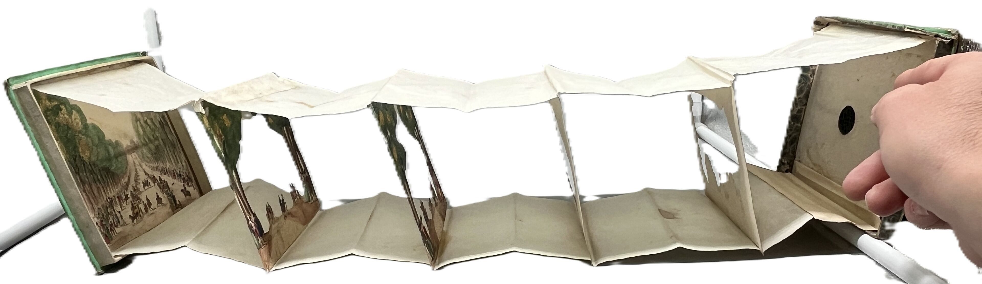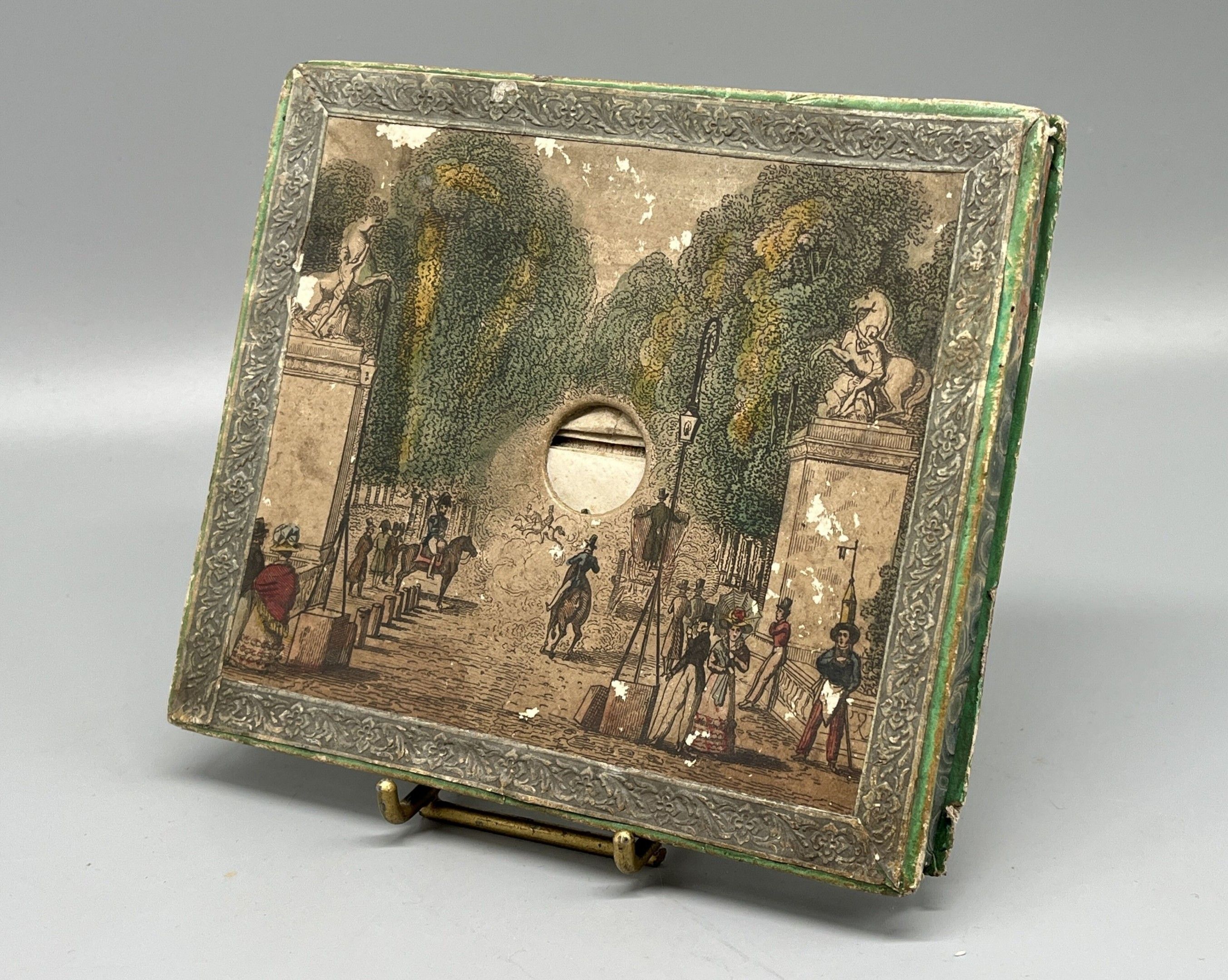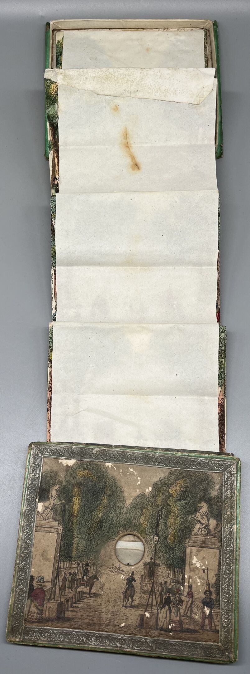 A rare animated optical view made up of six successive planes cut out and mounted on bellows, forming a scene in depth to be observed through an oculus pierced in the cover.