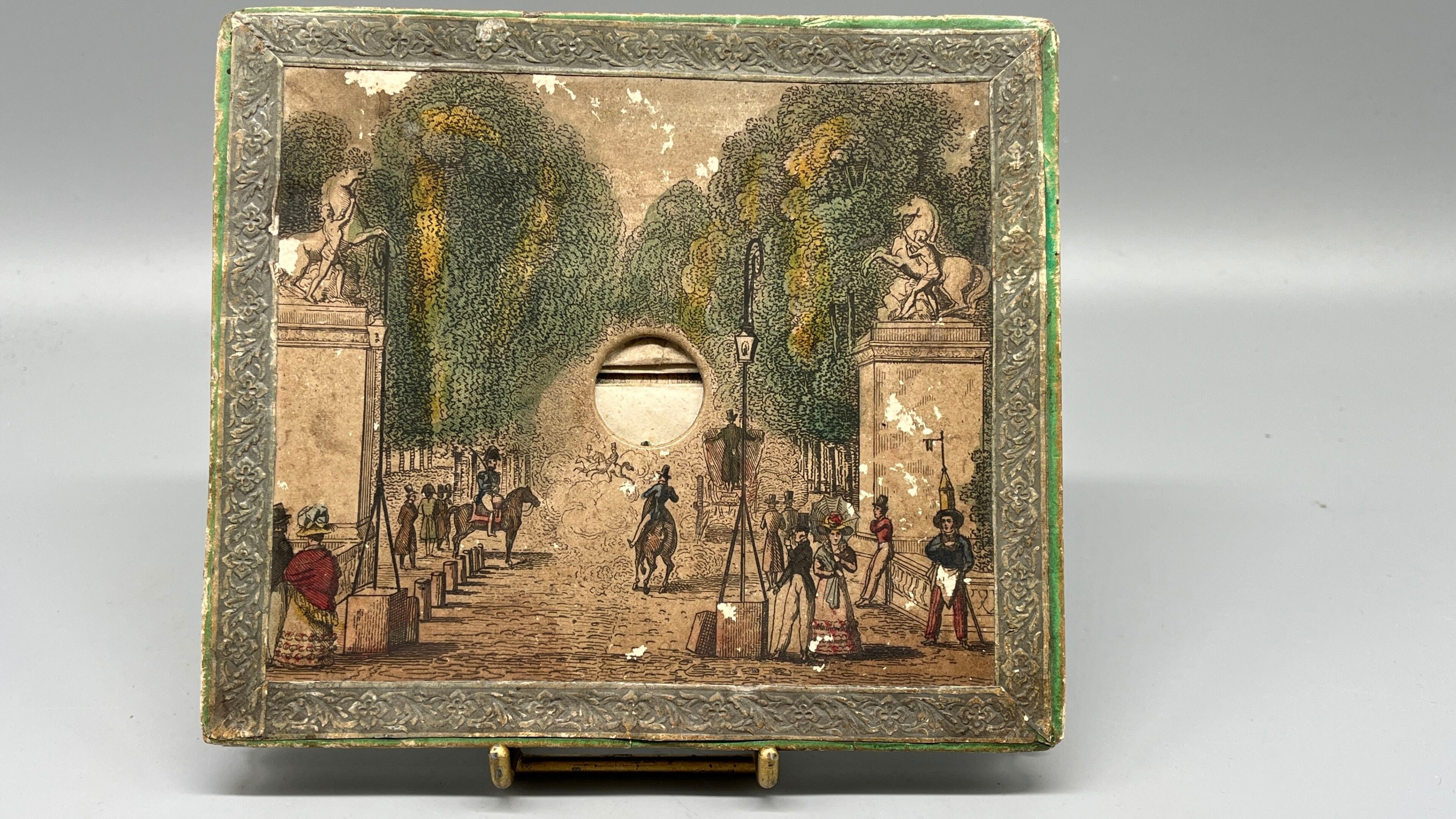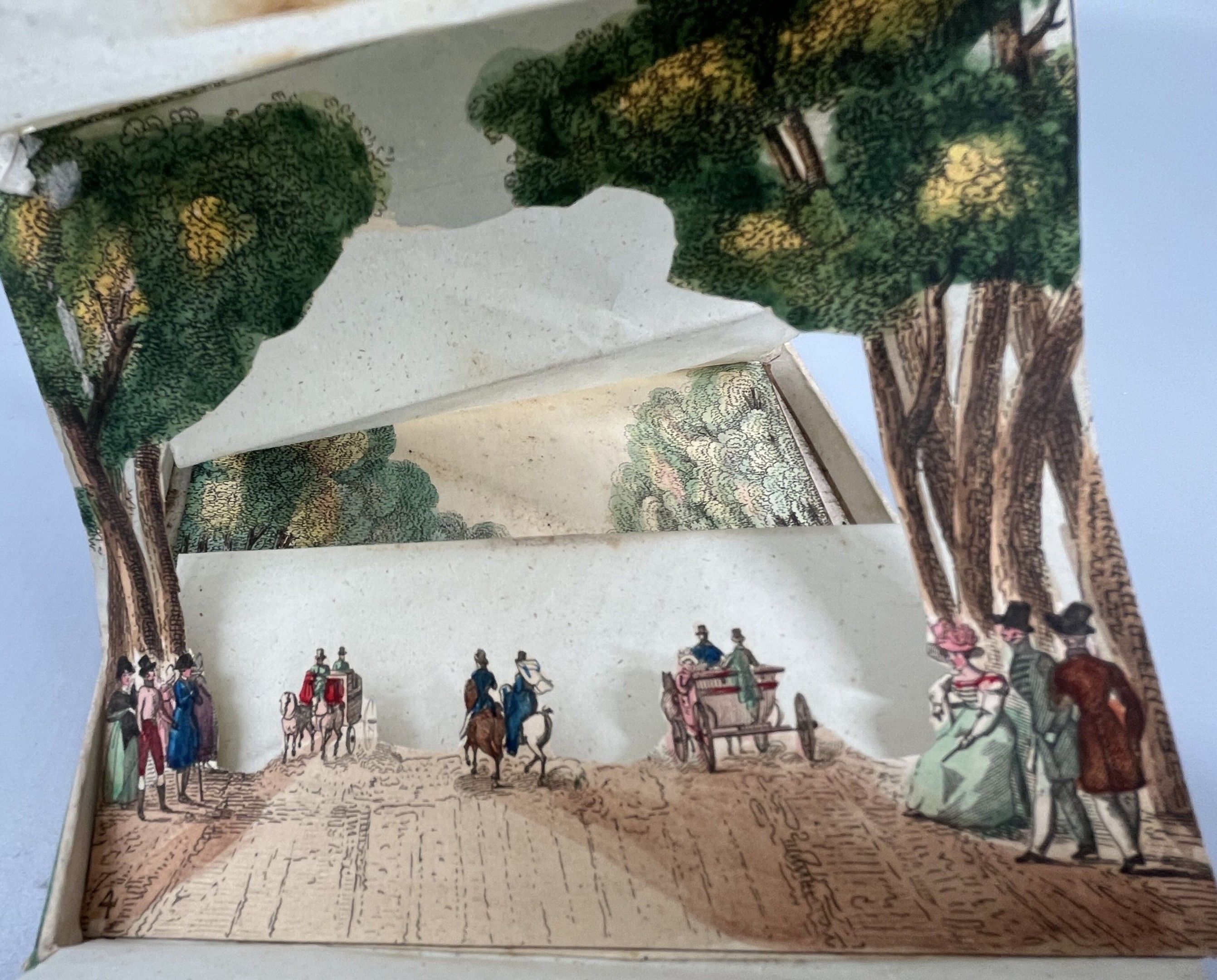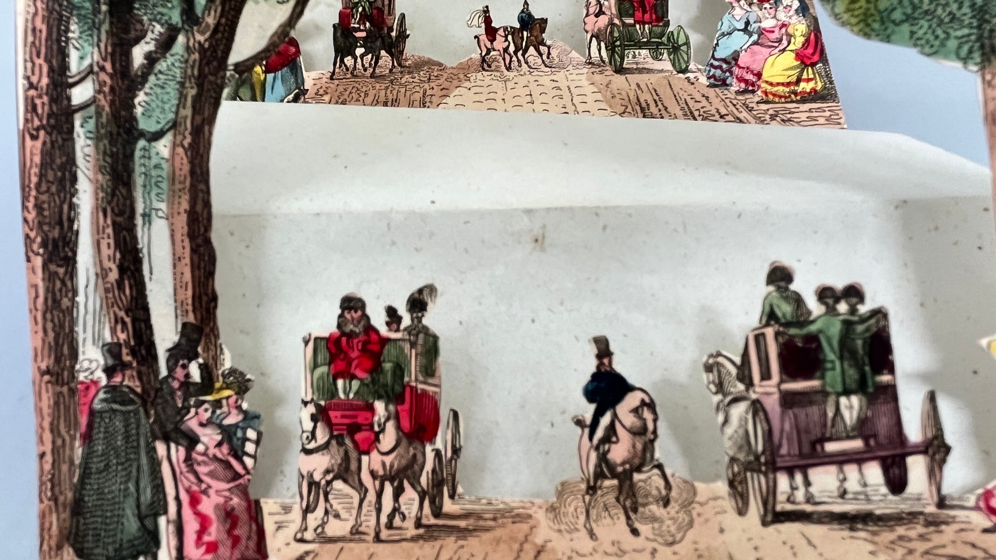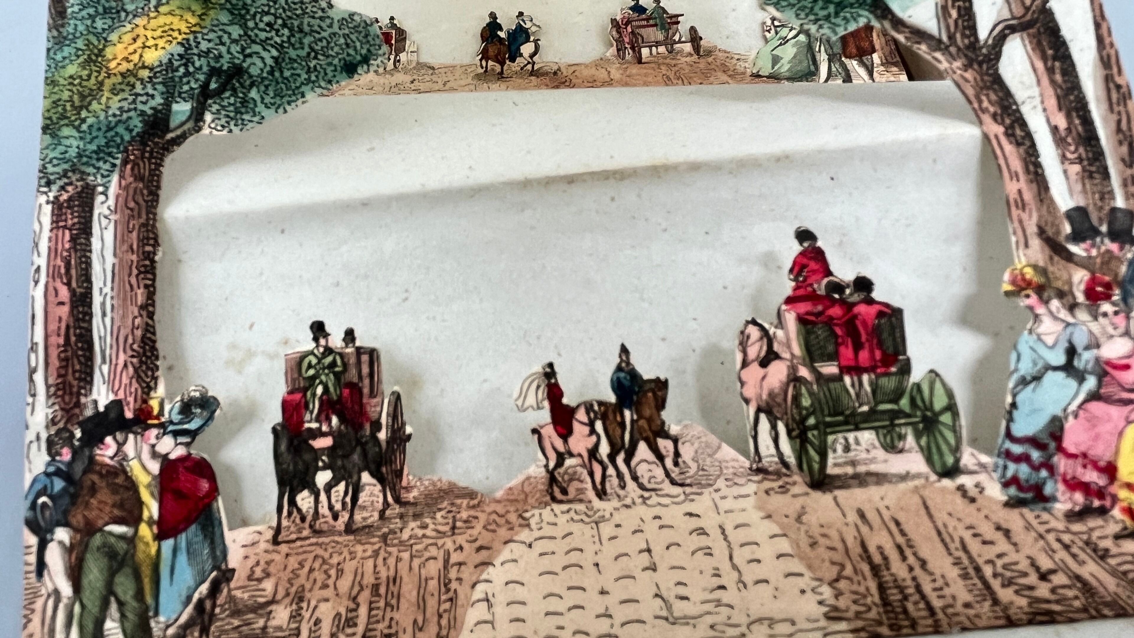 A rare animated optical view made up of six successive planes cut out and mounted on bellows, forming a scene in depth to be observed through an oculus pierced in the cover.