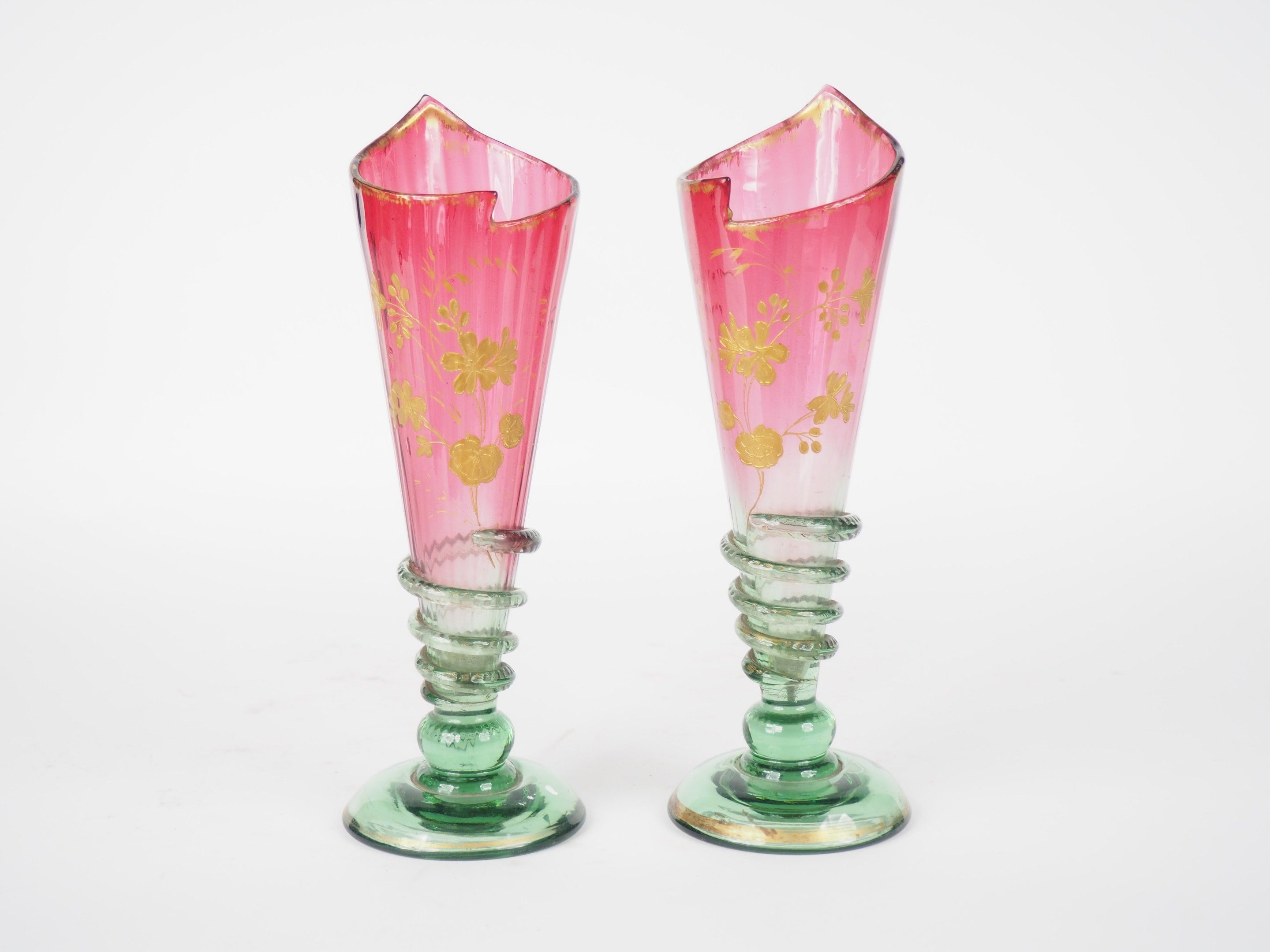 A pair of 1900 glass or polychrome crystal horn vases with e…