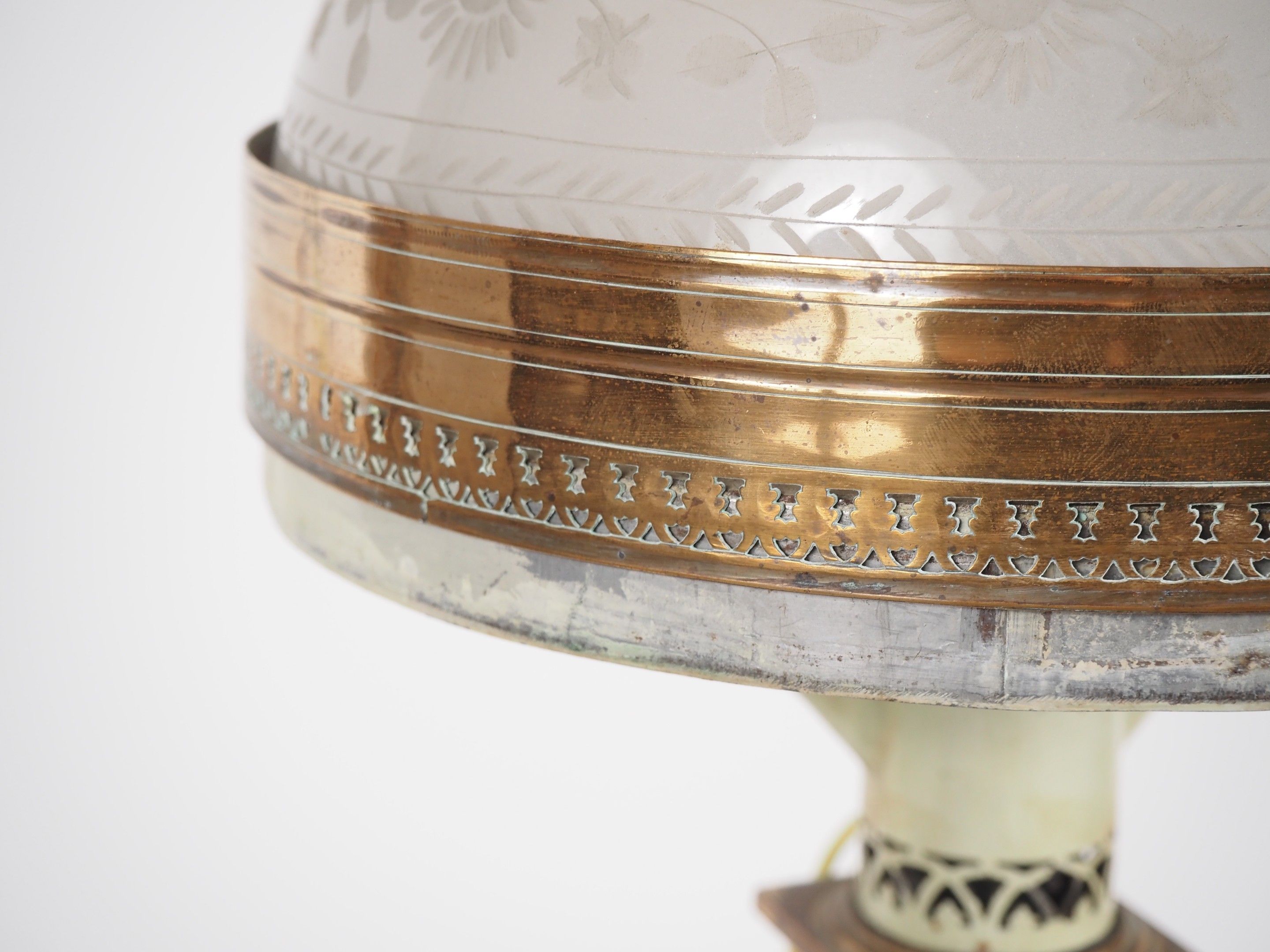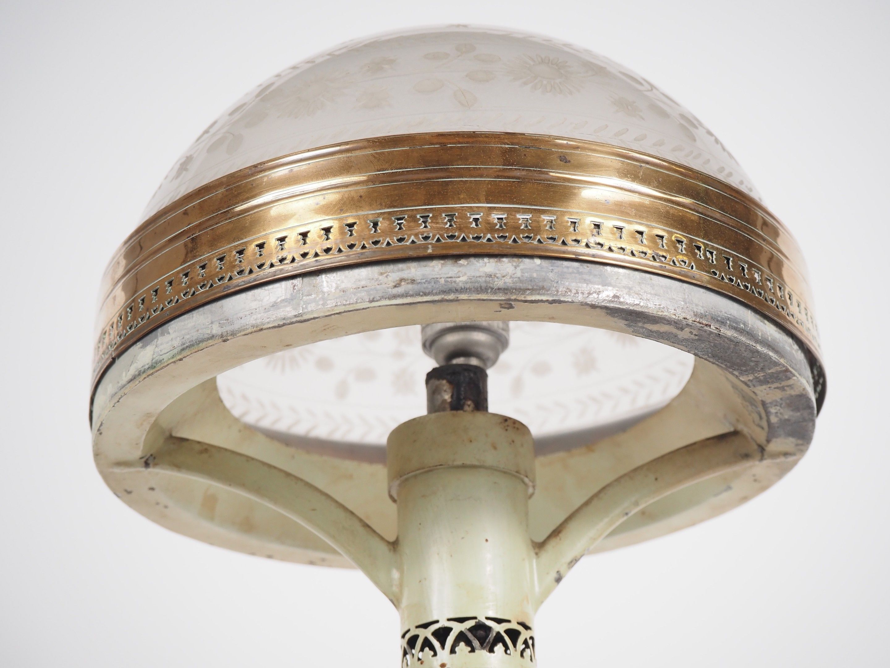 Carcel" lamp, 19th century, metal and brass, engraved glass shade.