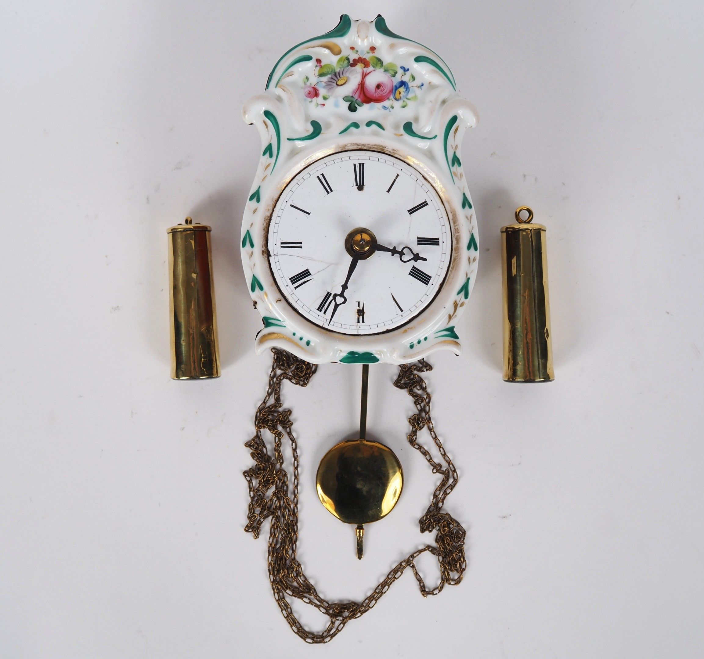 Porcelain wall clock decorated with polychrome flowers, enamelled dial with Roman numerals, with its mechanism.