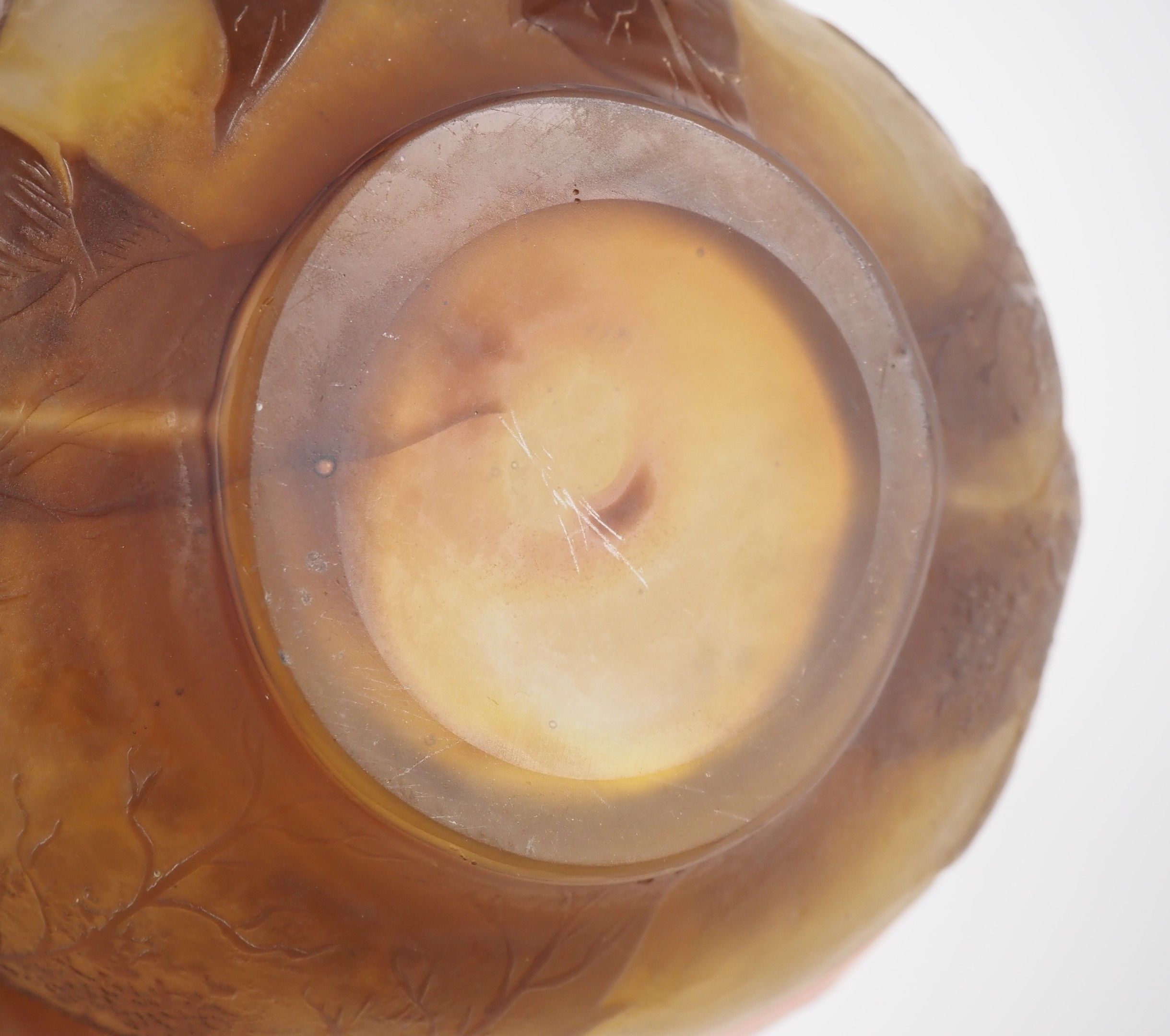 An ovoid glass vase with cameo and acid-etched decoration of flowers and brown foliage on a light background.