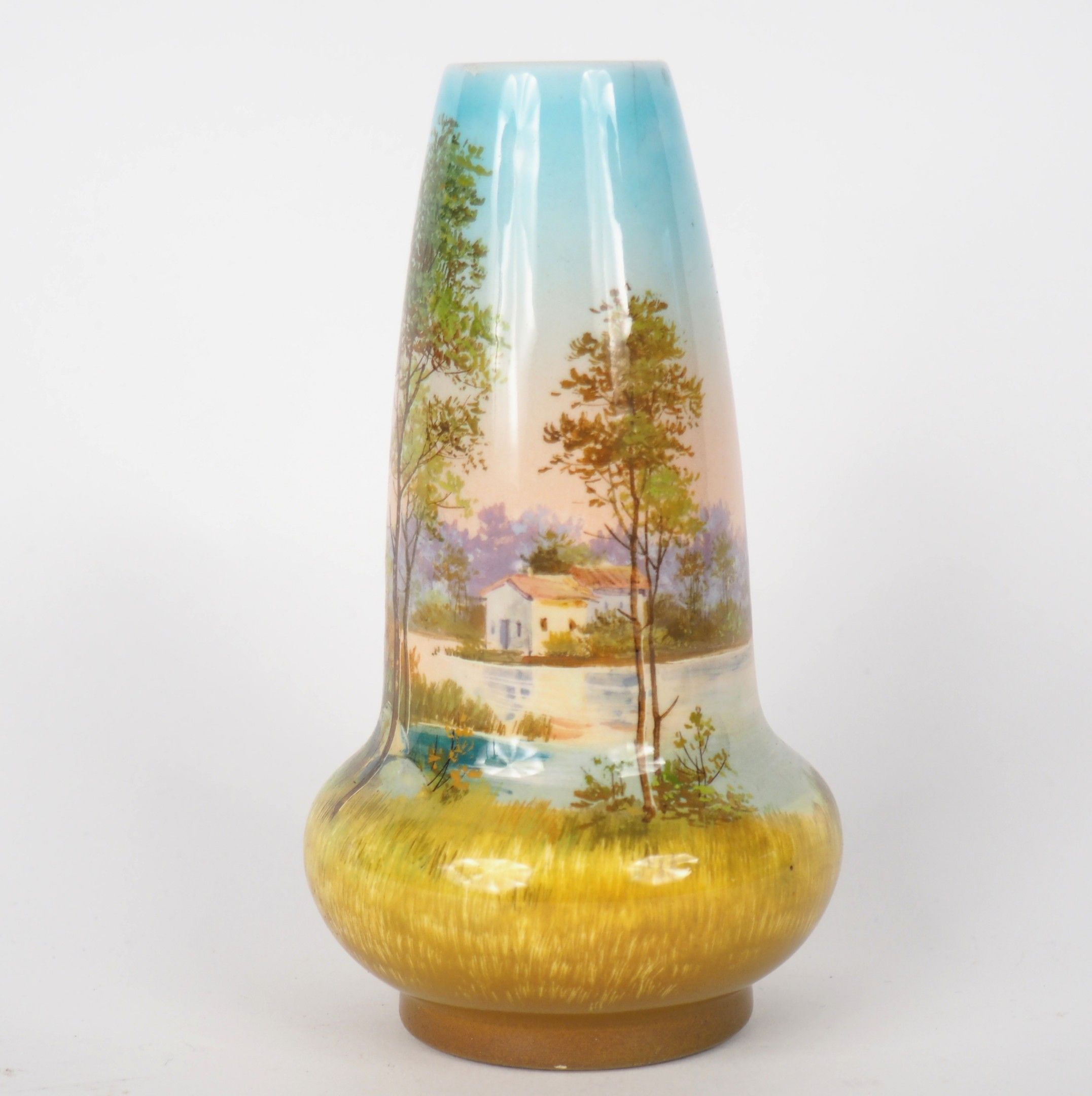 Polychrome ceramic vase decorated with a lake landscape.