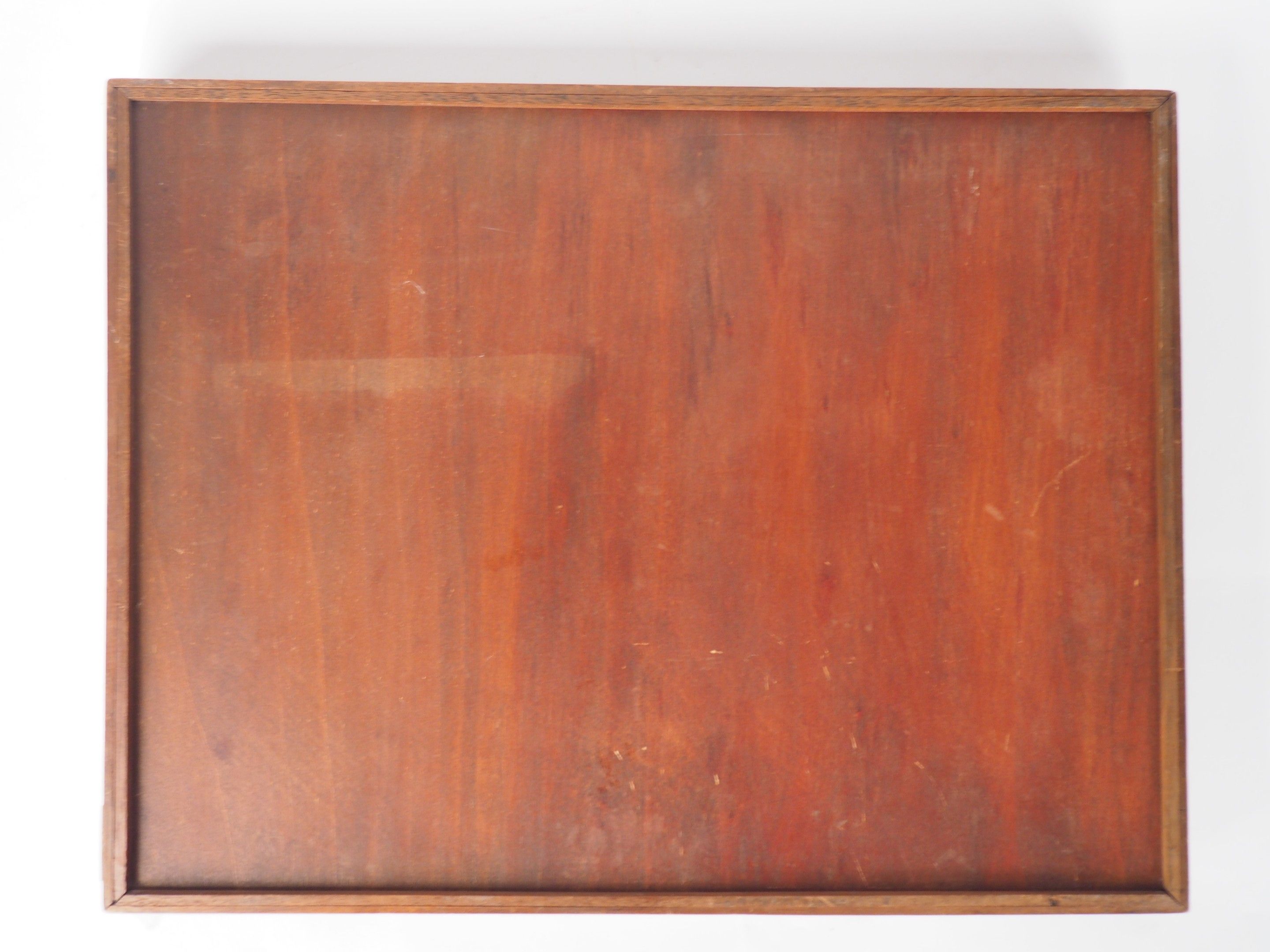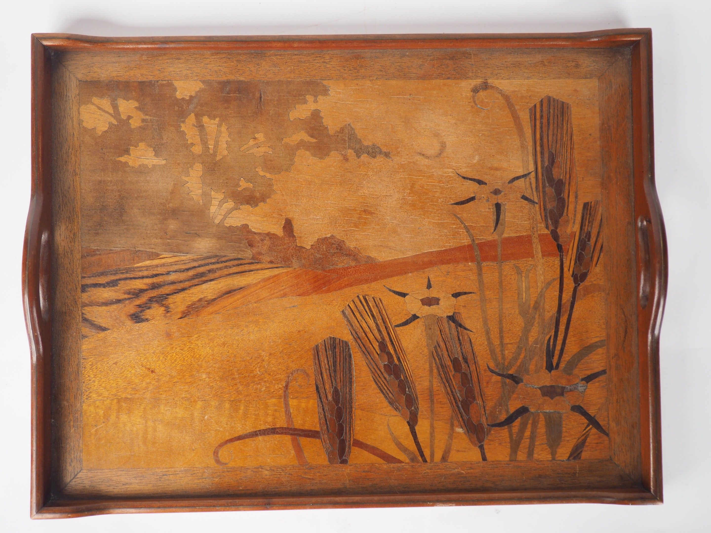 A. BIJON in Toulouse. Art Nouveau marquetry tray decorated with reeds and flowers in a lakeside landscape. Signed. Dim. 40 x 52 cm.