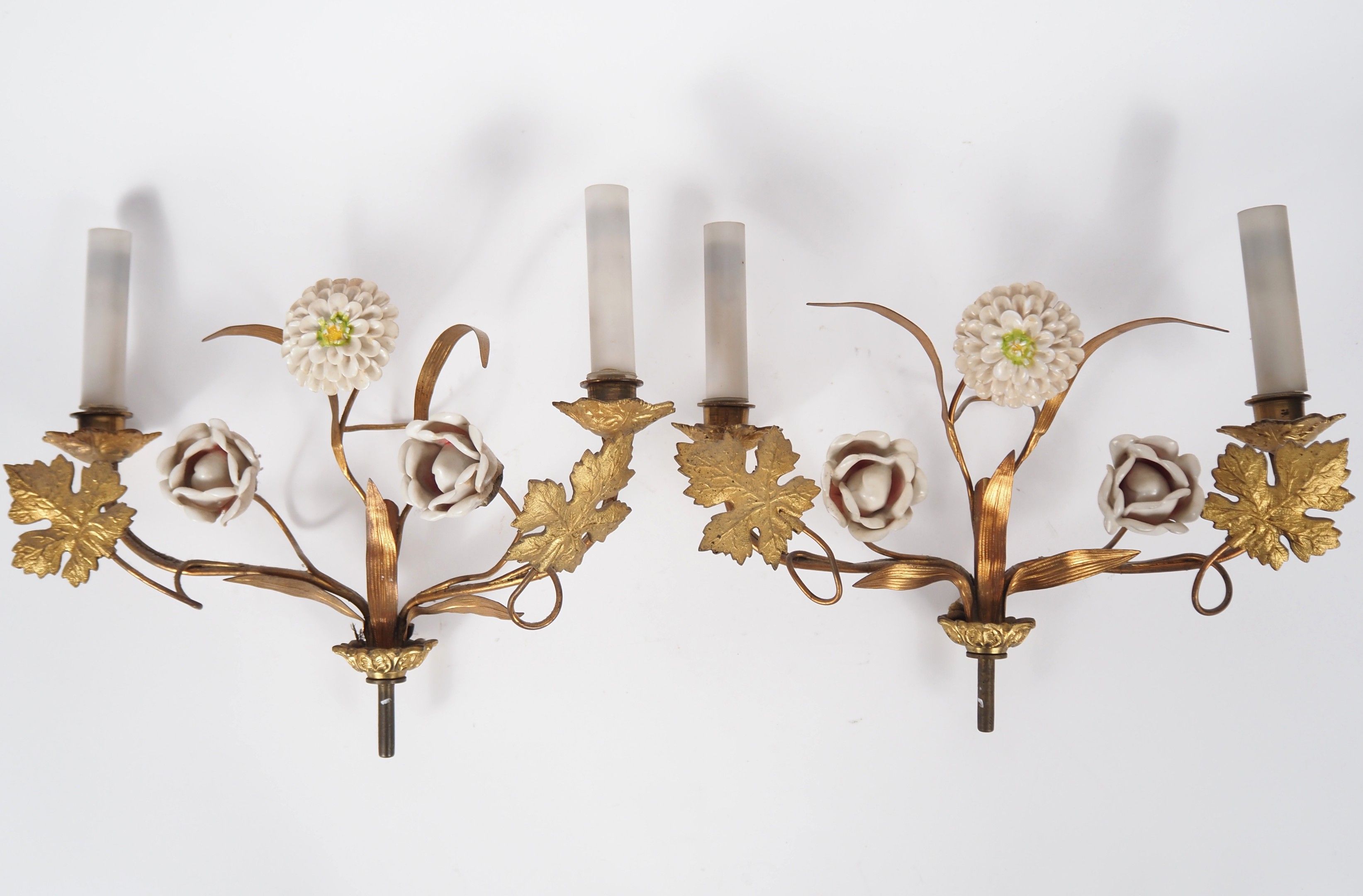 2 brass bronze and porcelain candelabra with flowers in relief and two lights.