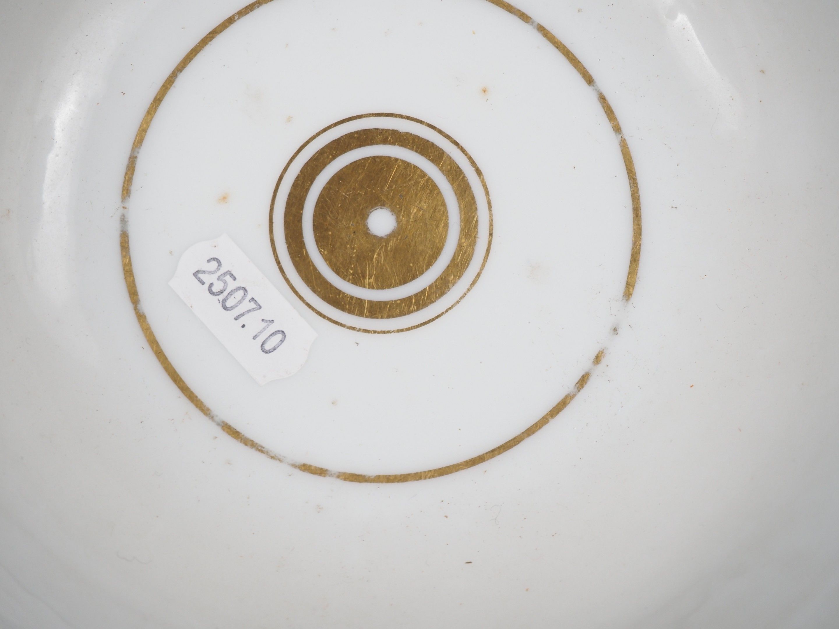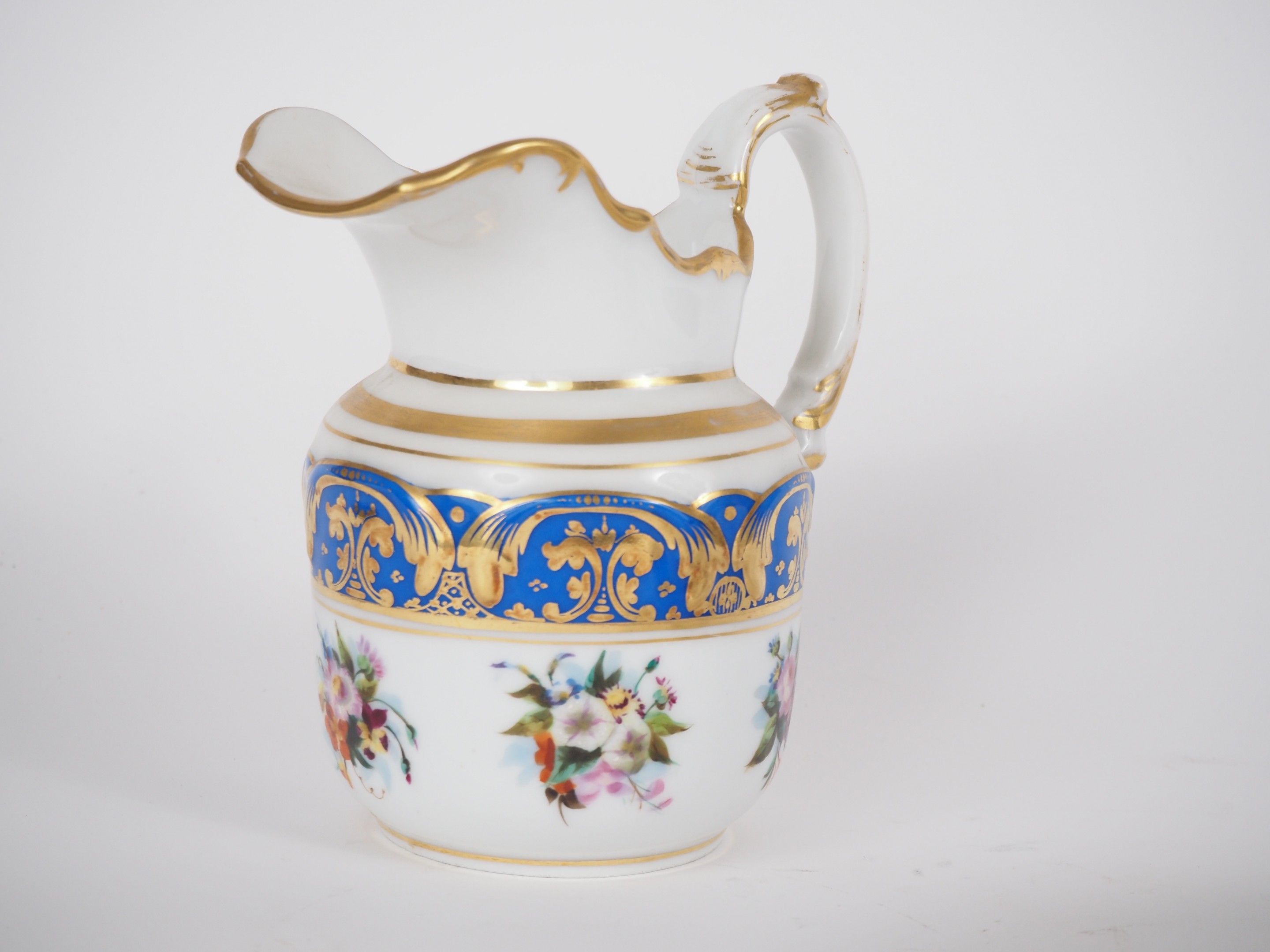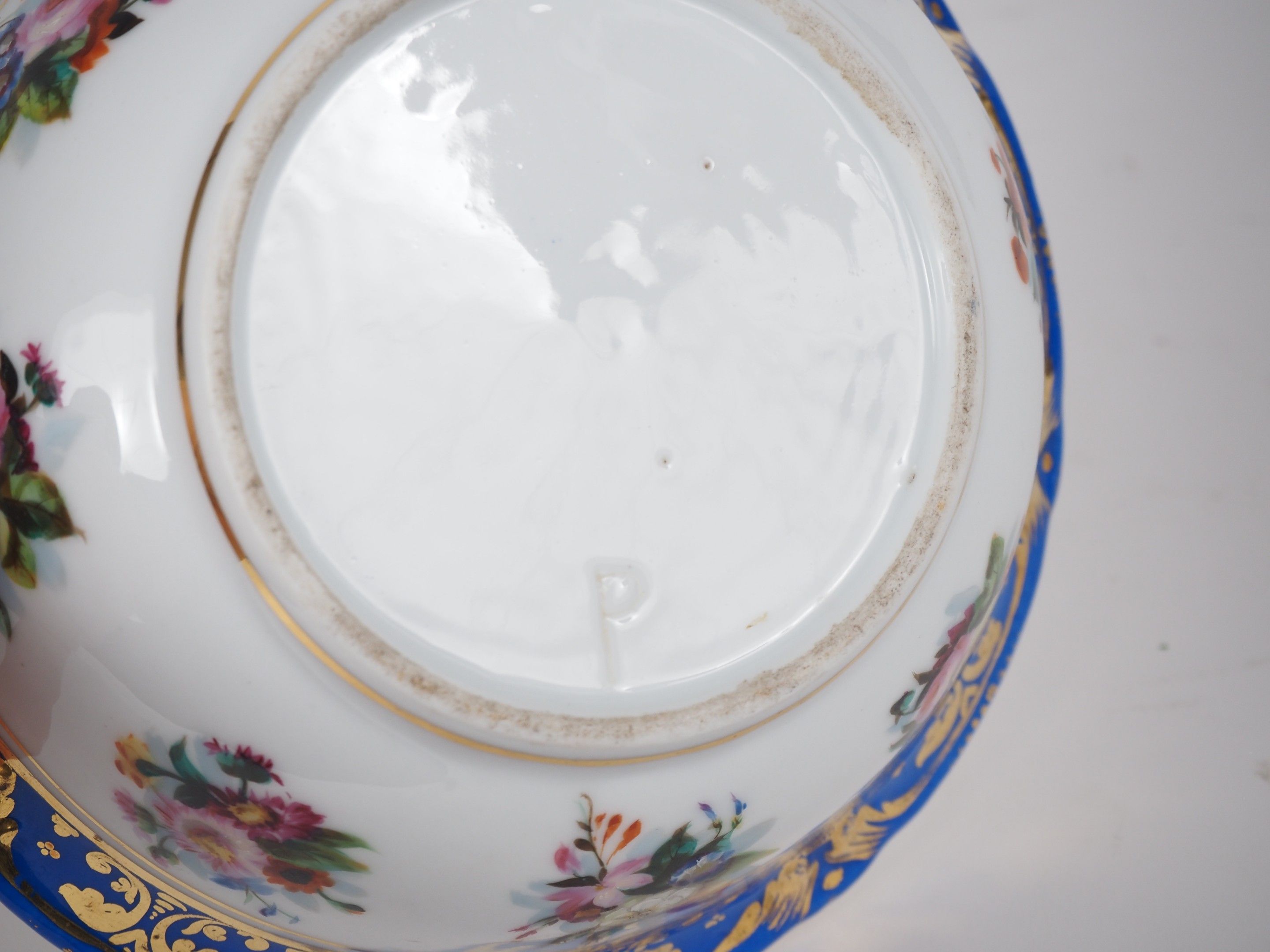 A late 19th - early 20th century Paris porcelain brooch and basin decorated with polychrome flowers and gold edging on a blue background.