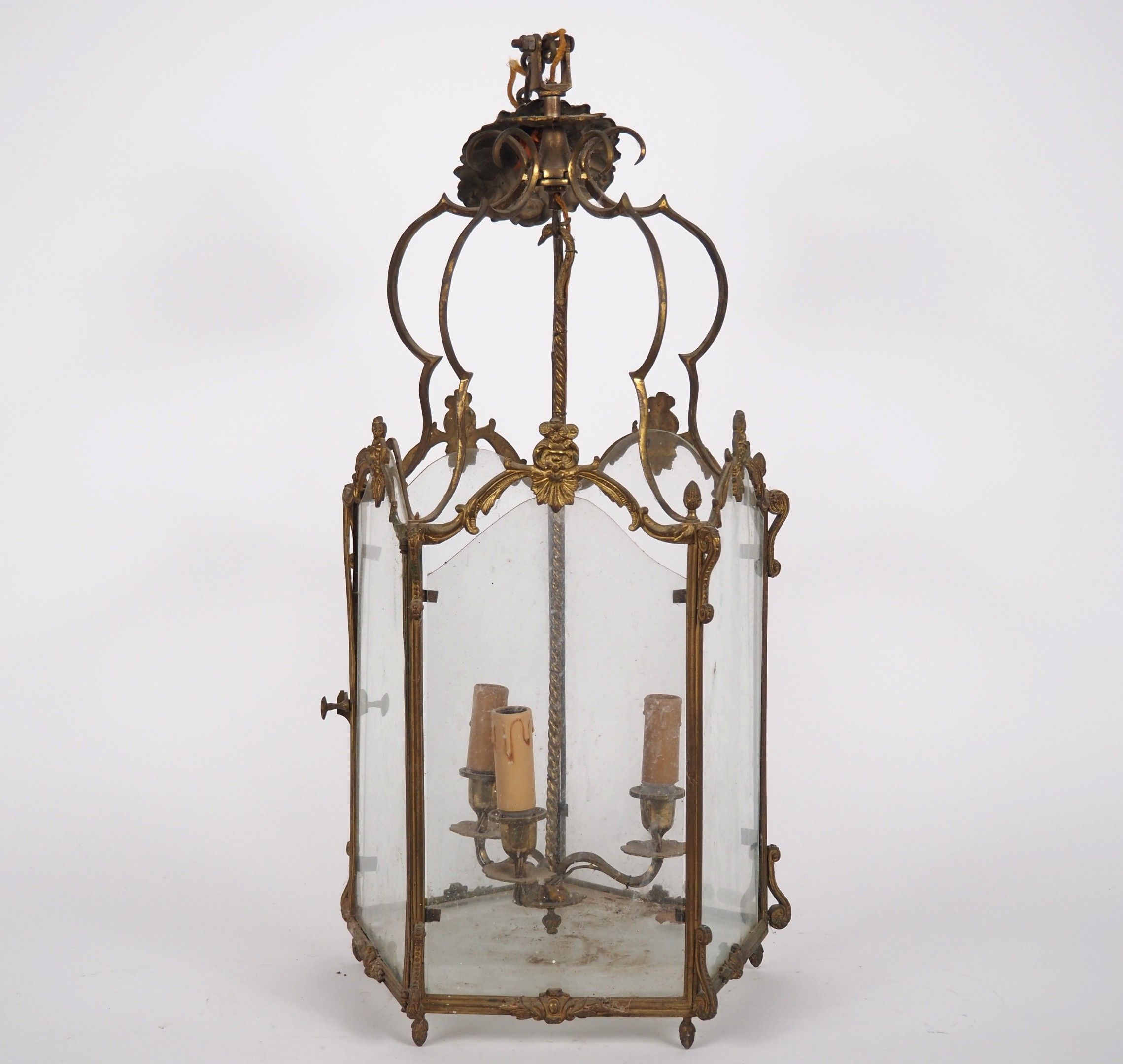 A glass and brass three-light hall lantern decorated with fl…