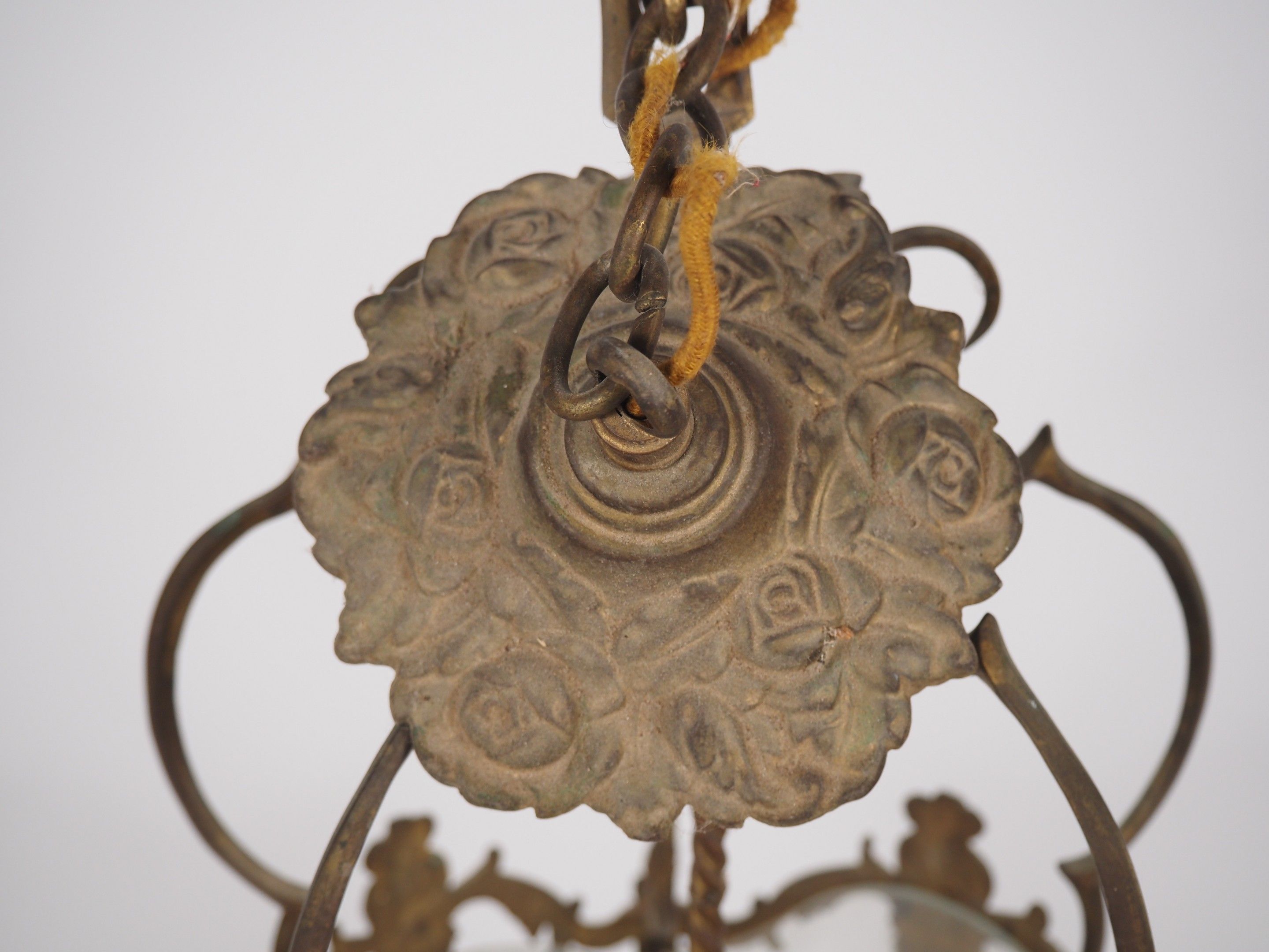 A glass and brass three-light hall lantern decorated with flowers and pine cones.