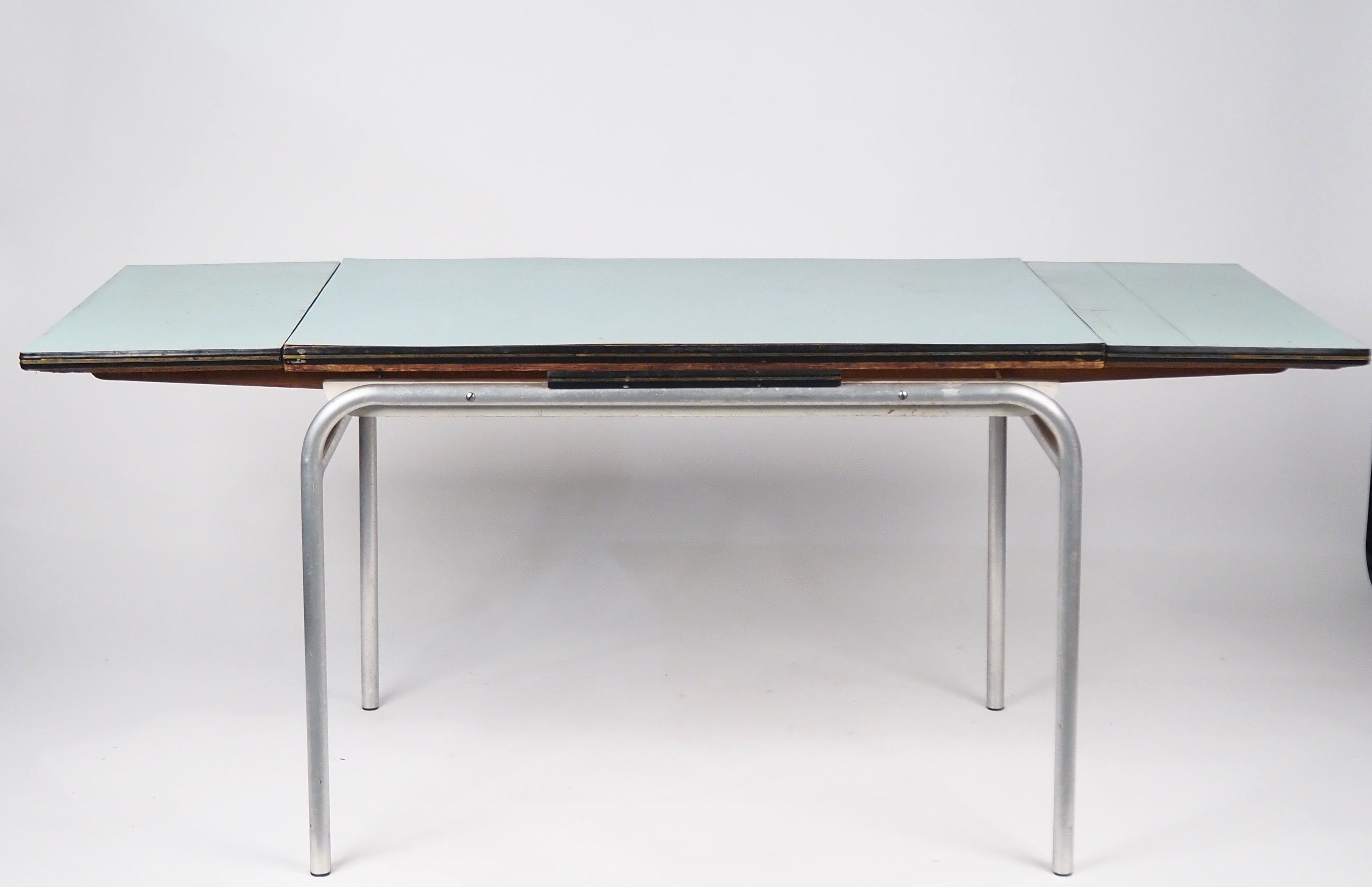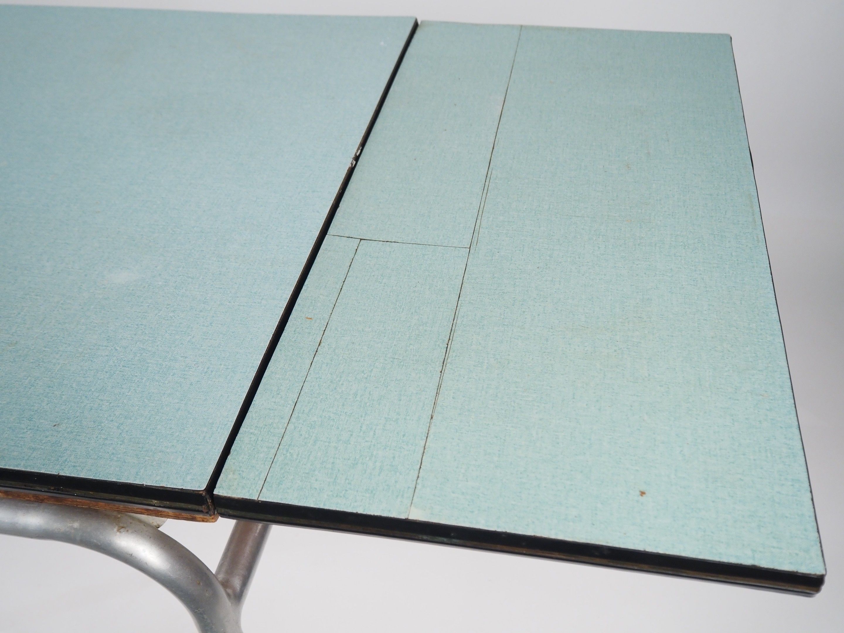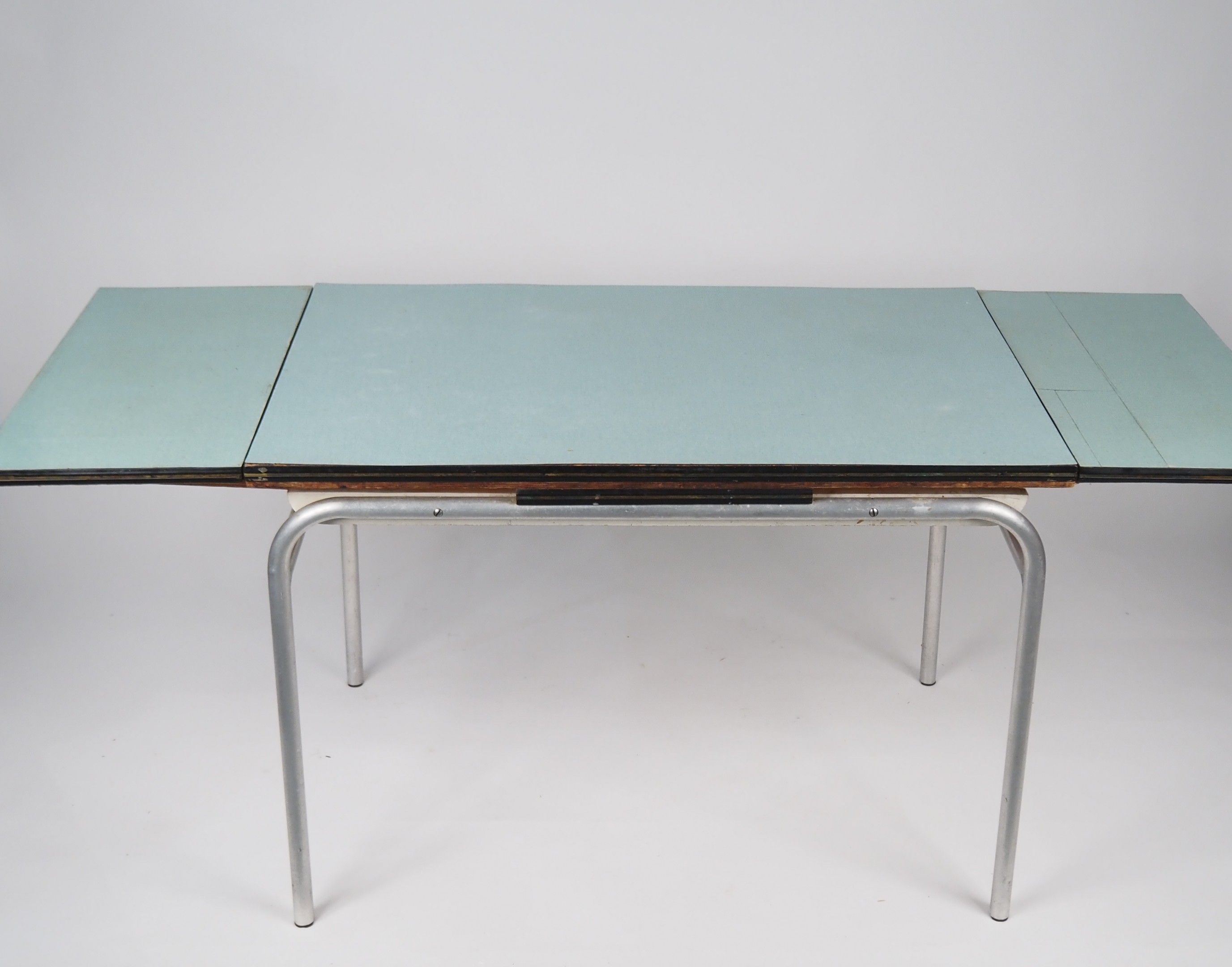 Kitchen table in green Formica with metal legs and Italian-style top.