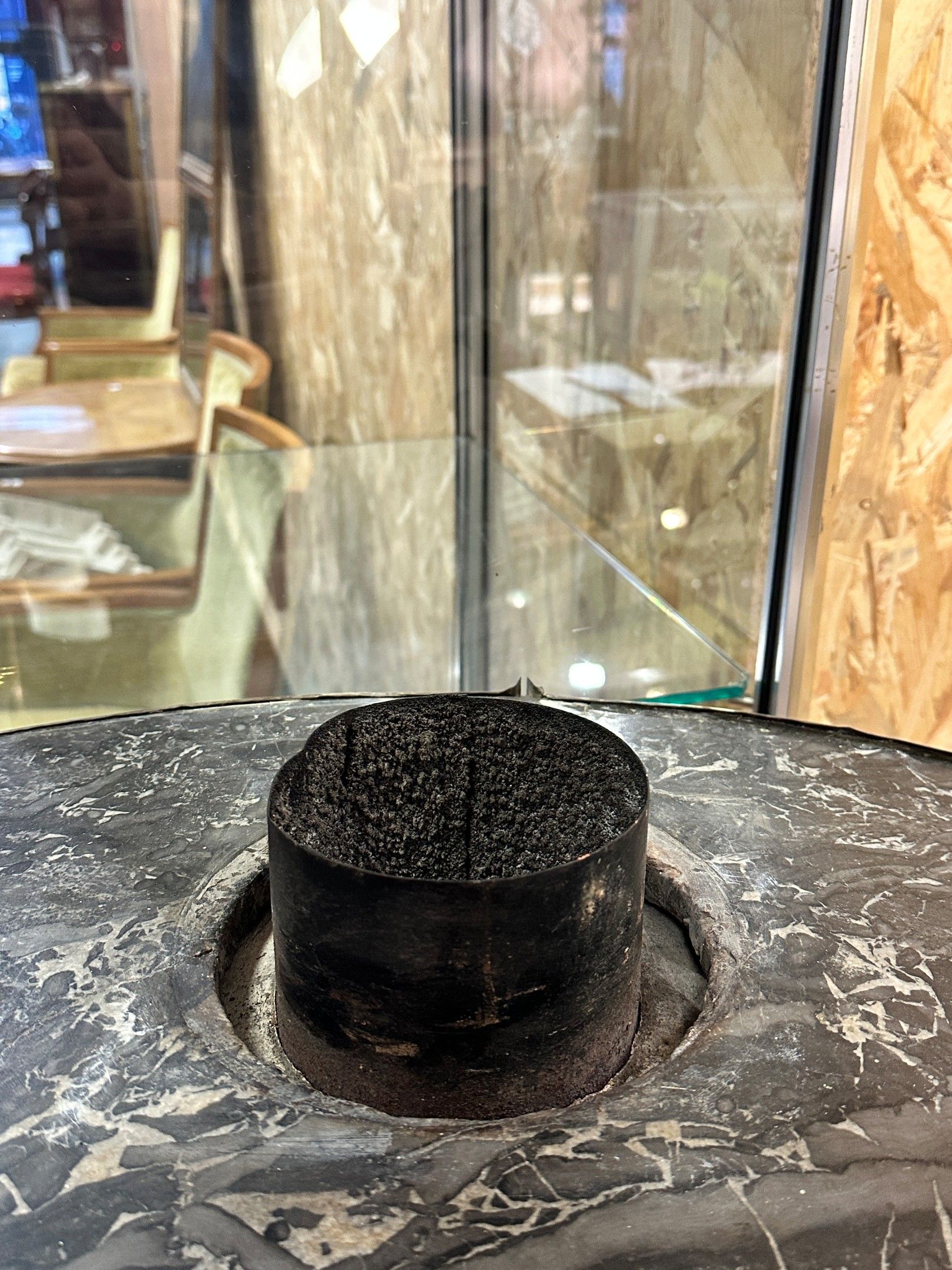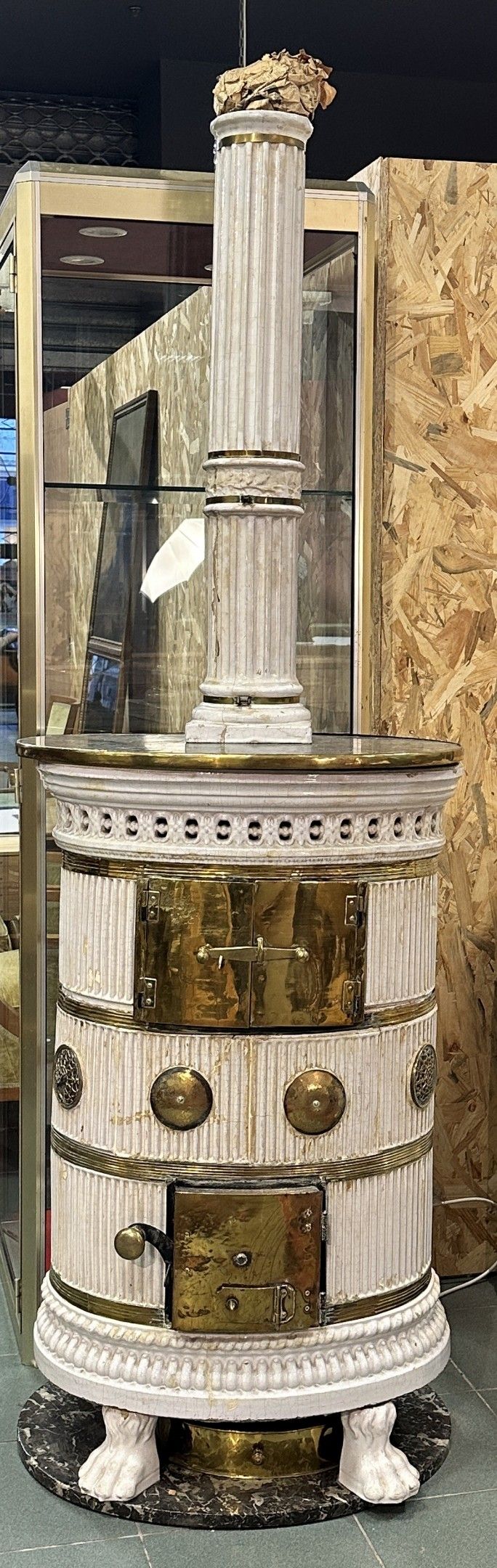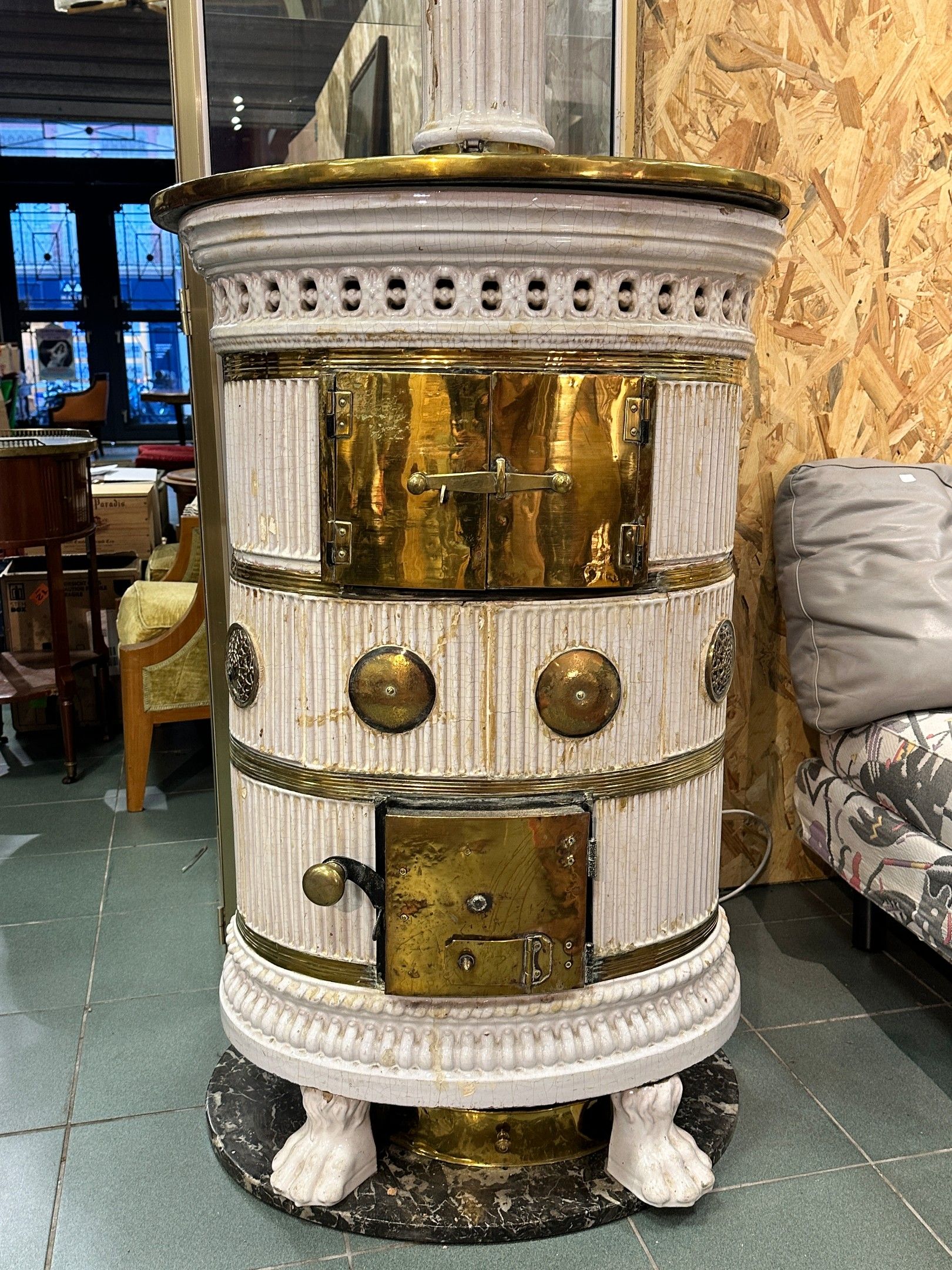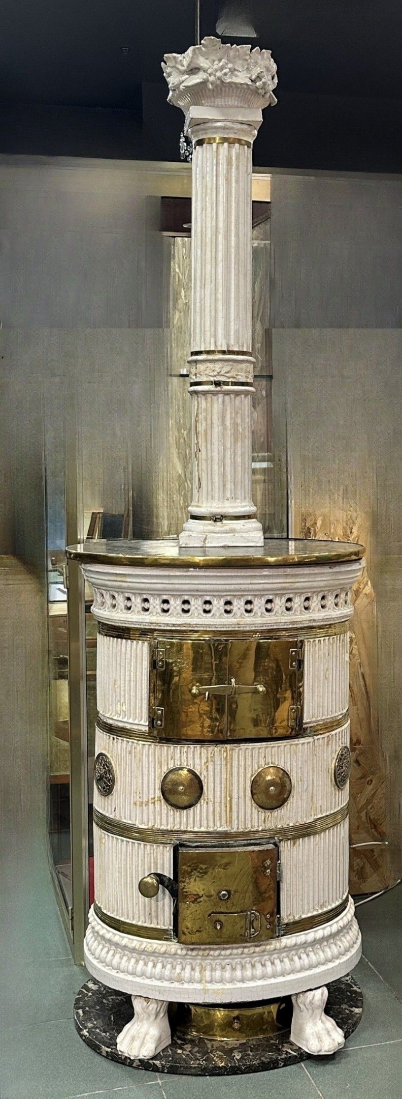 Beautiful Alsatian stove in the Louis XVI style in white earthenware, decorated with fluting and a fruit basket; claw feet, grey marble top. Very fine brass trim (restored).
