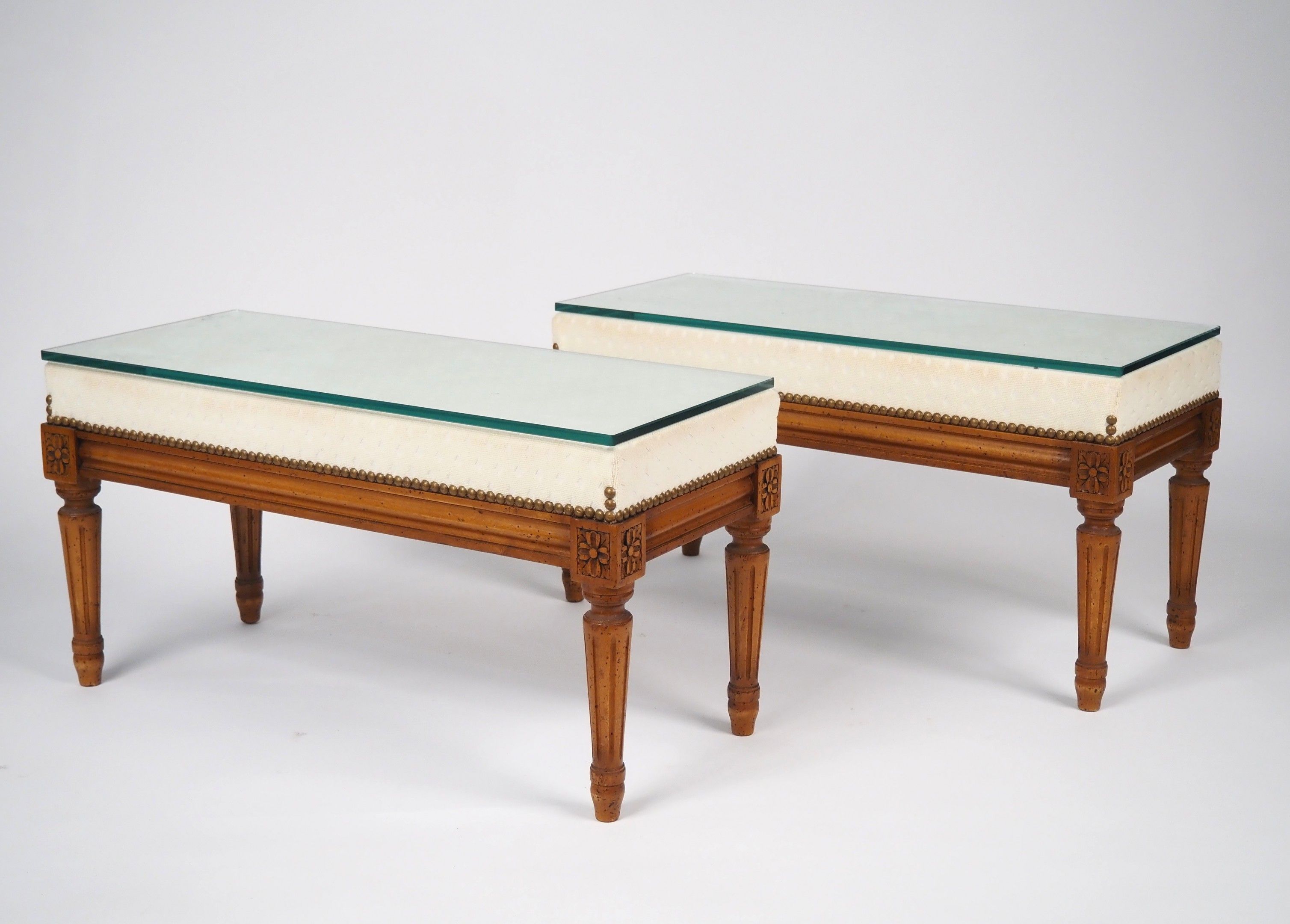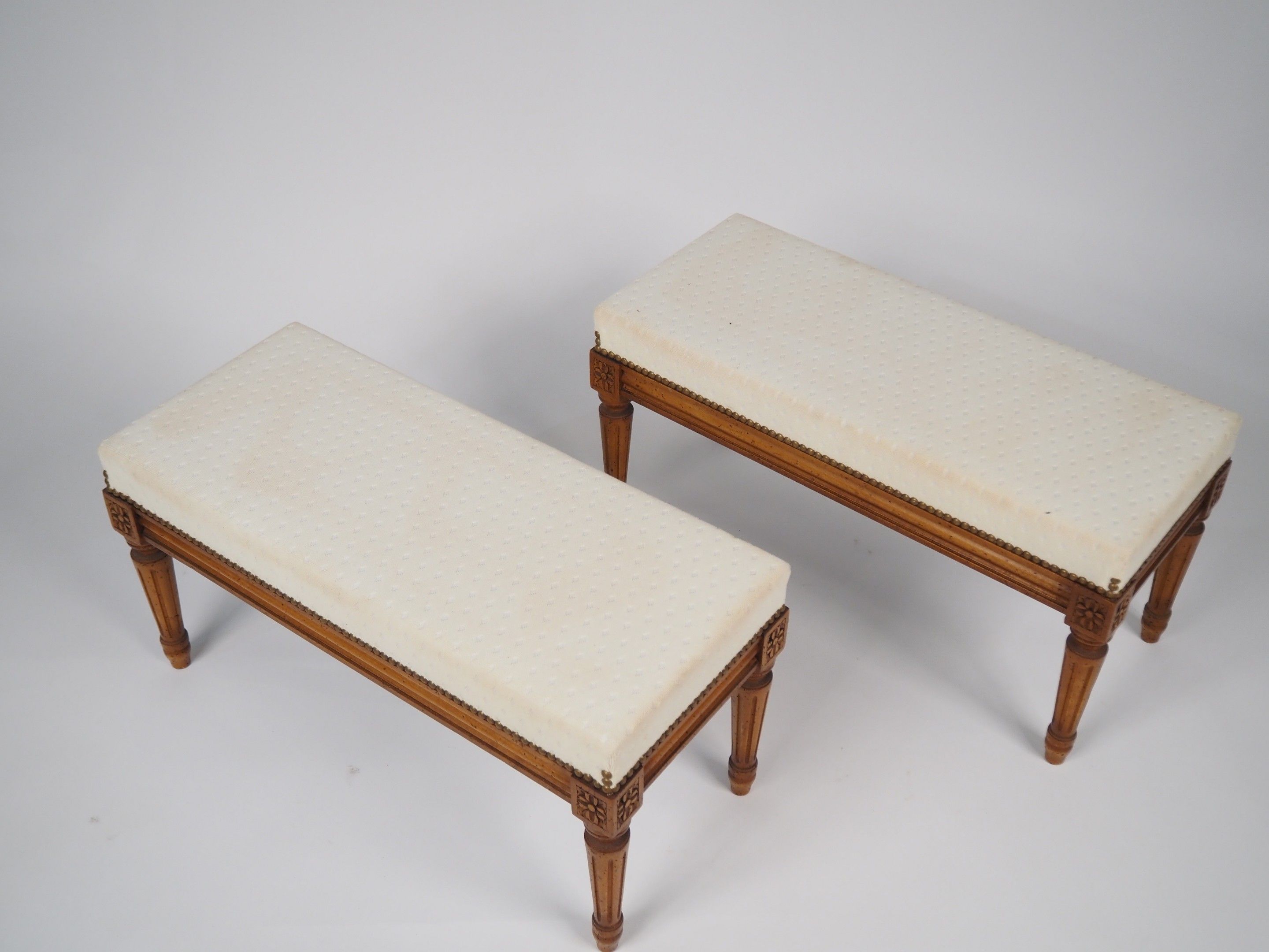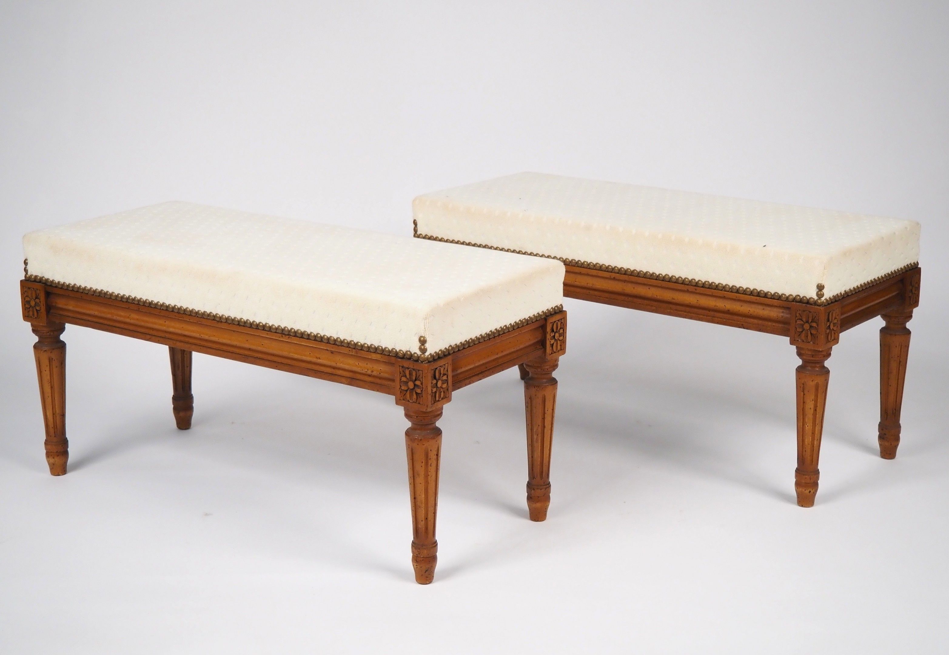Pair of Louis XVI style stools in natural wood, fluted legs, cream fabric upholstery.
