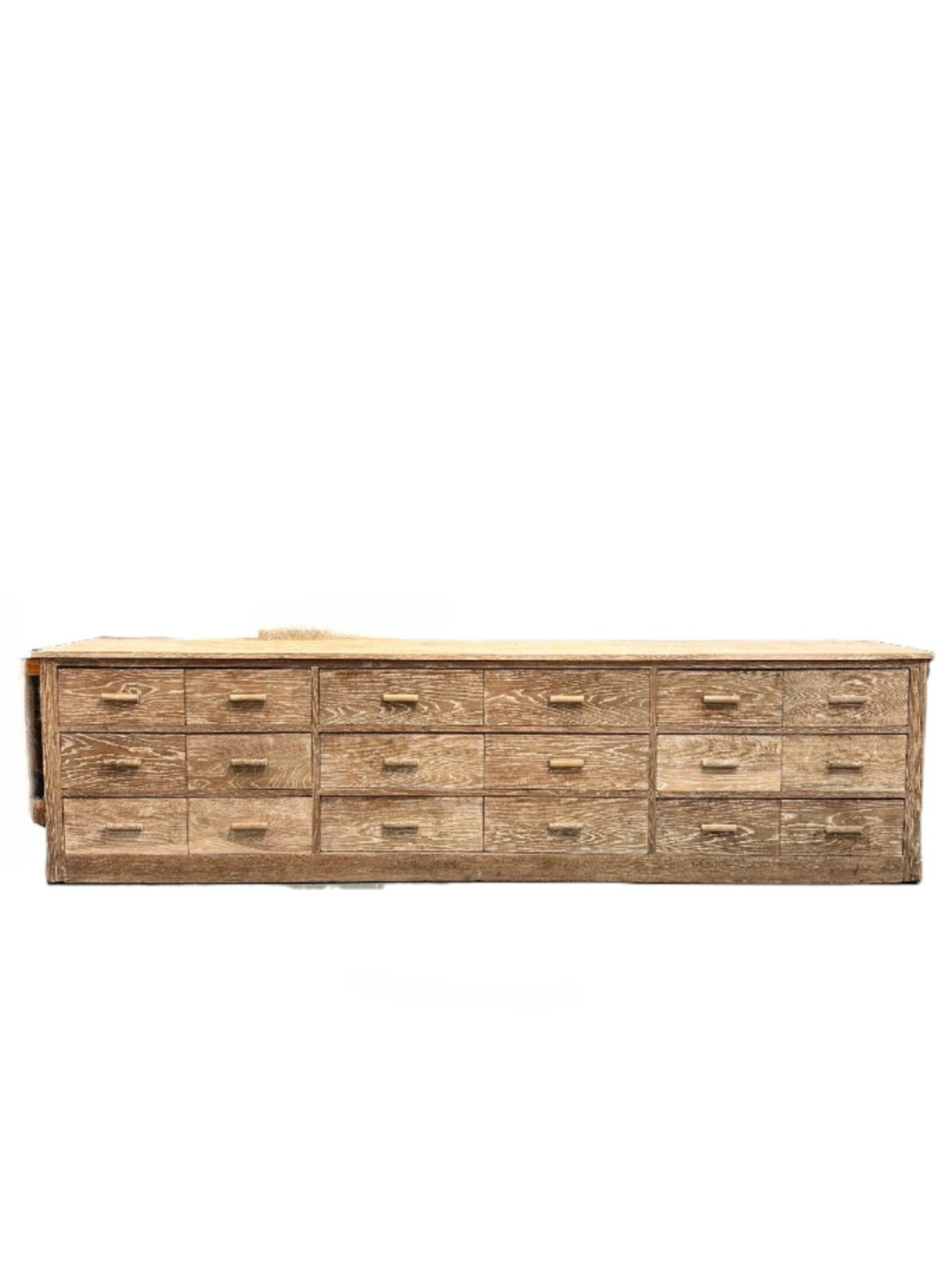 Piece of haberdashery furniture in whitewashed oak, opening with eighteen drawers.