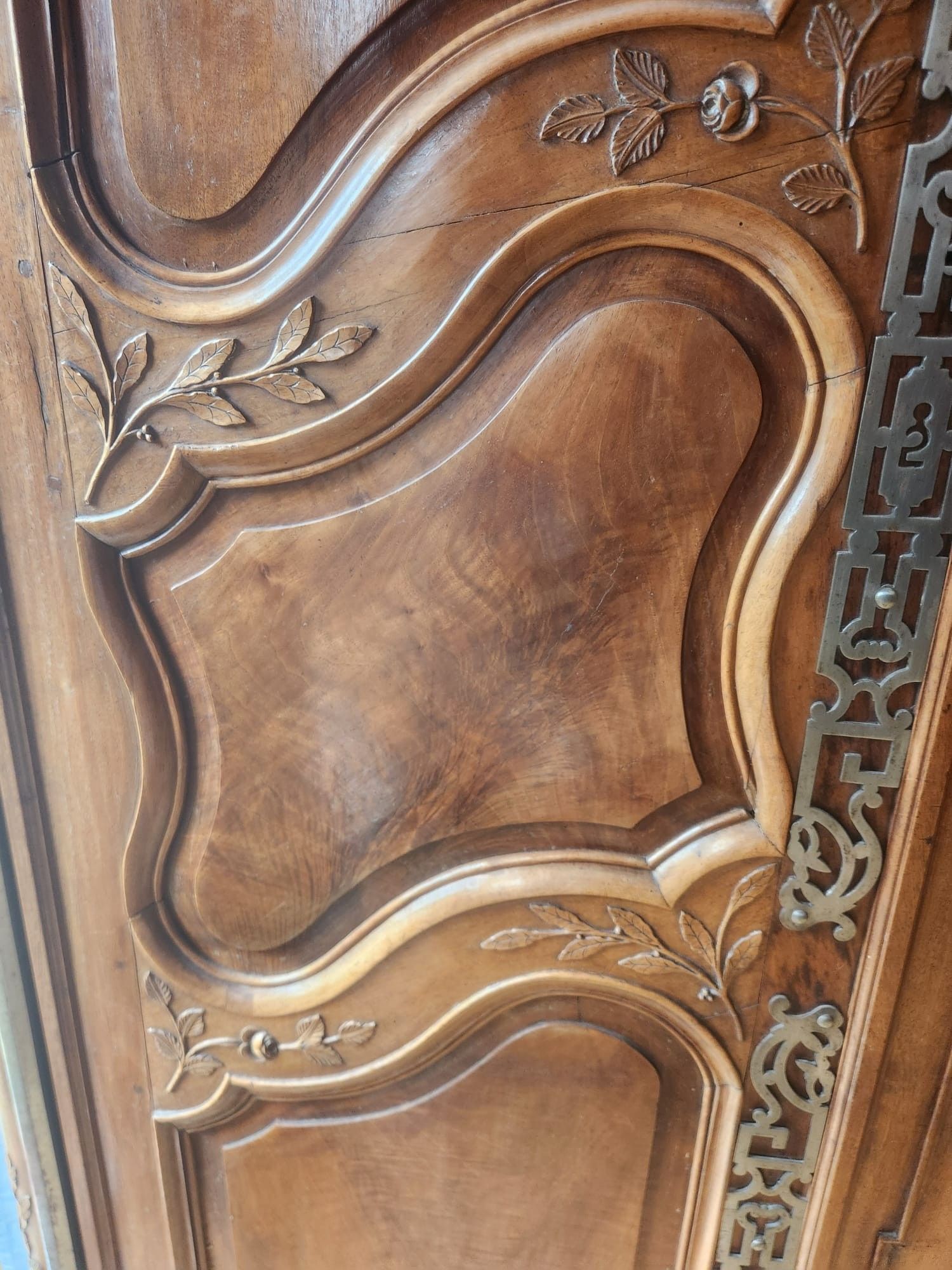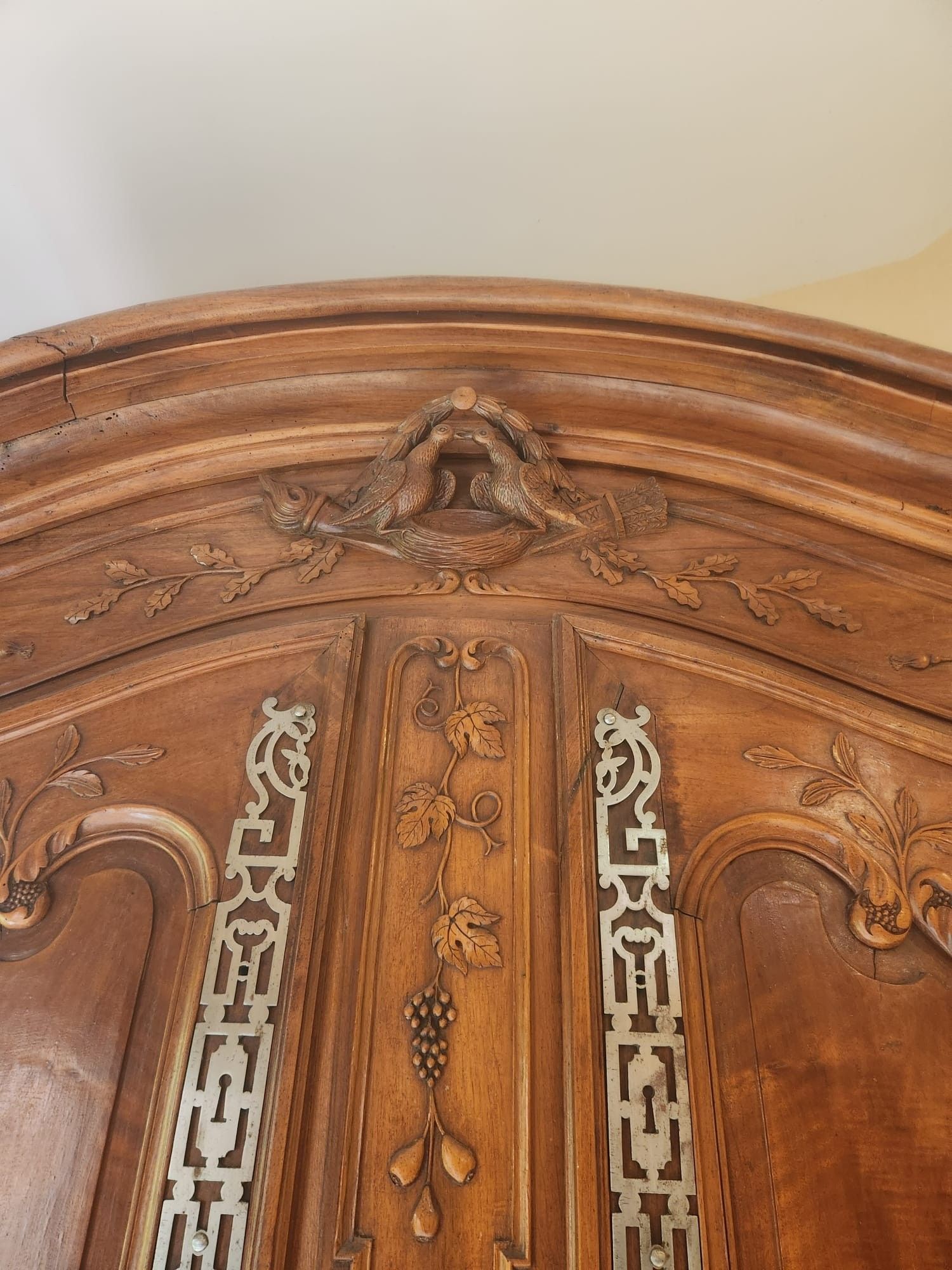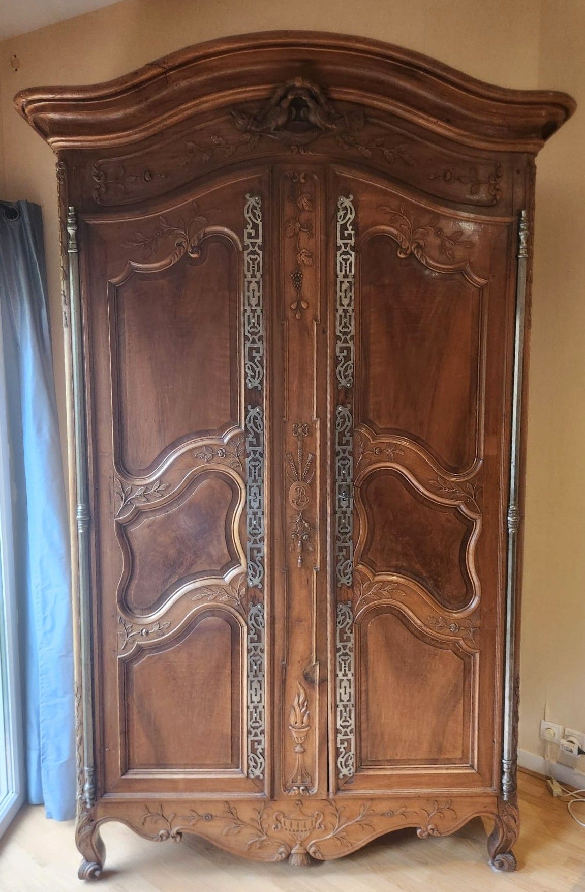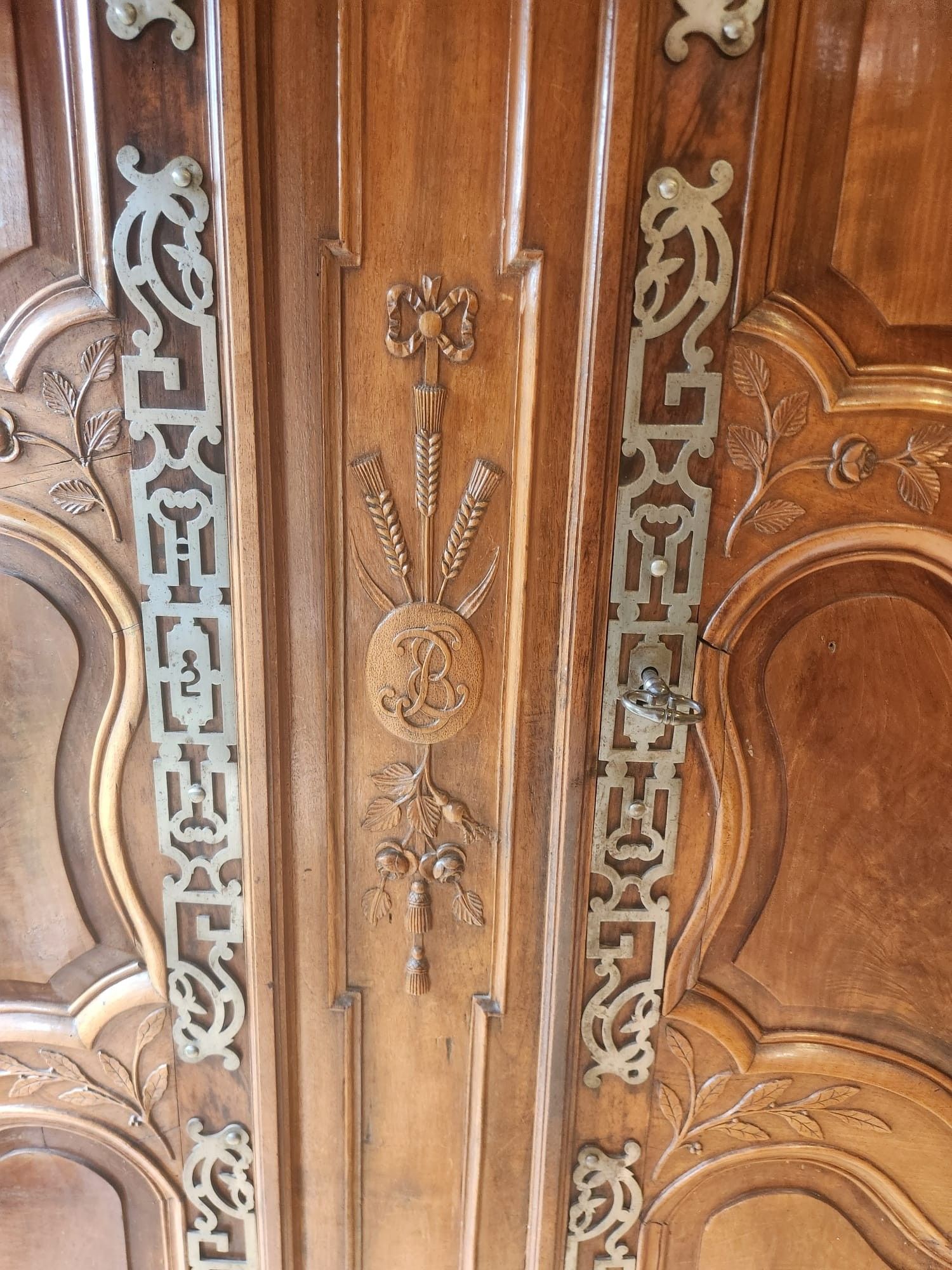 A late 18th and early 19th century Louis XVI style Provencal cupboard in moulded and carved walnut, decorated with vine shoots, ears of corn and Athenian figures; cornice in the shape of a "chapeau de gendarme", curved legs, fine ironwork.