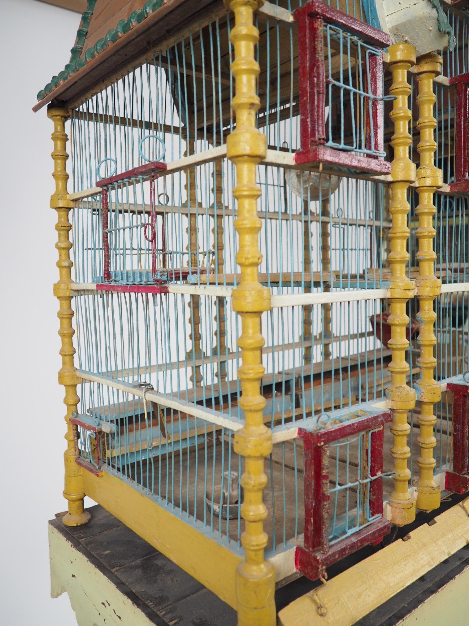 19th century wooden and polychrome iron birdcage on tripod stand.