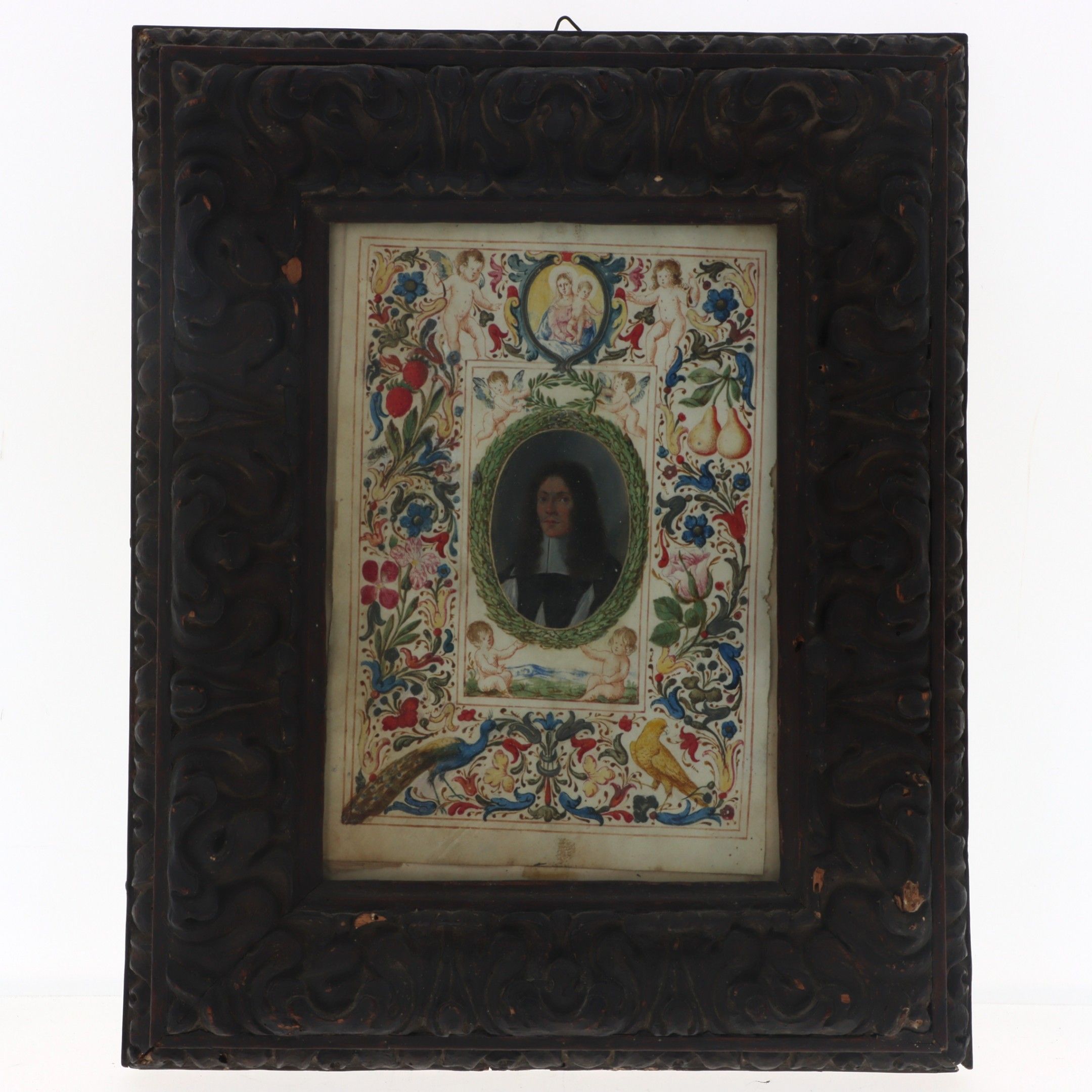 Portrait of a gentleman in miniature in a medallion topped by a Virgin and Child. Surrounding an illuminated border of putti, fruit and birds in floral scrolls.