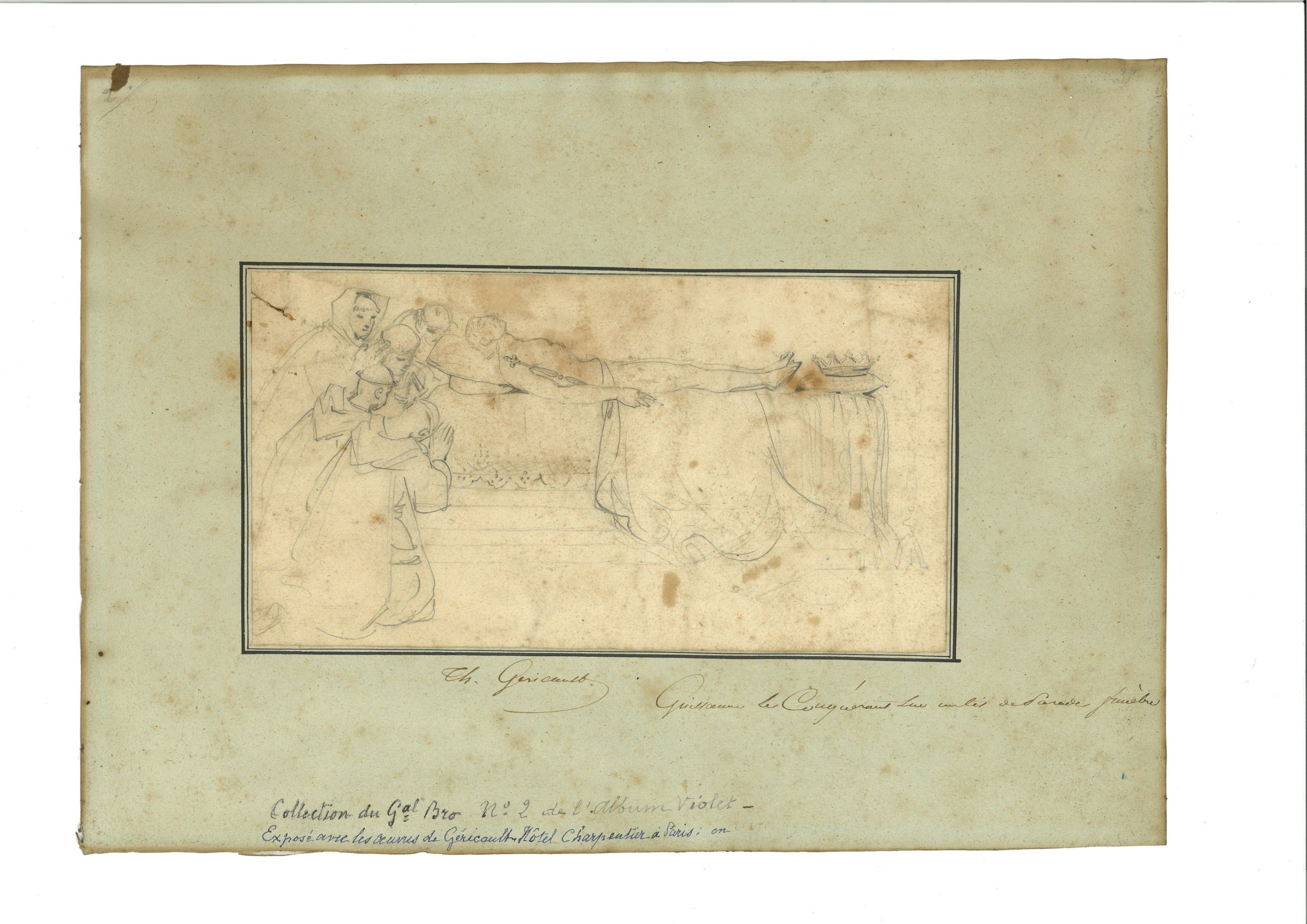 Collection of General Bro; appears on a draft division on the death of Baroness Olivier Bro in 1908: "folio 37 of the purple album. Géricault croquis Guill. le Conquérant sur son lit de parade 10 francs"; shown at the Centenary Exhibition in 1924 as on loan from Mme Aylies, the general's granddaughter, and at the Winterthur Exhibition in 1953 as belonging to a private collection.