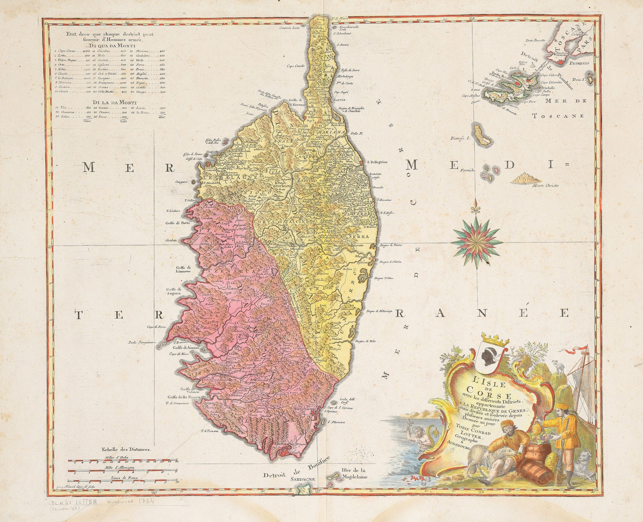 "L'ISLE DE CORSE AVEC LES DIFFÉRENTS DISTRICTS, APPARTENANTE A LA REPUBLIQUE DE GENES, MAIS DIVIFEE DE FOULEVEE DEPUIS PLUSIEURS ANNES".