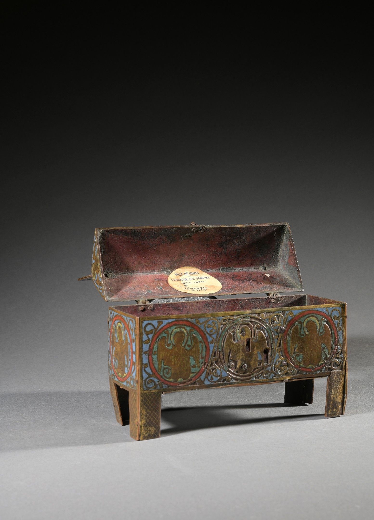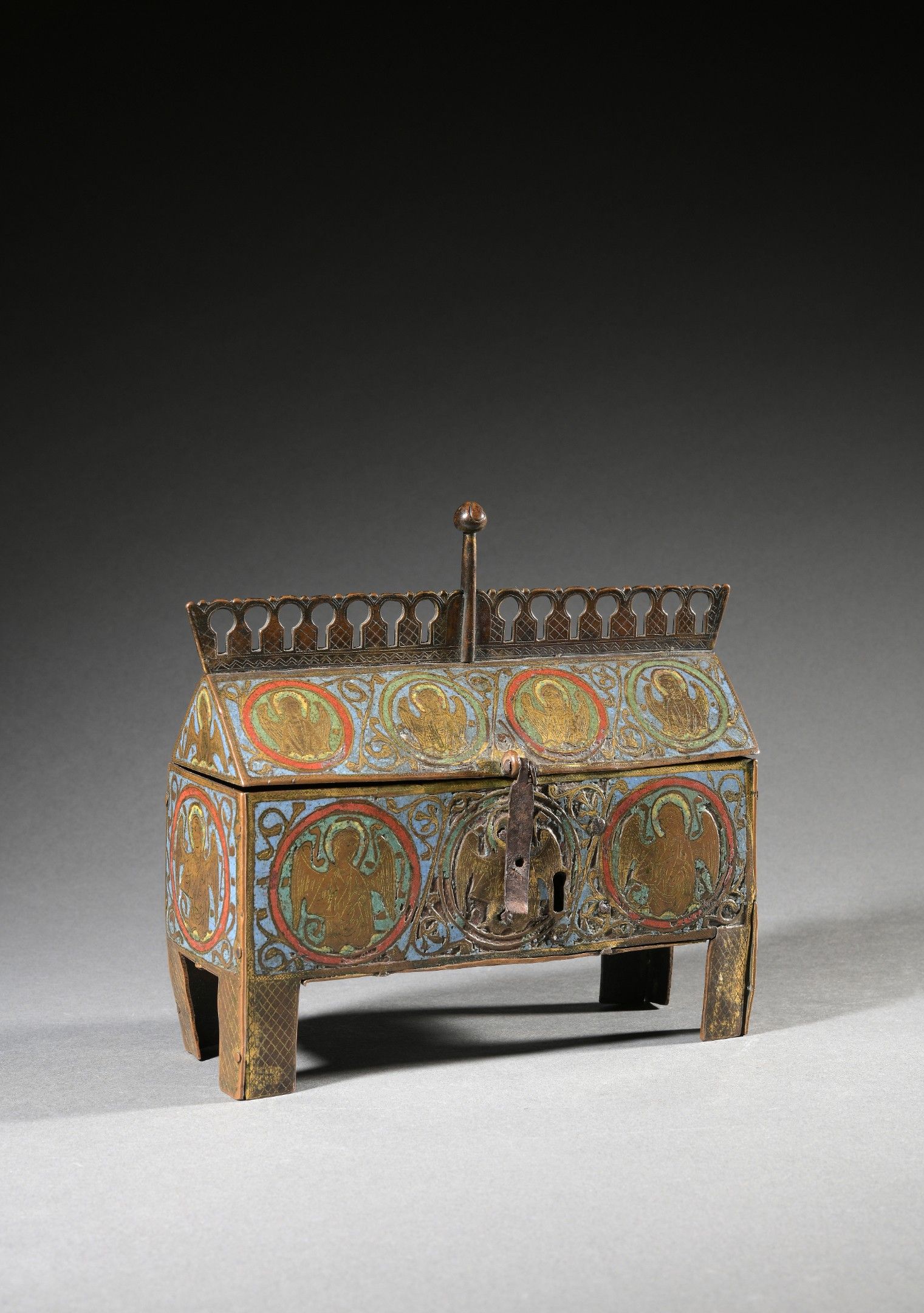 Old exhibition label in the lid VILLE DE NIMES / EXPOSITION DES PRIMITIFS / ÉTÉ 1950 / N°5 / Limoges / 13th century.