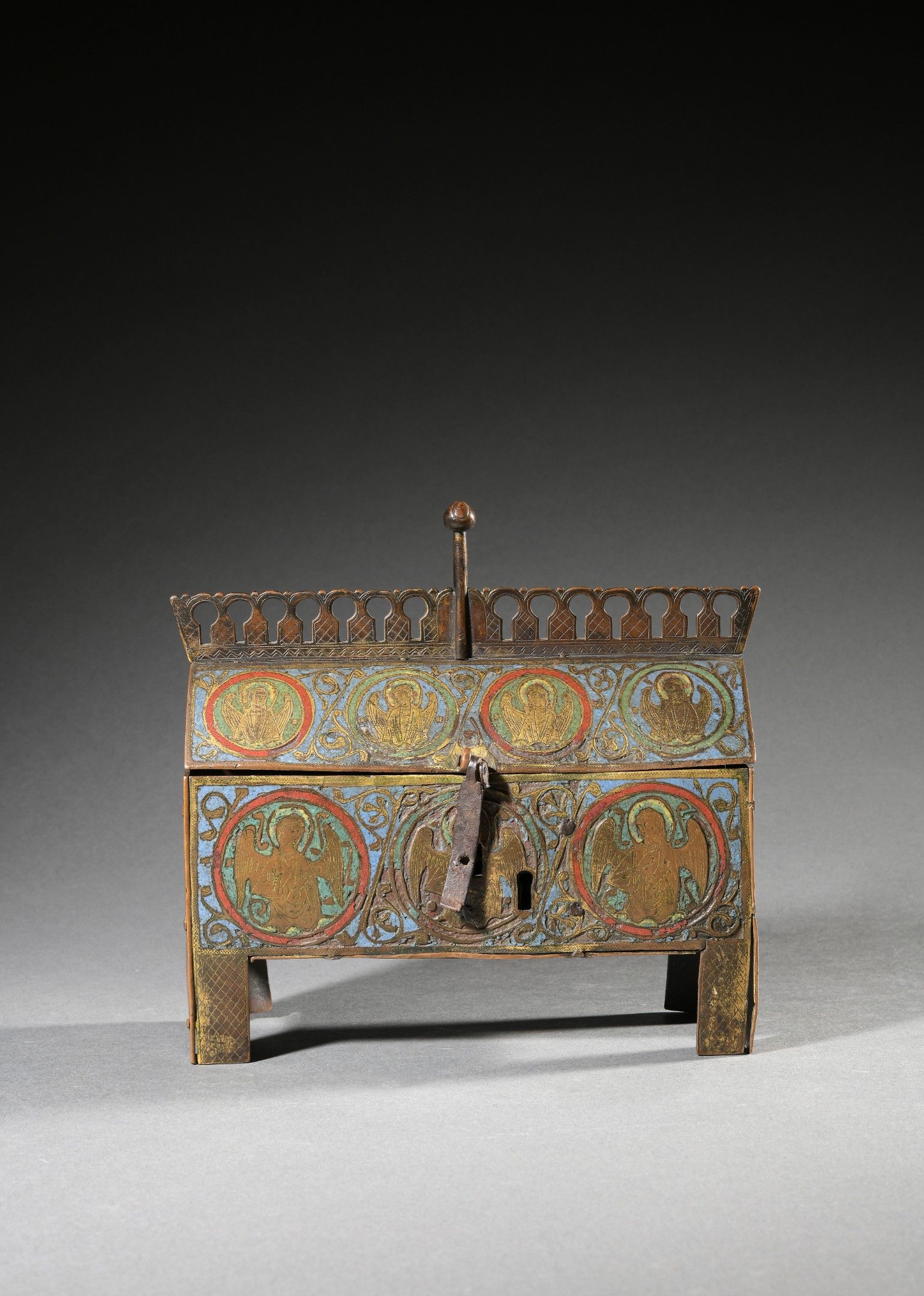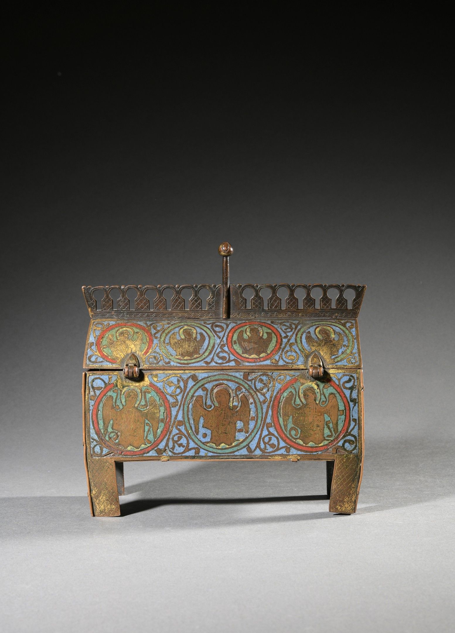 Champlevé enamel, decorated on all sides with busts of angels in medallions against a background of stylised foliage.