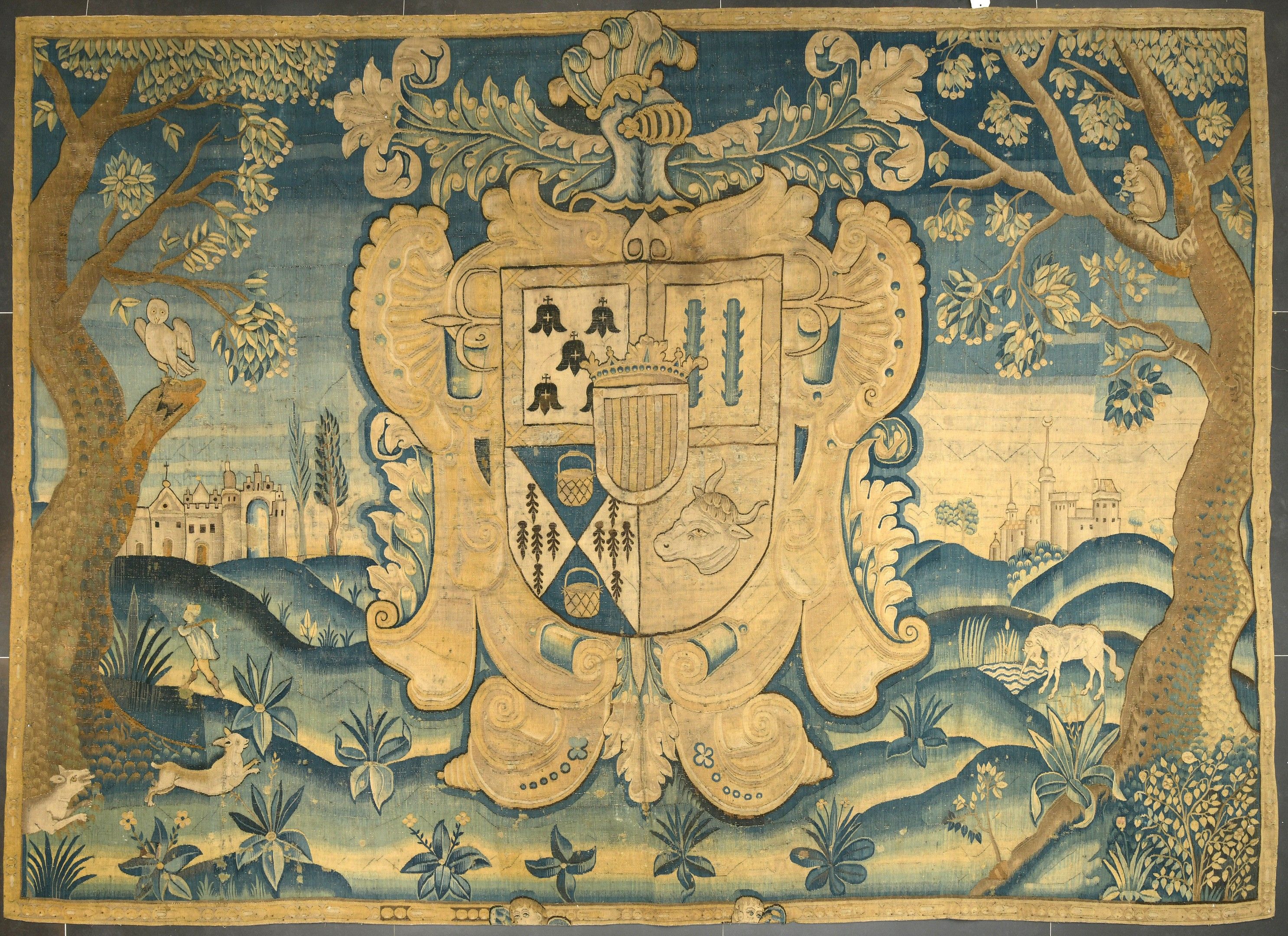 Framed by two large trees with twisted trunks, the coat of arms of the Duke of Cuidad Real, a descendant of the kings of Aragon, stands out against a hilly landscape, finished on either side of the shield by two fortified towns.