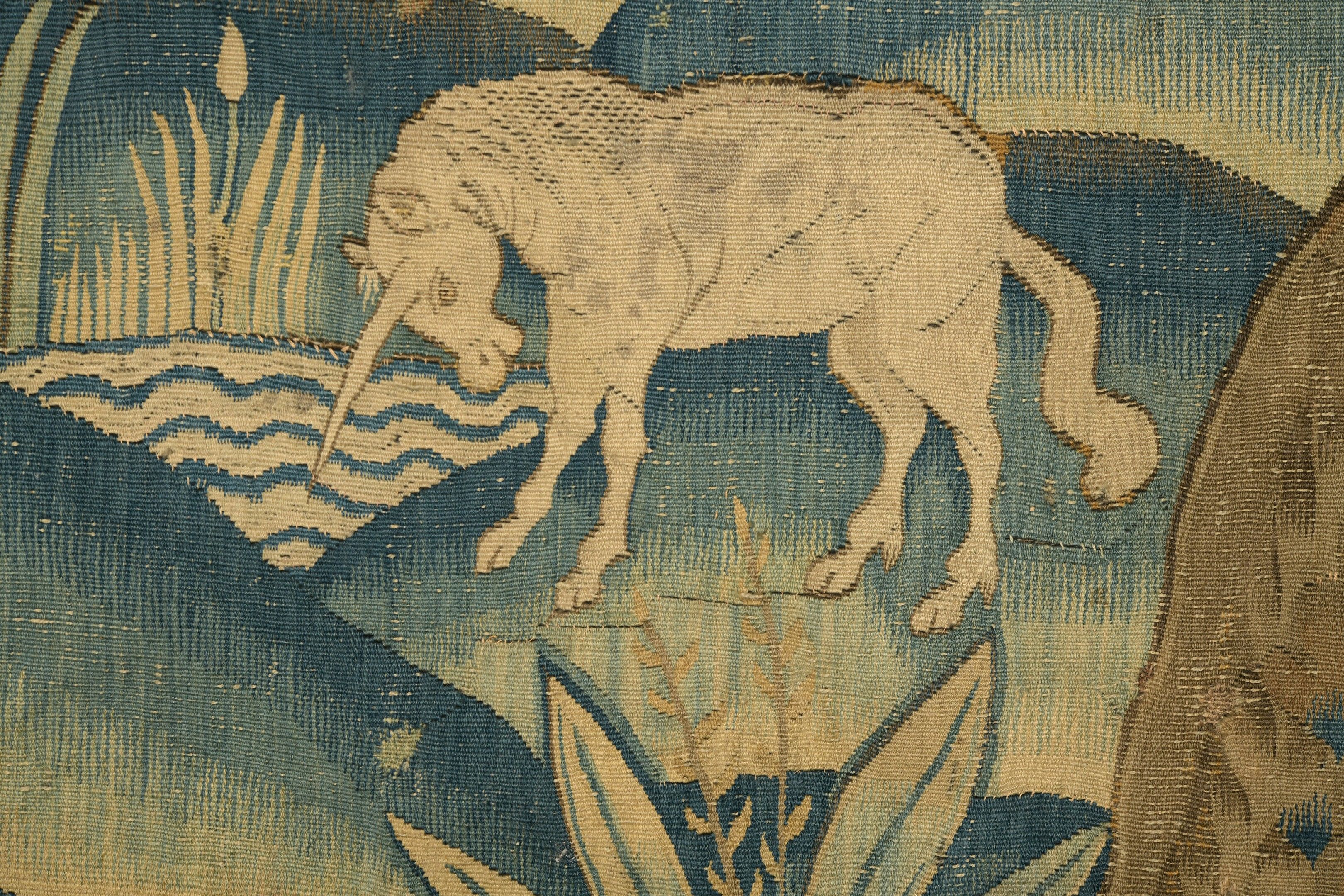 A number of animals adorn the landscape, including the unicorn, a symbol of purity.