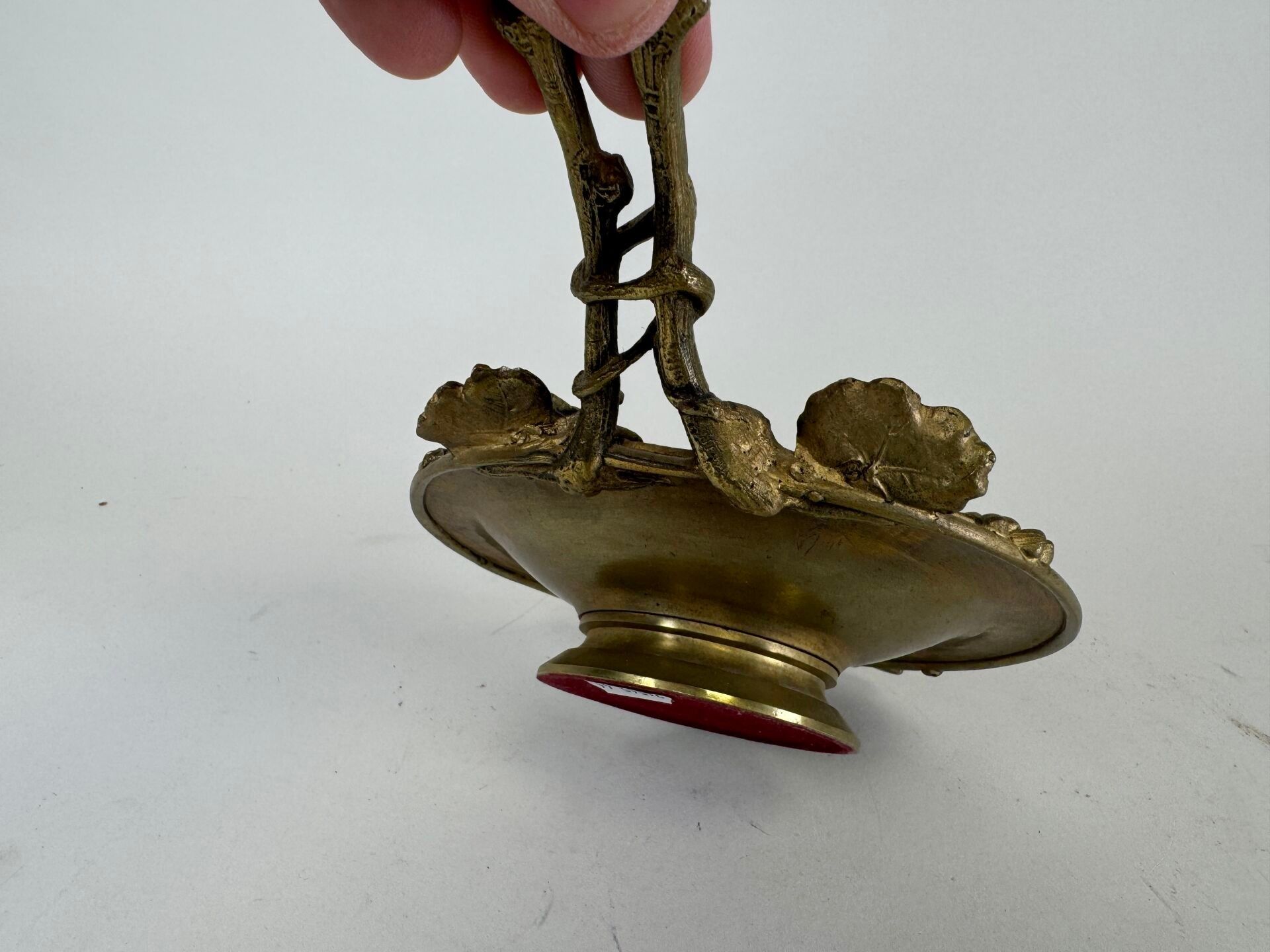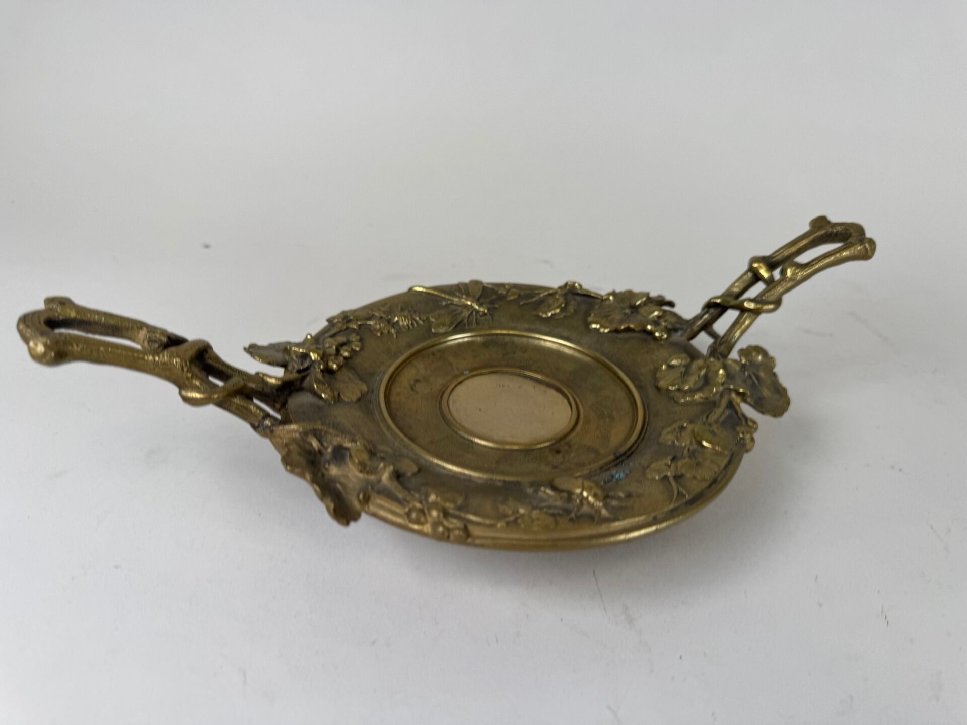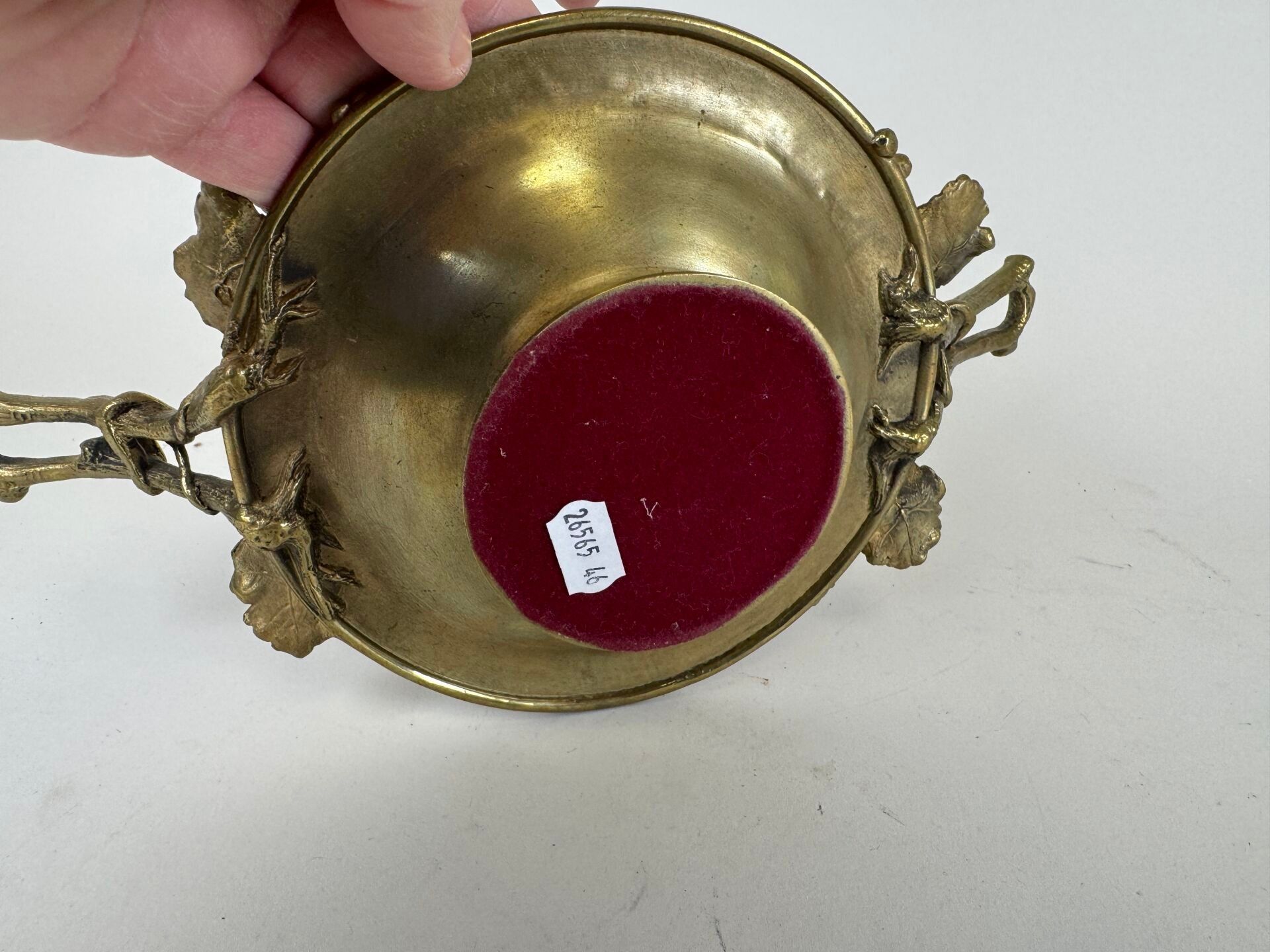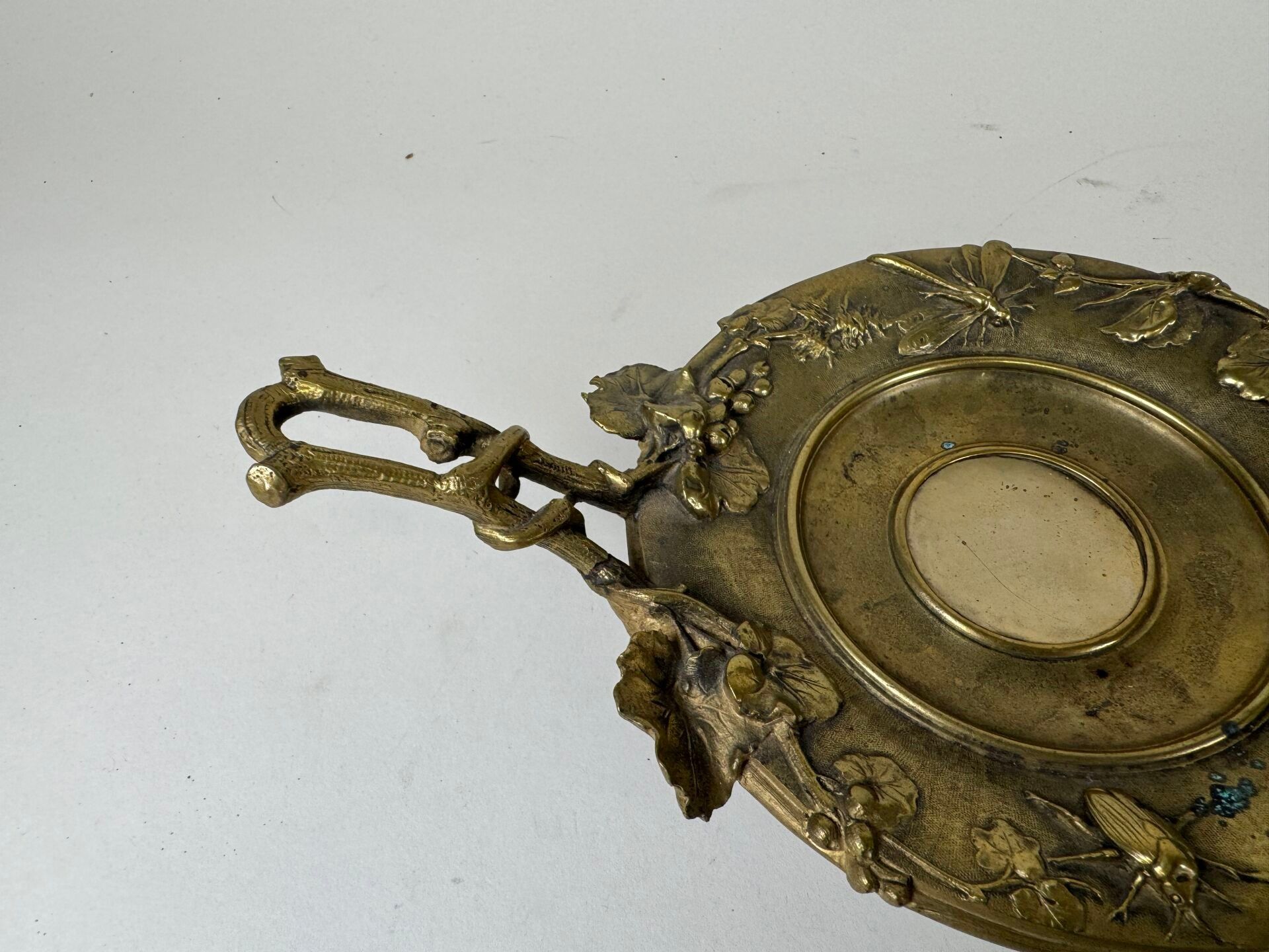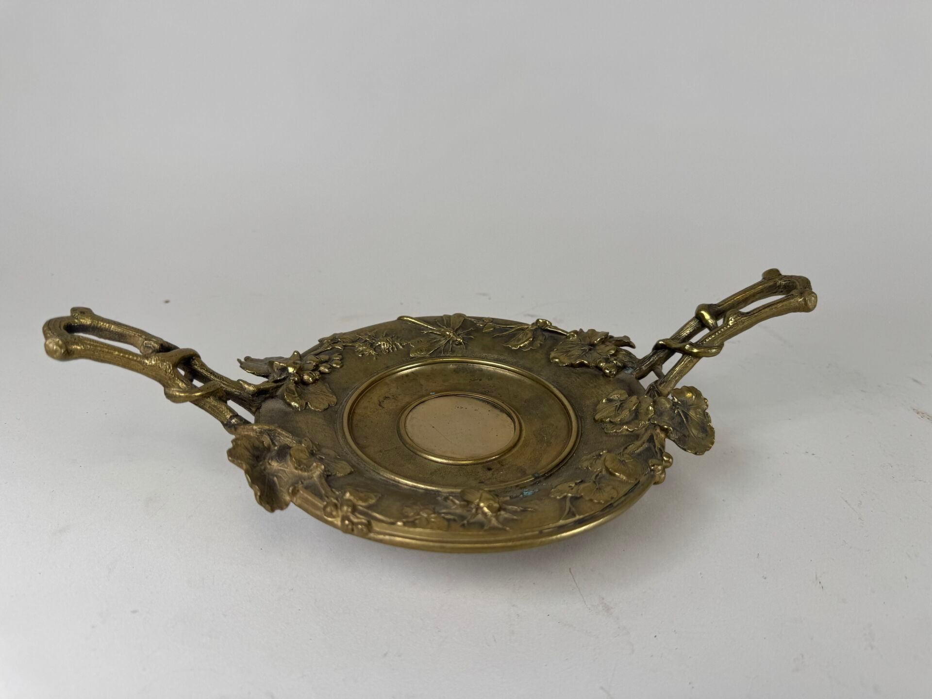 A chased ormolu bowl on a heel, decorated in relief with insects and foliage, the two openwork handles. 8 x 29.5 x 16.5 cm.