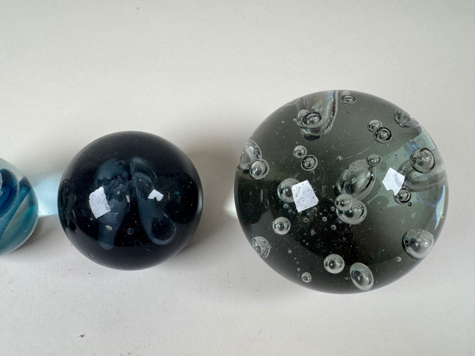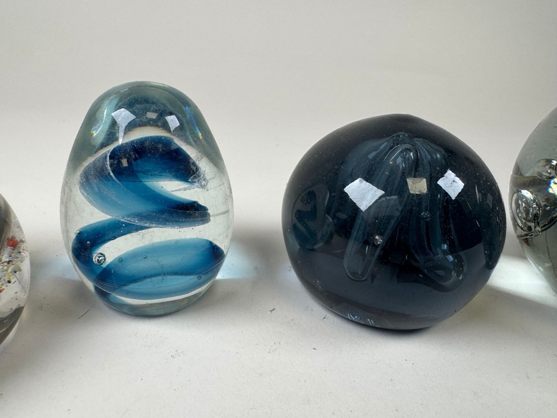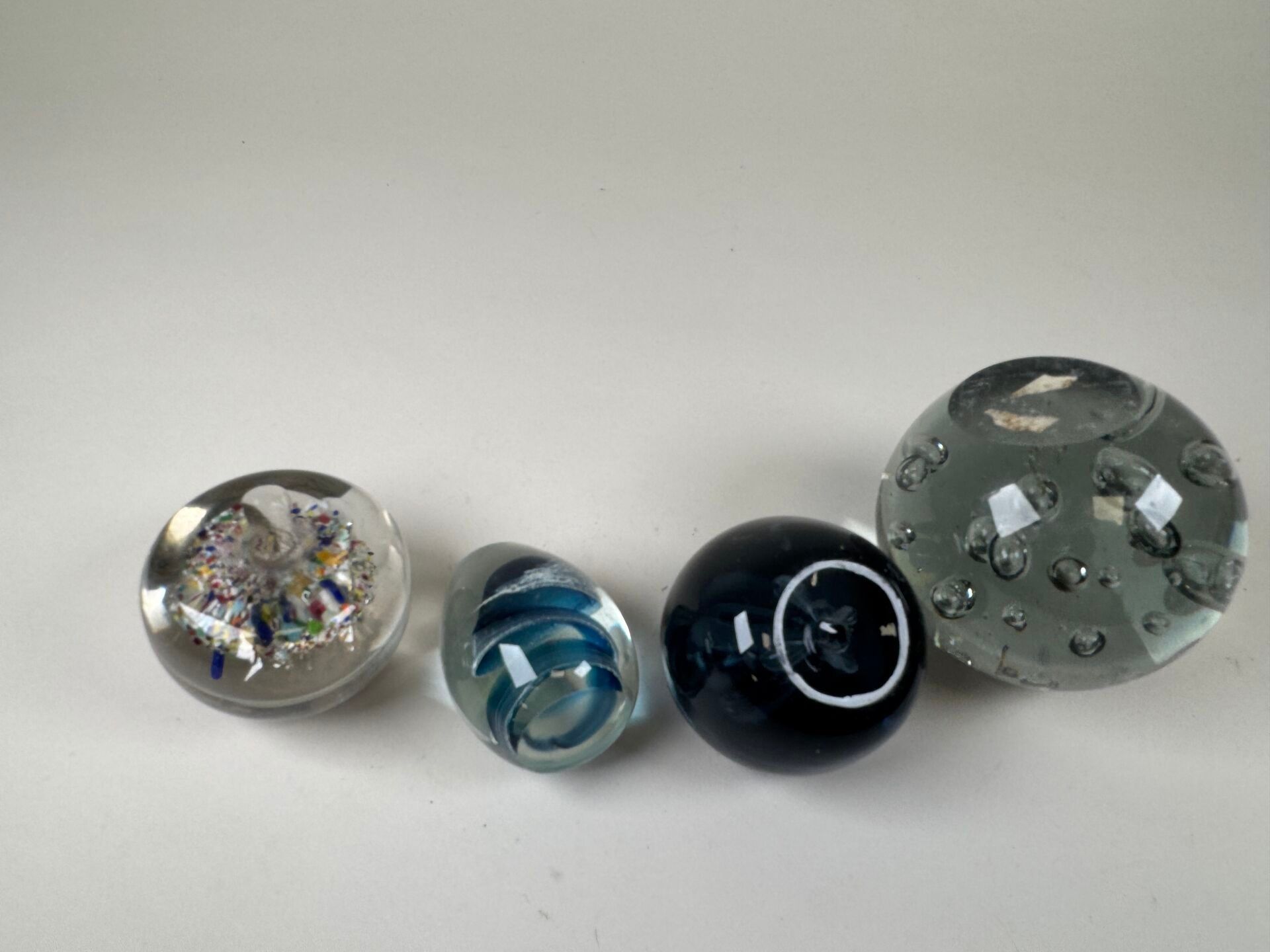 Four coloured glass paperweight sulphur balls decorated with flowers or stylised motifs, one of which is engraved.